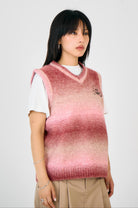 Pink spacedye oversized knitted vest with embroidered skull logo at chest.