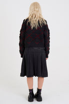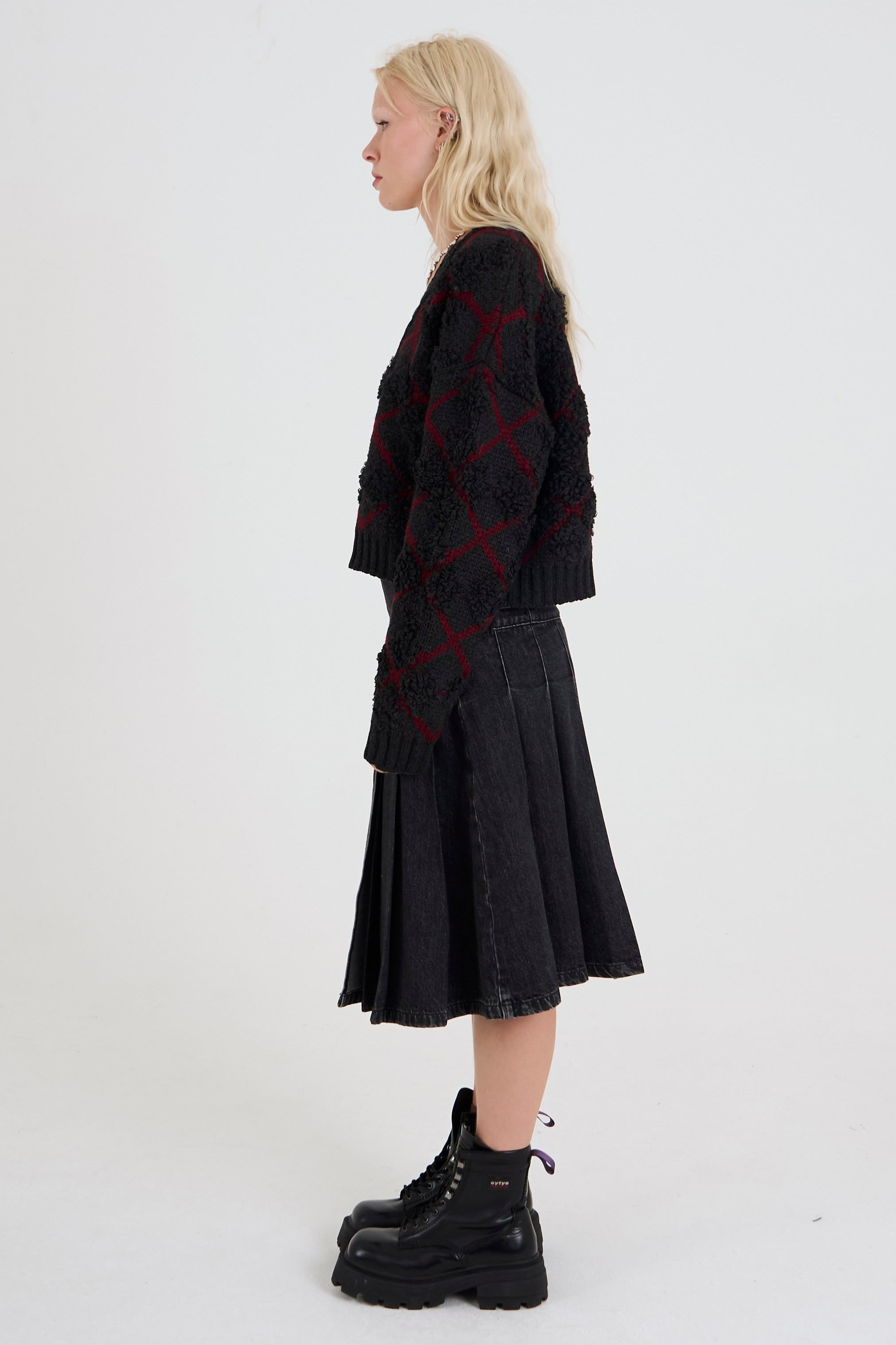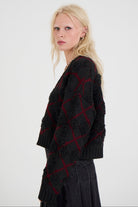 Grey and burgundy argyle check cardigan in a textured loop knit. Featuring a v-neck and a slightly cropped fit for a classic cardigan with a grunge edge.