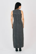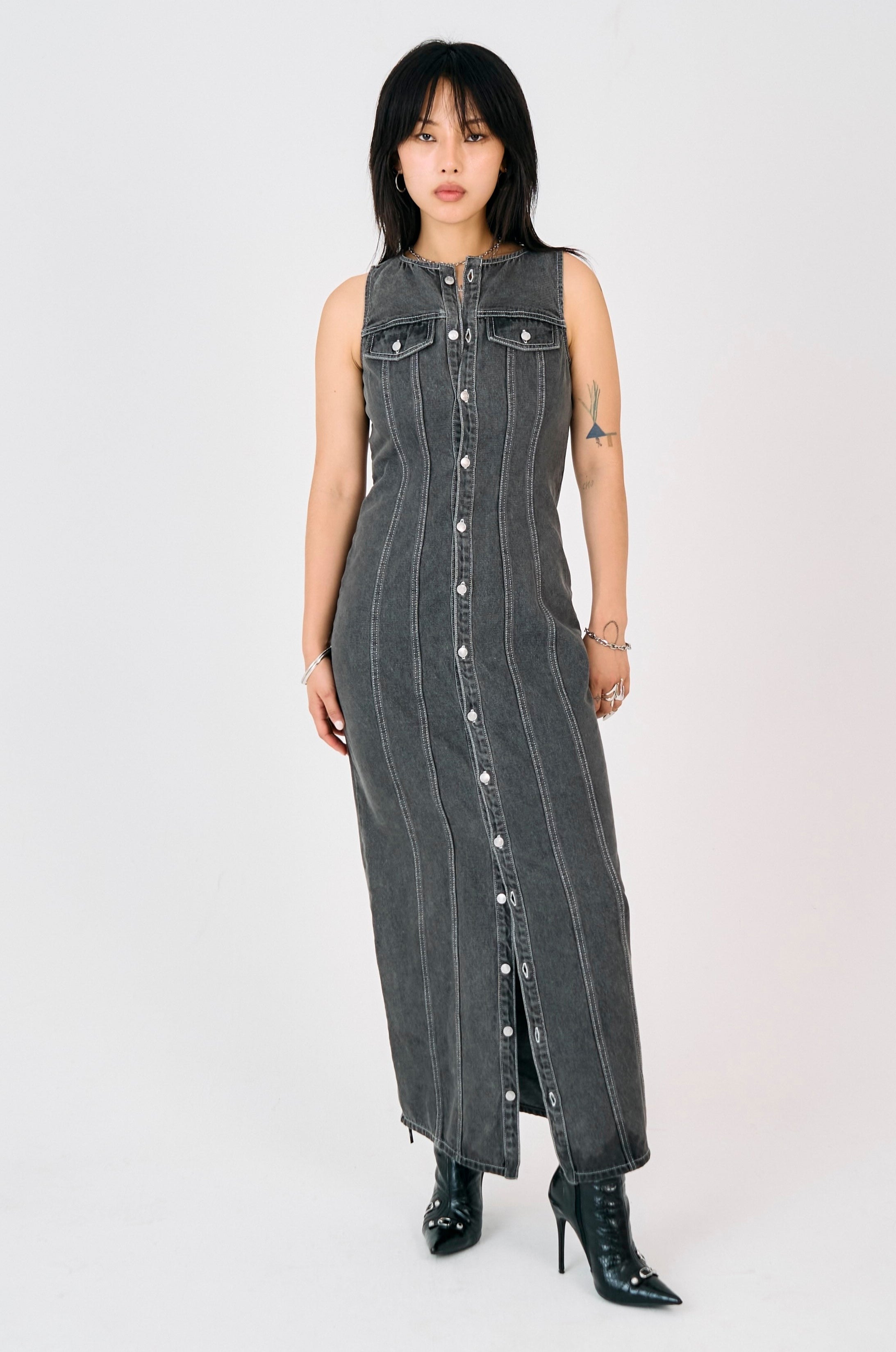 Grey rinse denim maxi dress with a panelled seam detail and button through front. Heavyweight structured denim in maxi length.