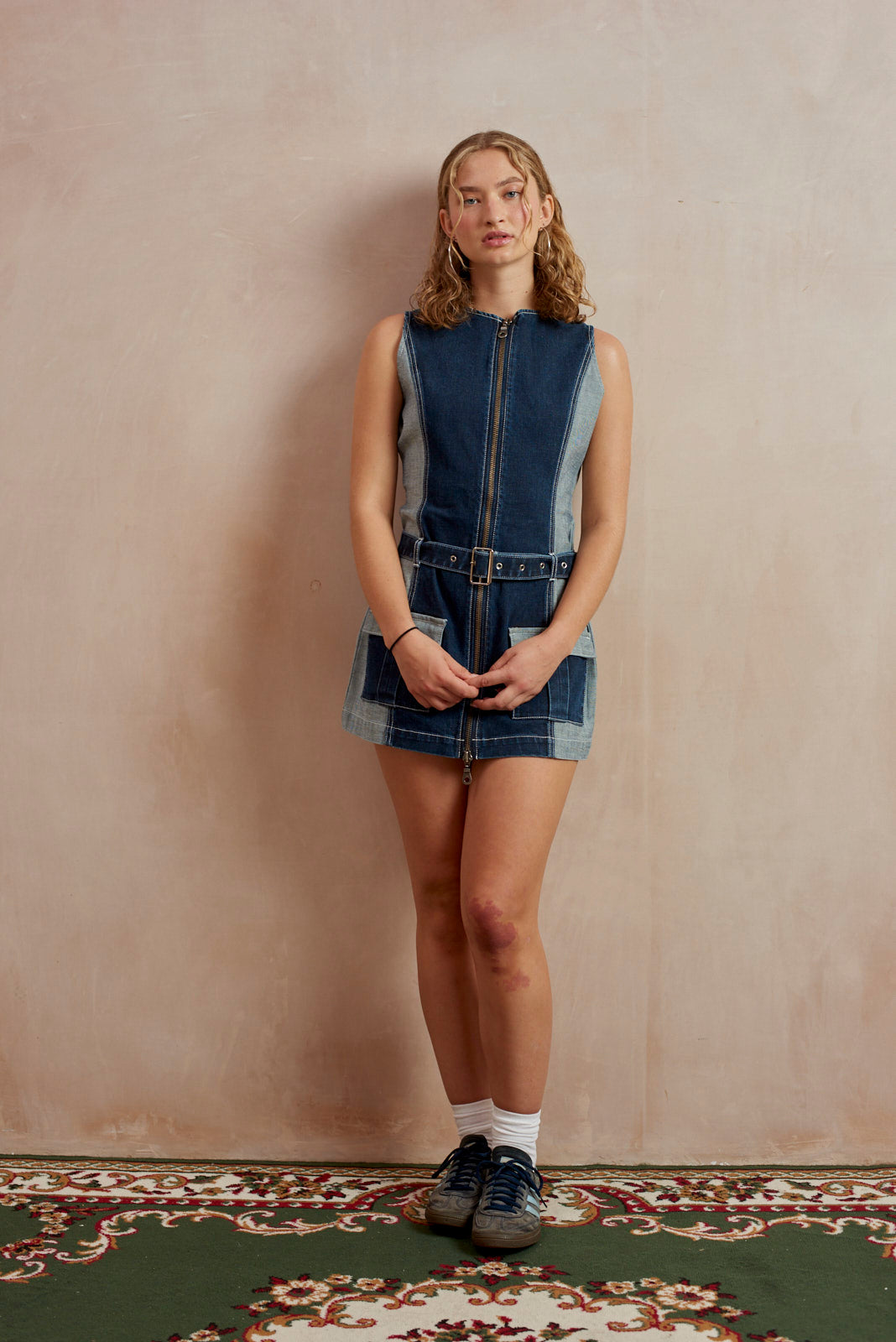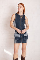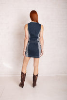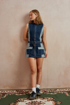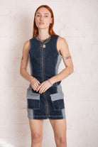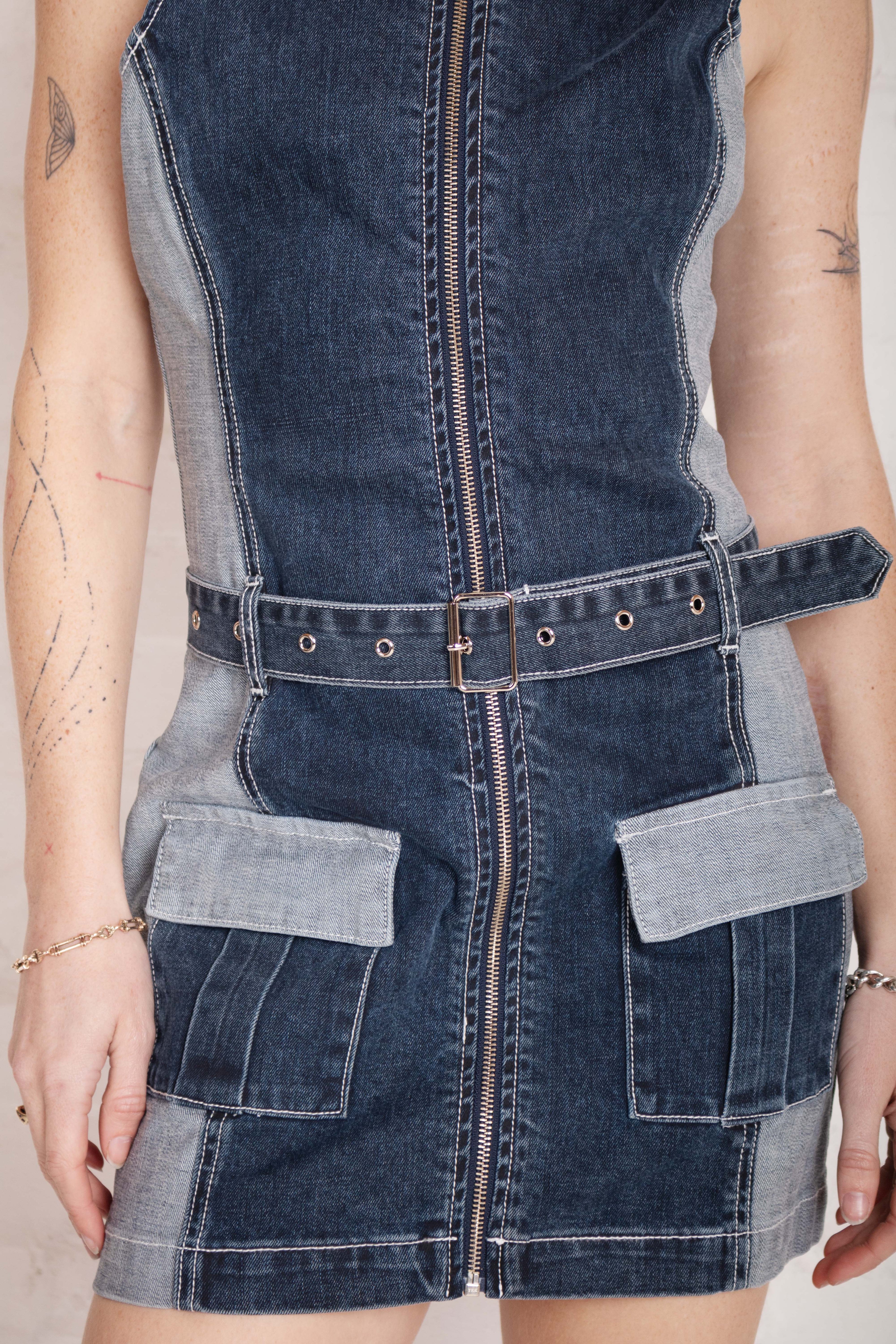 Denim mini shift dress in mid blue denim with contrast side panels and pockets. Featuring an eyelet detail belt