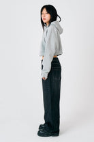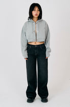 Grey marl cropped hoodie with silver hardware buckle fastening. Made from heavyweight soft jersey with a boxy fit and dropped shoulders.