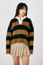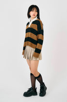 Black and brown striped rugby knit with contrast collar, embroidered Ragged logo, and bold “07” intarsia on the back.