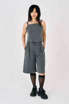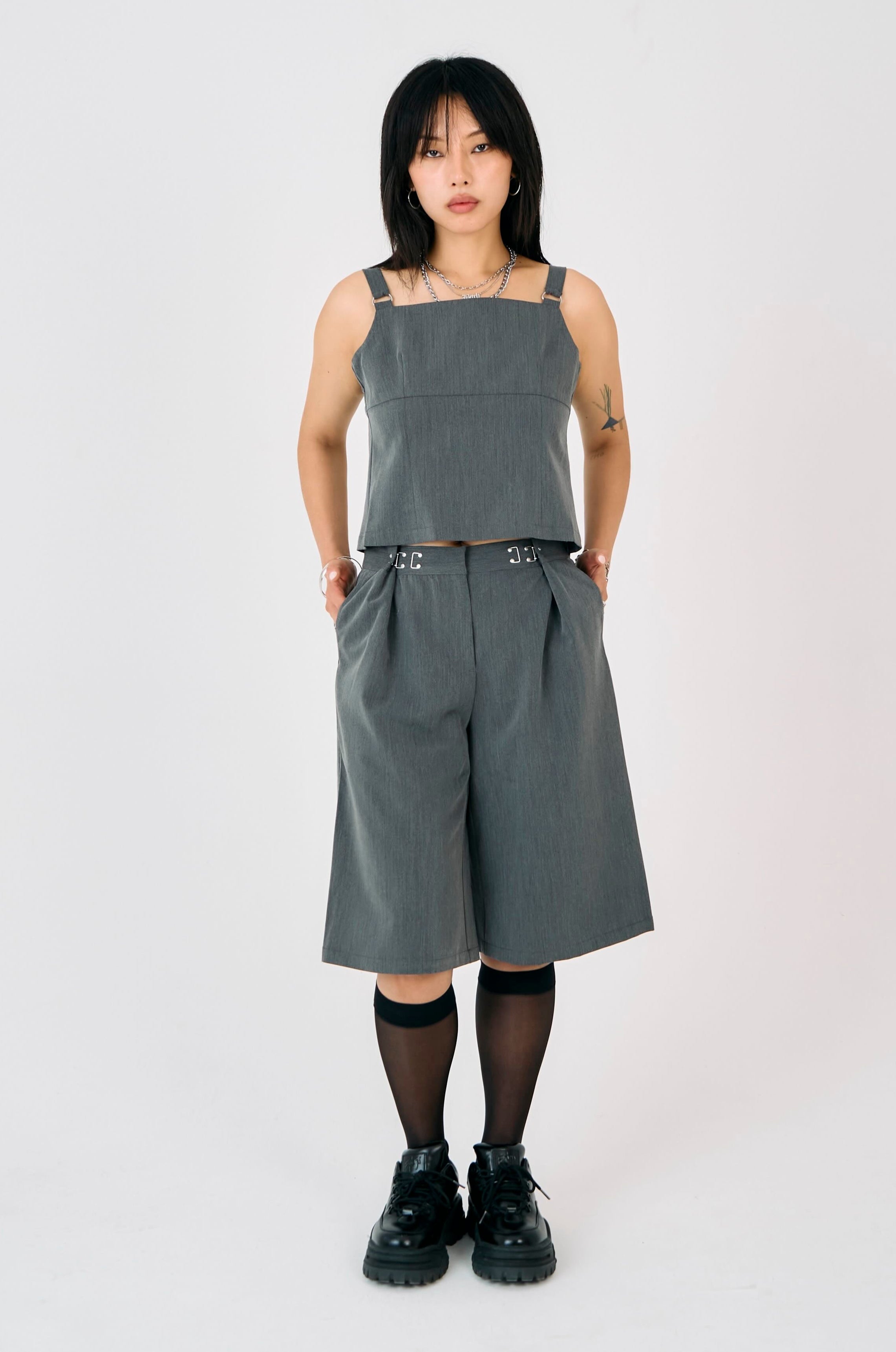 Grey tailored city shorts cut to a wide, structured silhouette. Silver piercing clasp finish and sharp pleats give a clean finish with a grunge edge.
