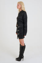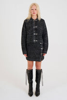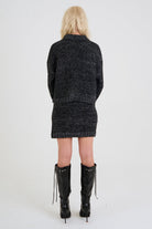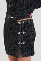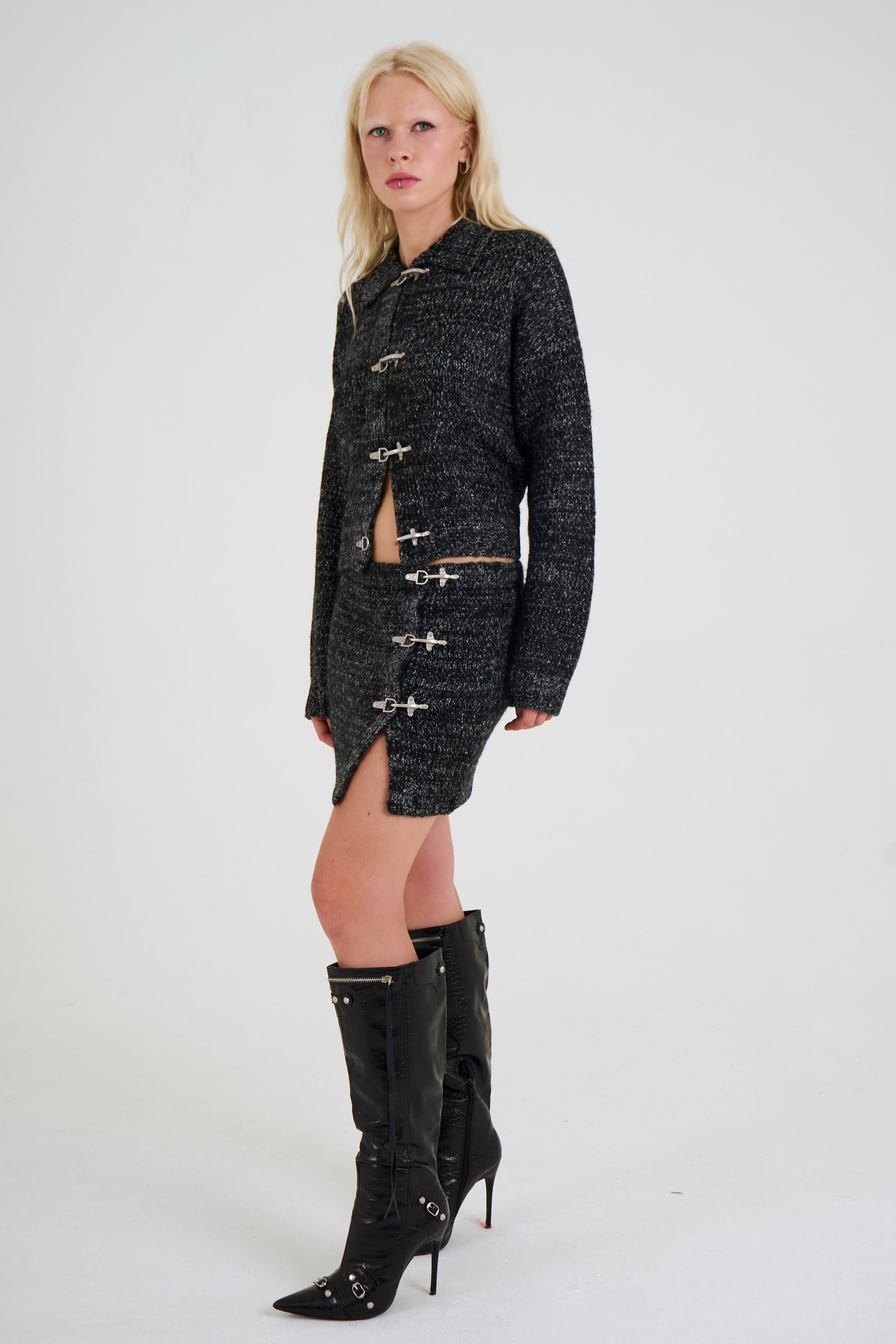 Dark grey spacedye knit mini skirt with side split and buckle clasp detail.