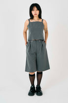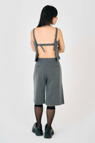 Grey tailored cami top with a clean square neckline and D-ring back straps. Sleek front, open at the back - a sharp take on modern grunge.