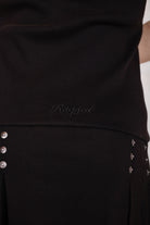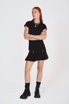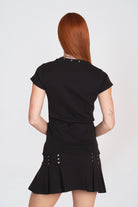 Acid wash black mini dress with drop waist pleated skirt and rivet stud detail