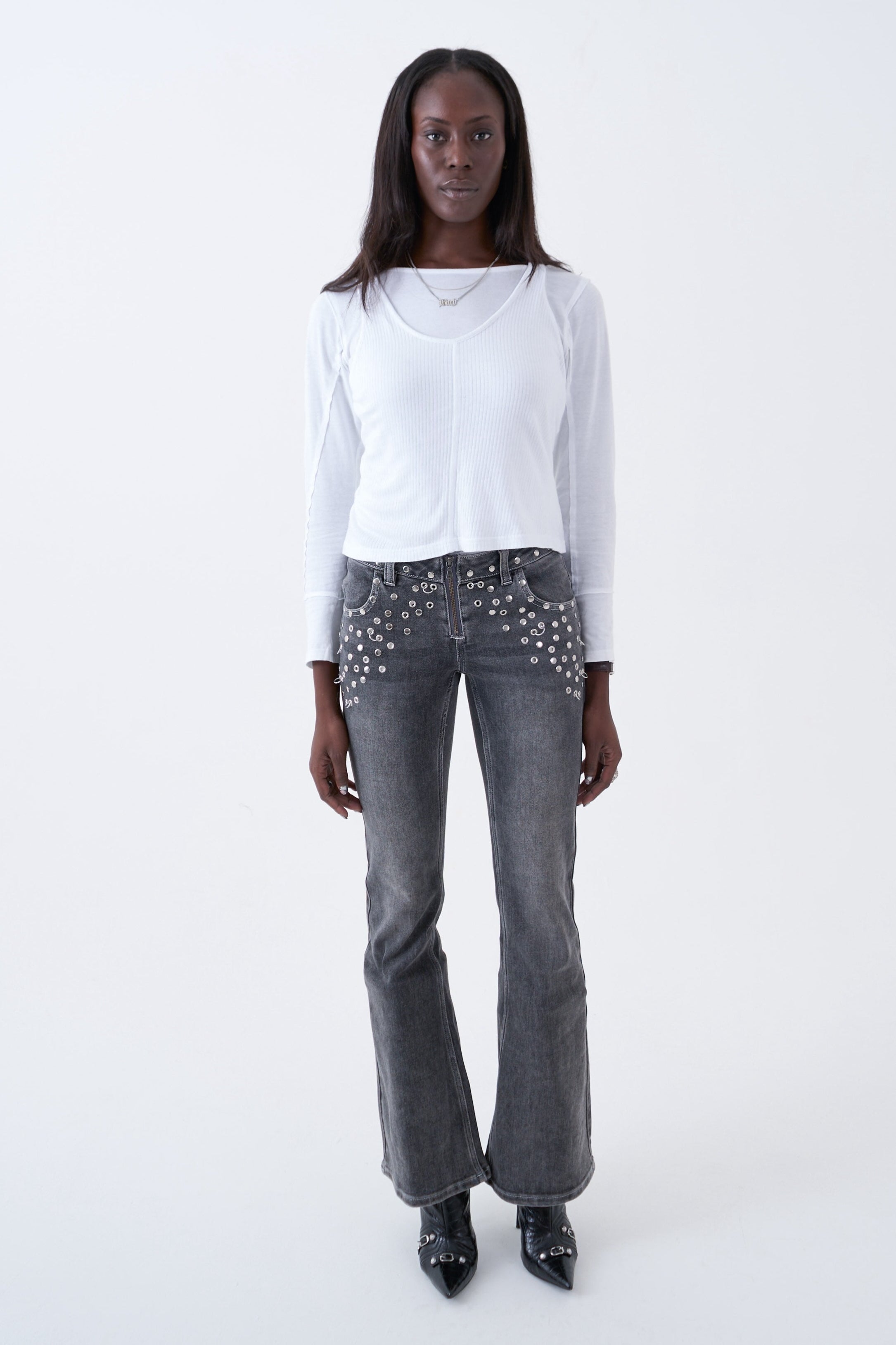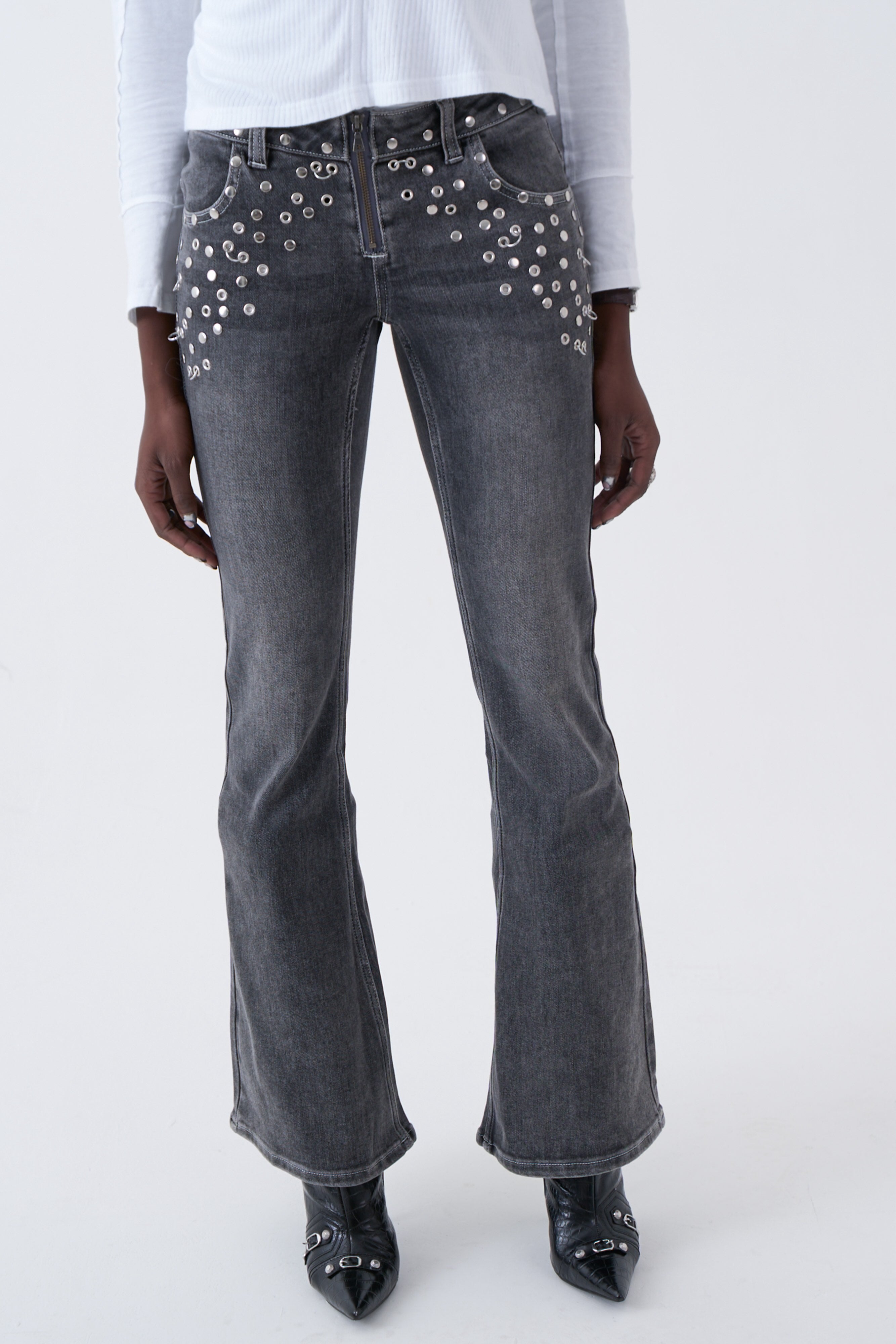Washed grey bootcut flare jeans with exposed front zip and silver stud and piercing hardware. Designed in a vintage-inspired cut with a worn-in finish for a super flattering fit with a grunge edge.
