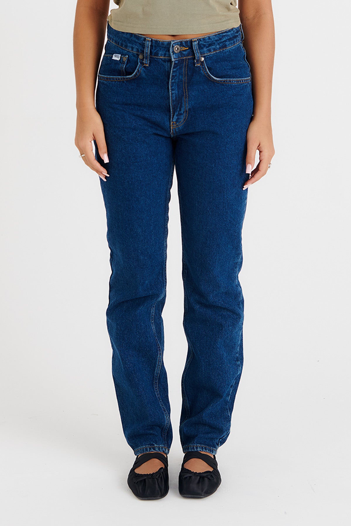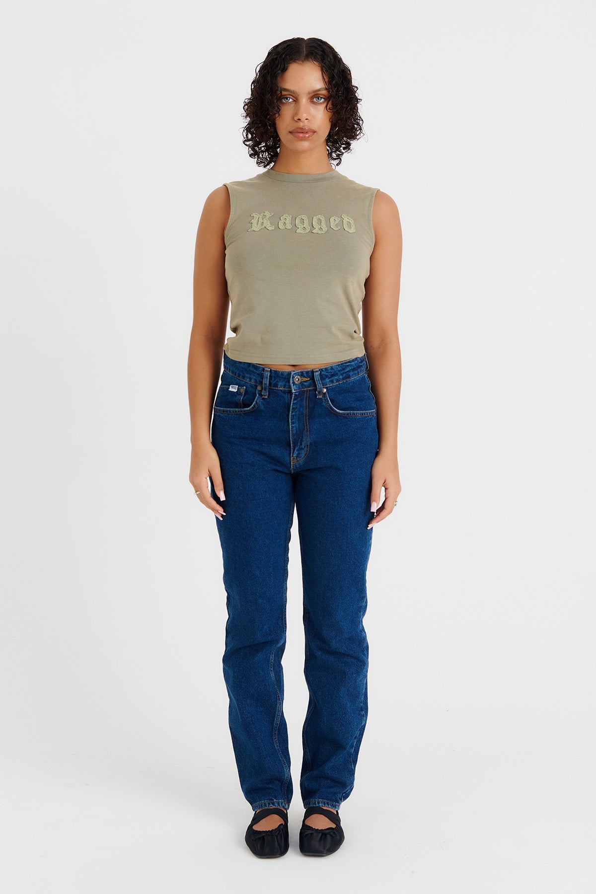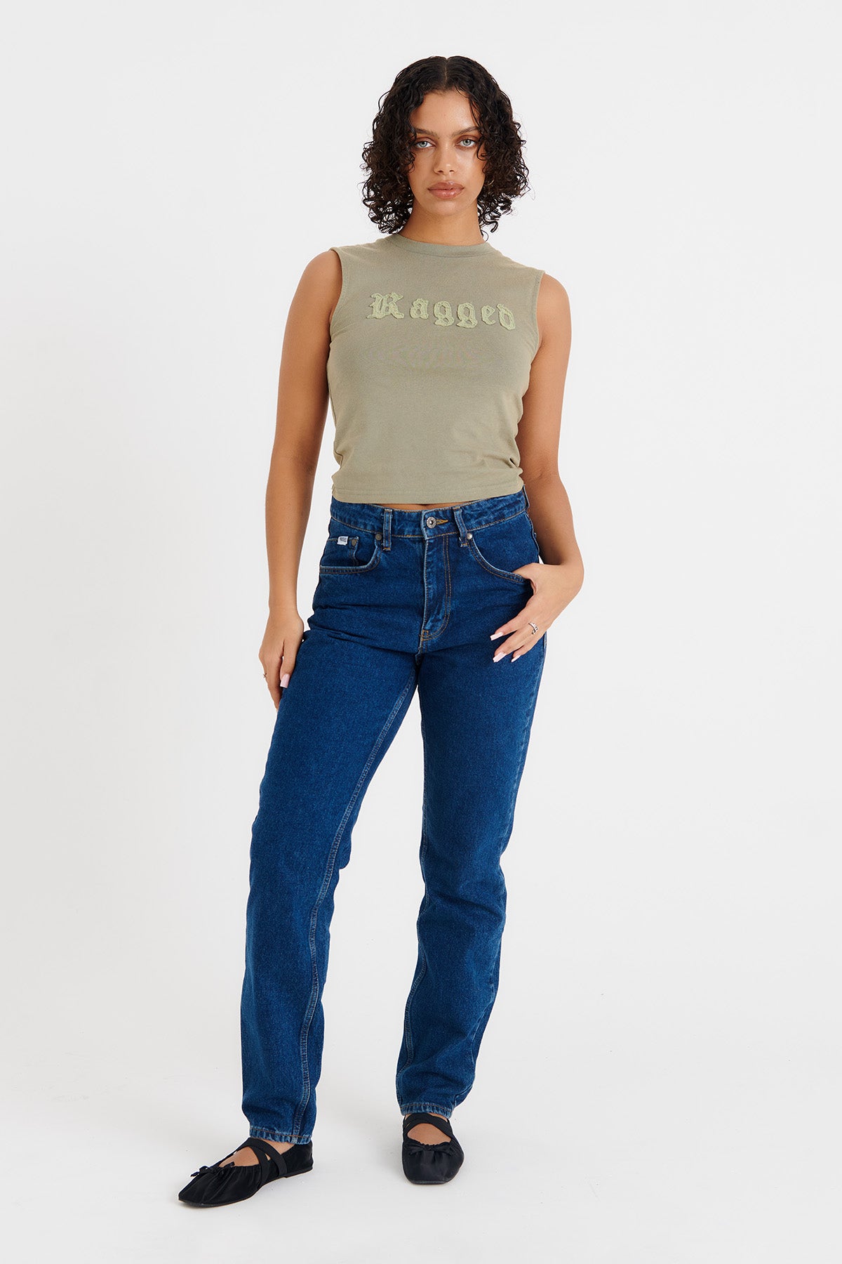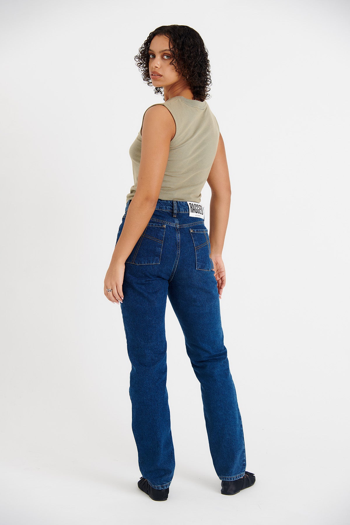 The Ragged Priest signature Cougar Mom Jean fit in our dark blue indigo denim with classic "Ragged Jeans" vegan belt loop back tab.
