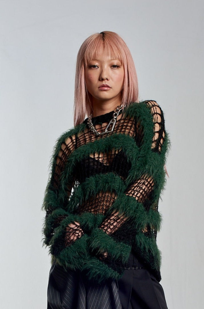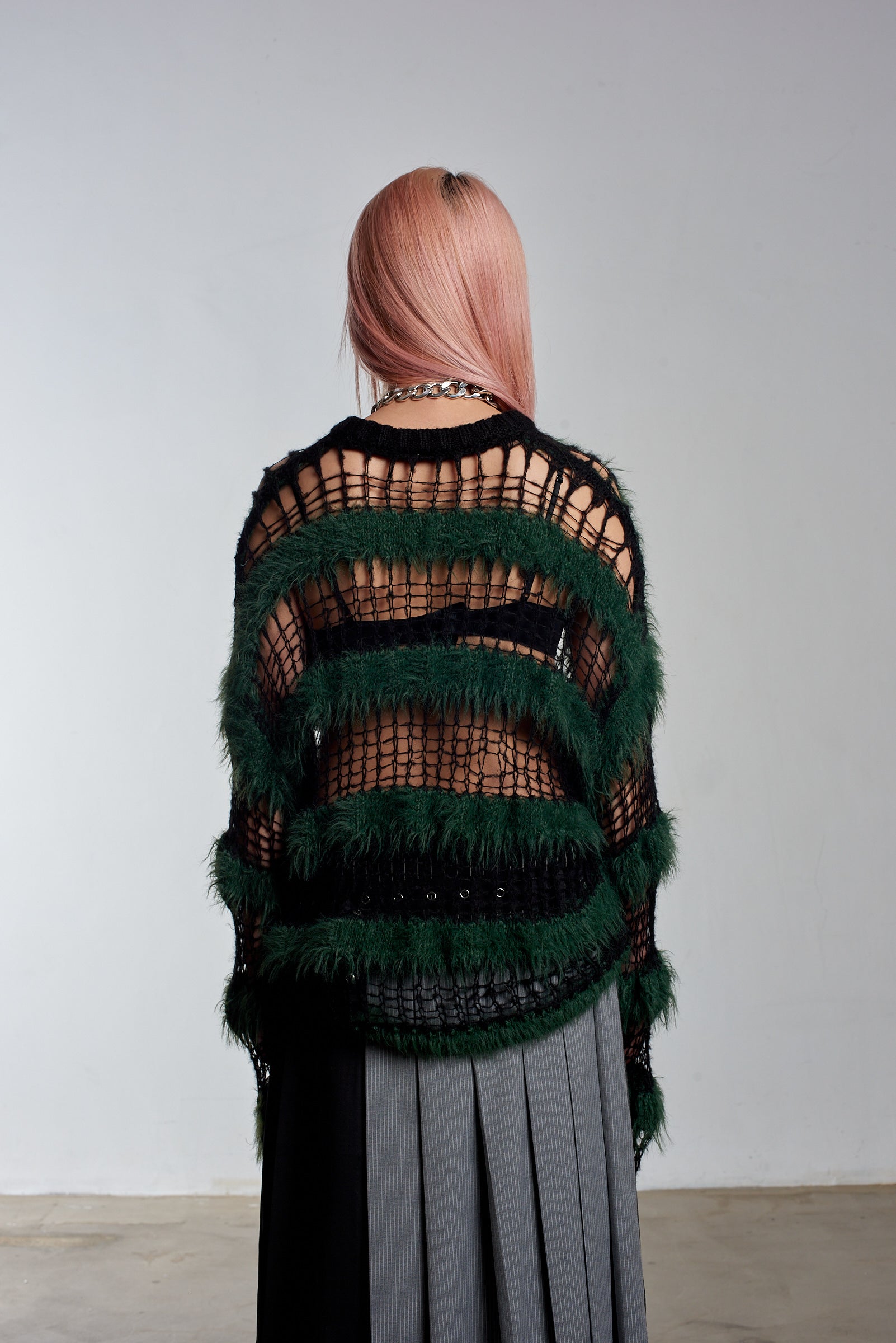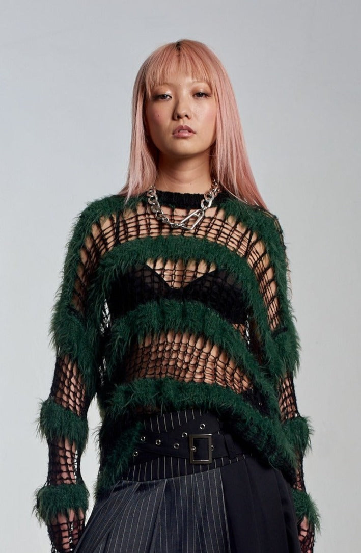 Transcend Collection: Dark green and black striped jumper with soft eyelash knit and open ladder knit