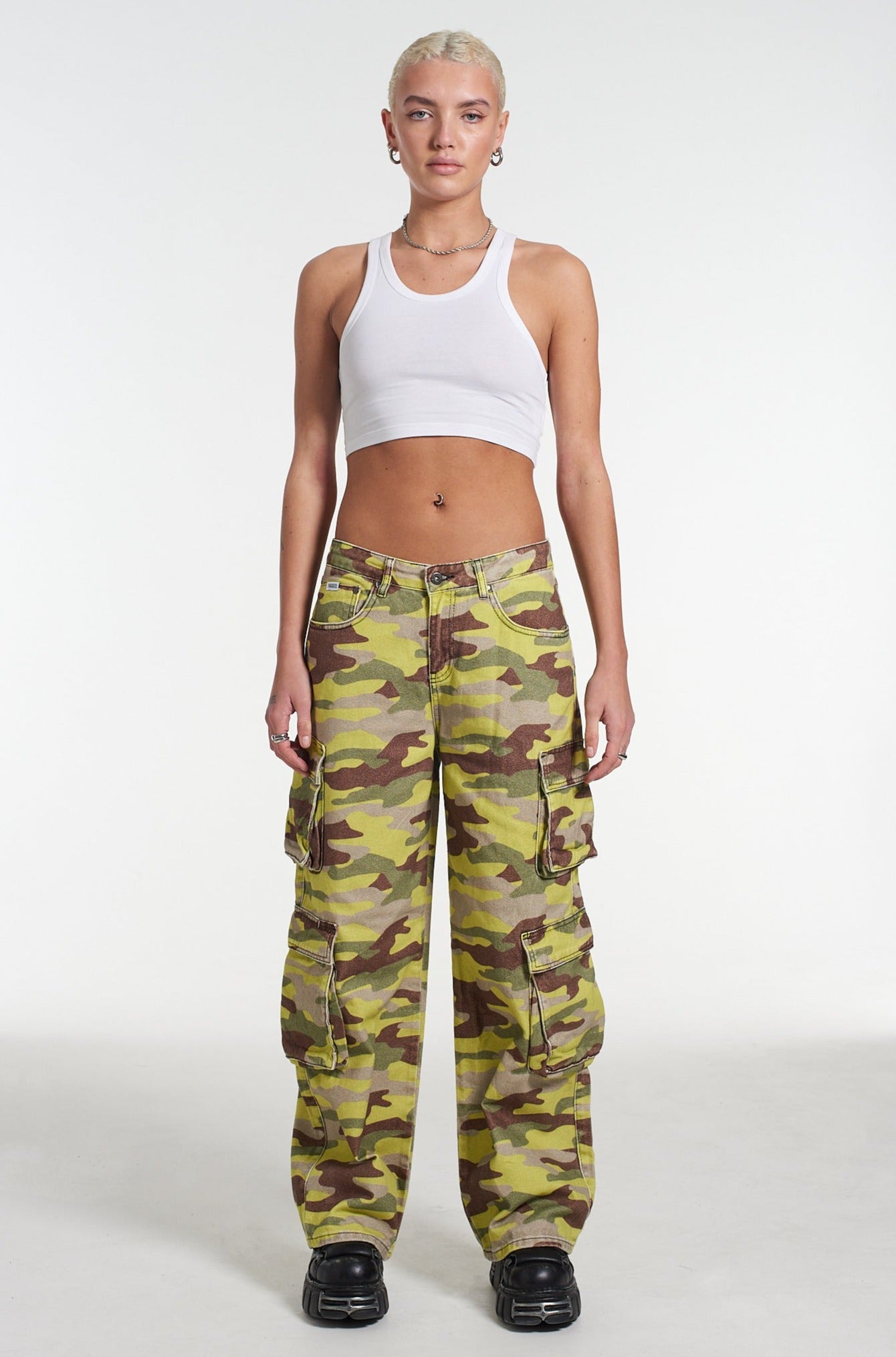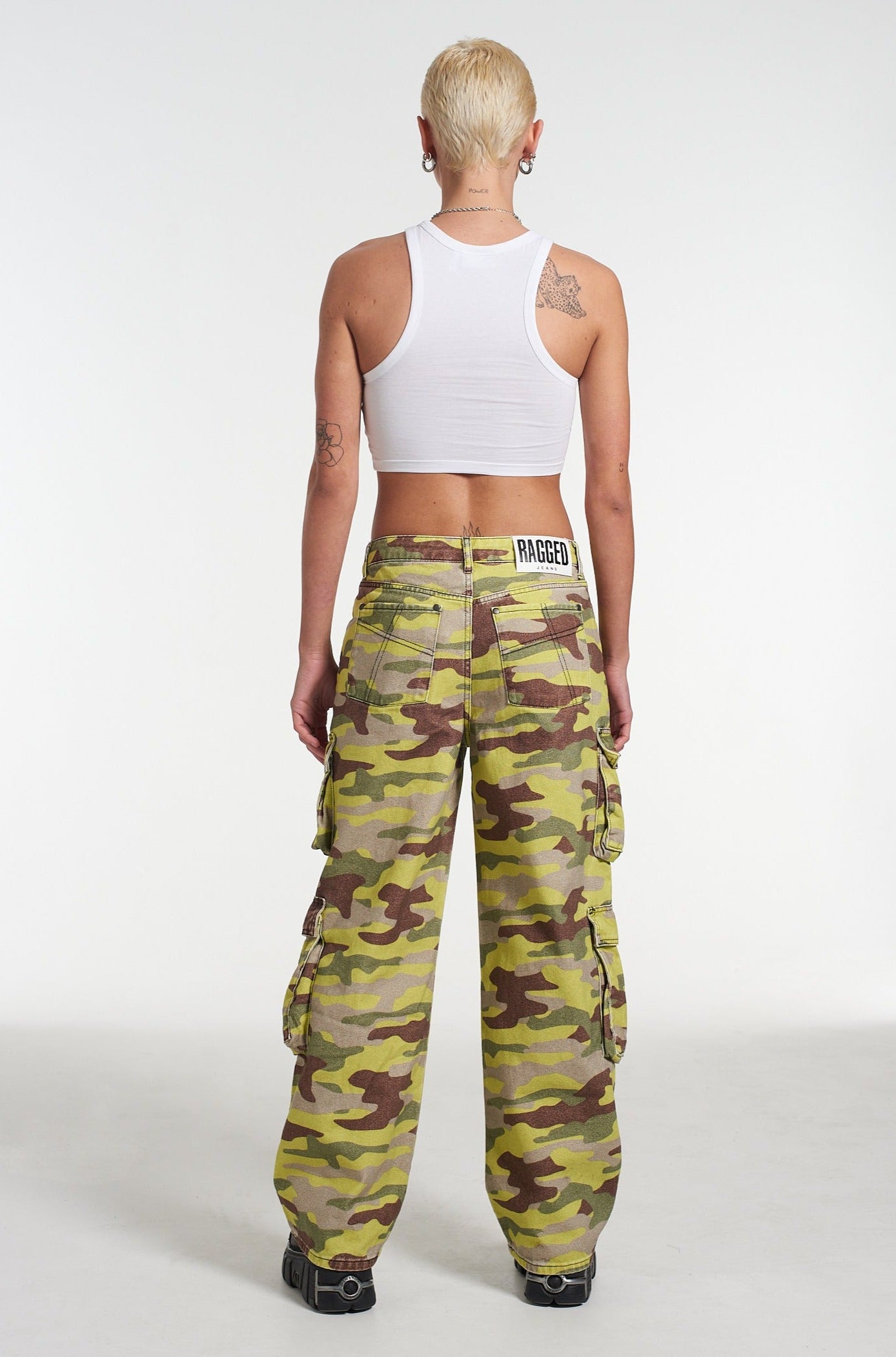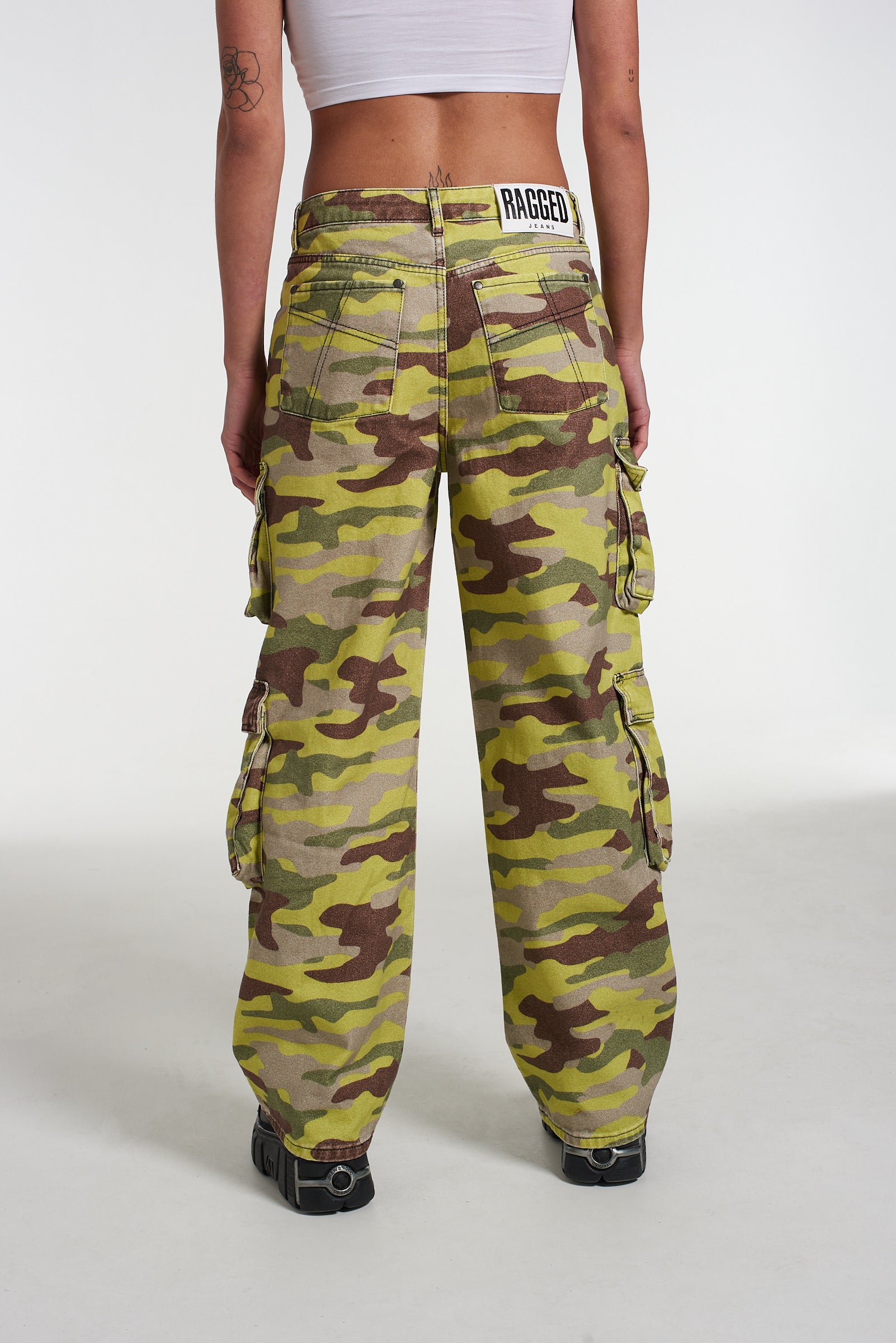 The Ragged Priest signature Release Jean fit in our new neon camouflage printed denim with classic "Ragged Jeans" belt loop back tab.