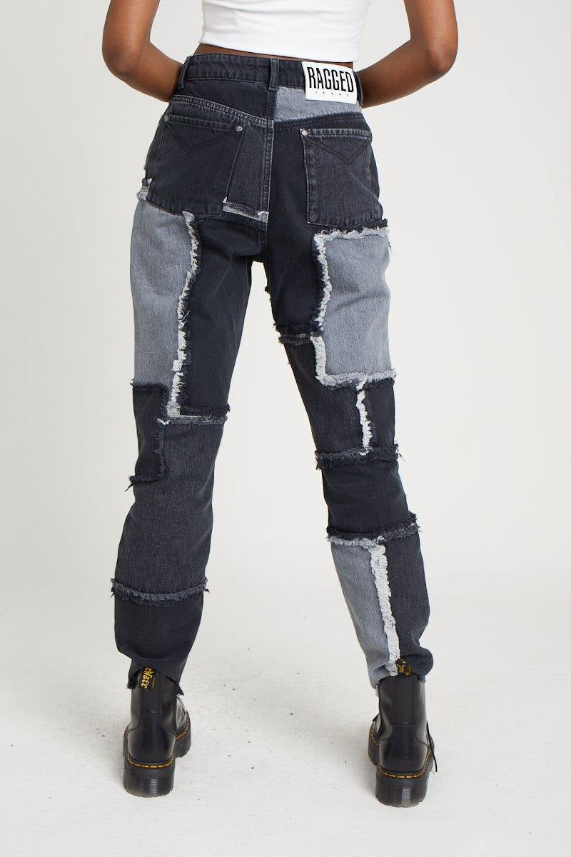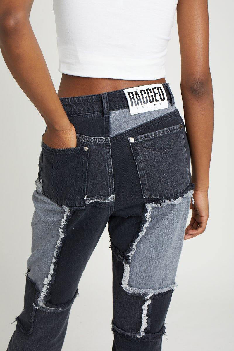 Ragged Jeans mixed charcoal patchwork jeans. Featuring light and dark charcoal denim with light frayed detailing and “RAGGED Jeans” belt loop tab.