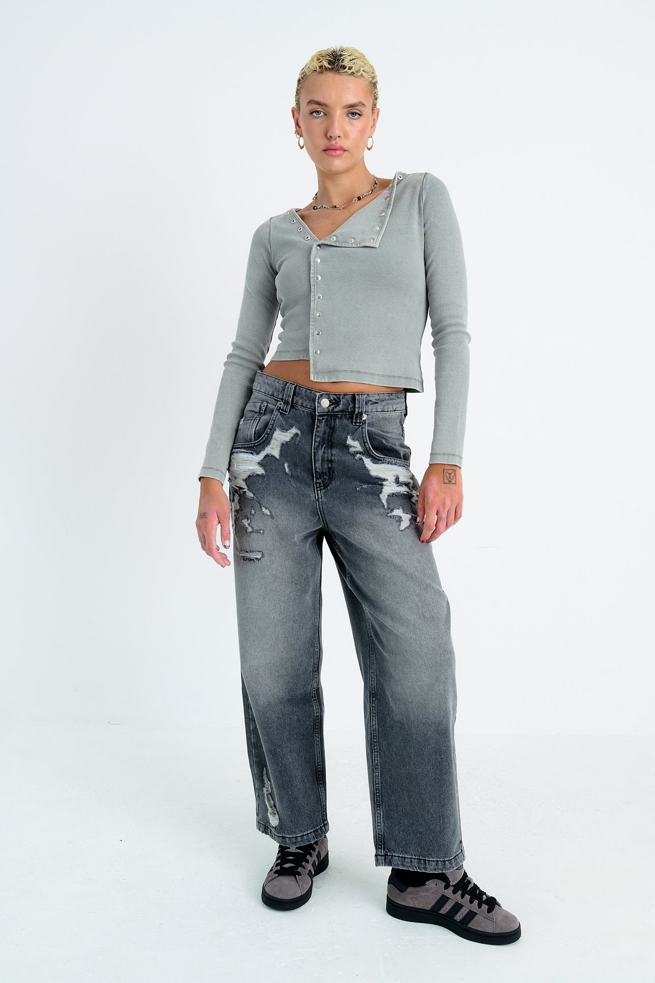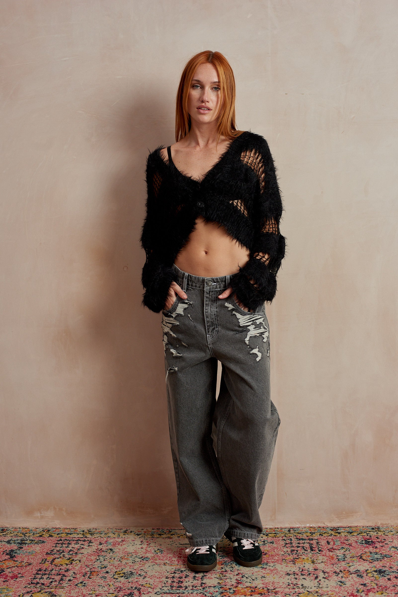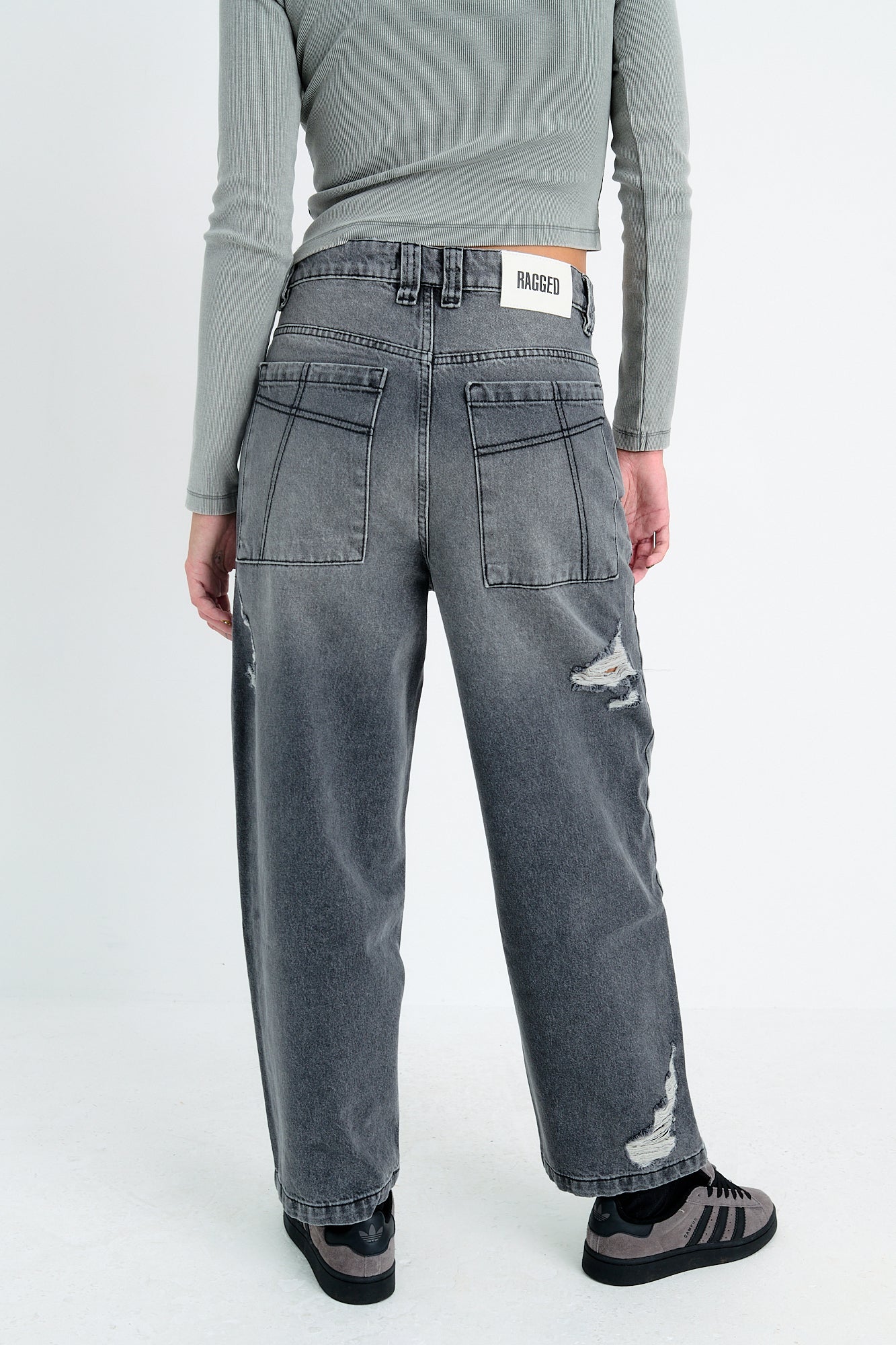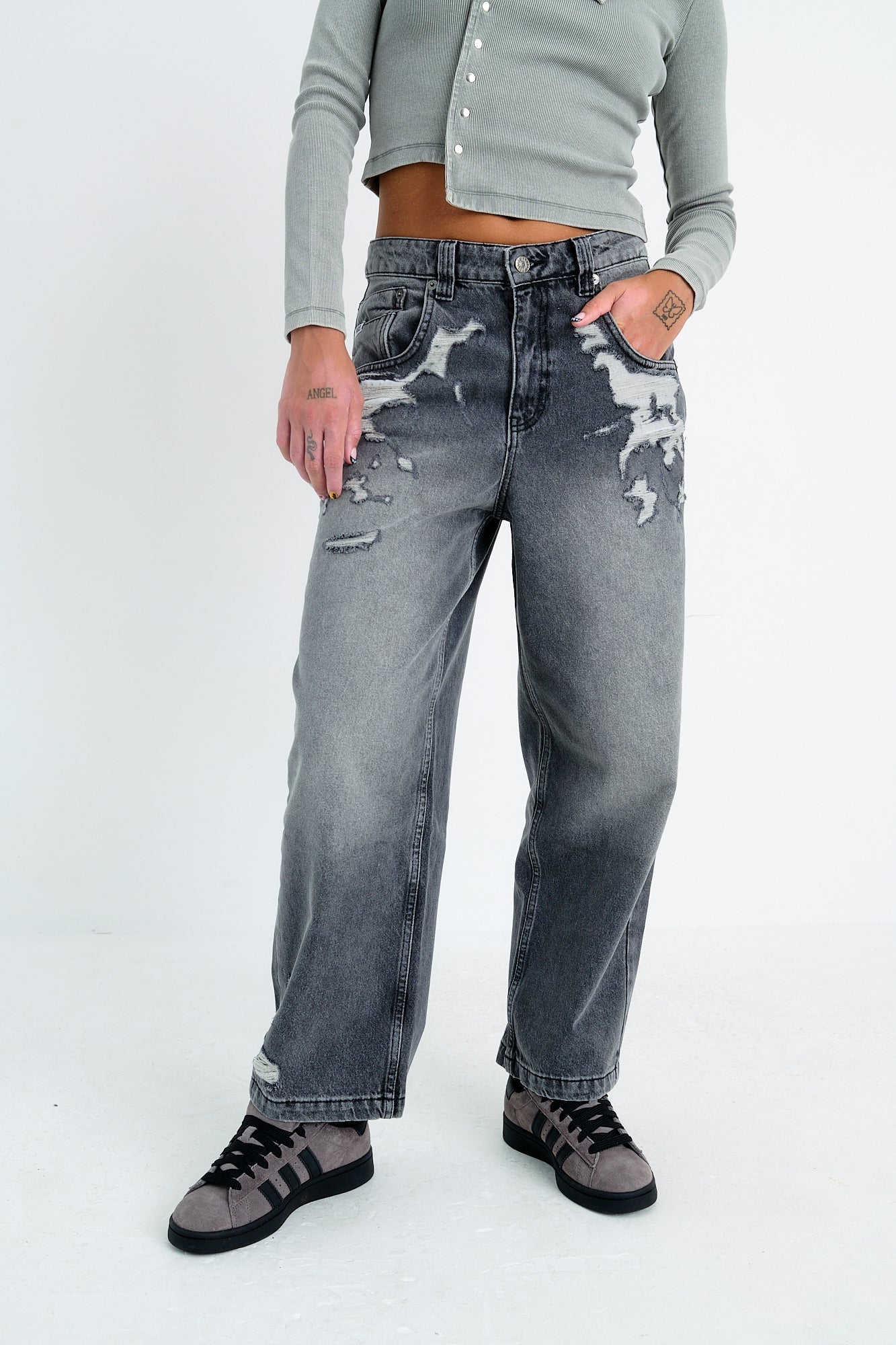 Relaxed straight leg mid rise jeans in washed grey with extreme shredding and distressed detail