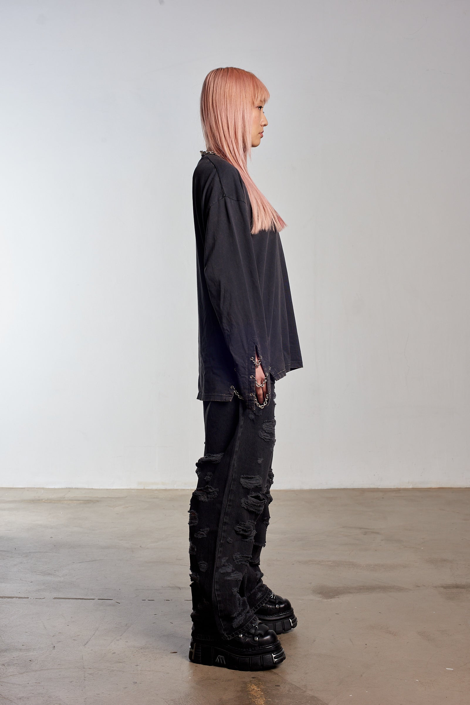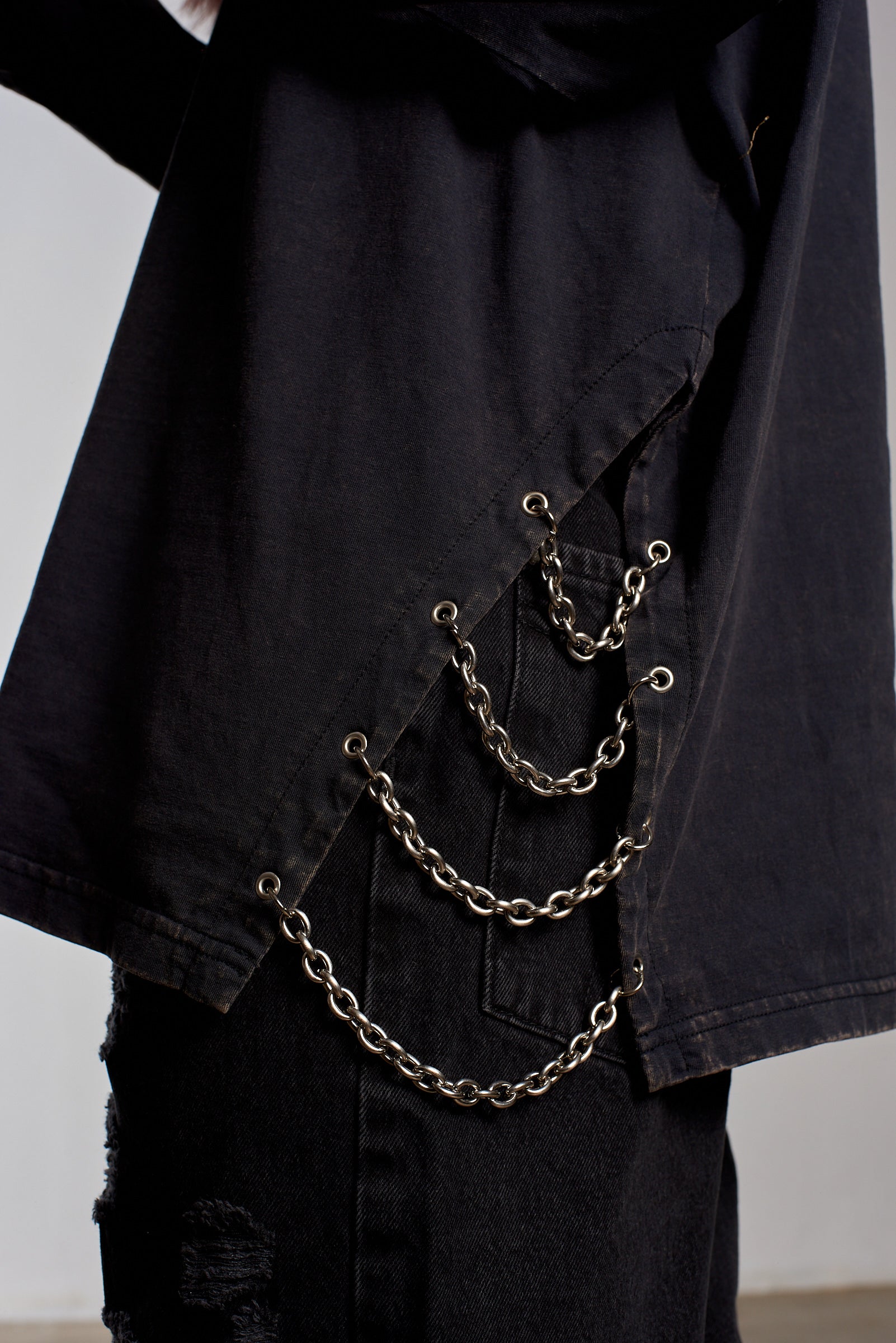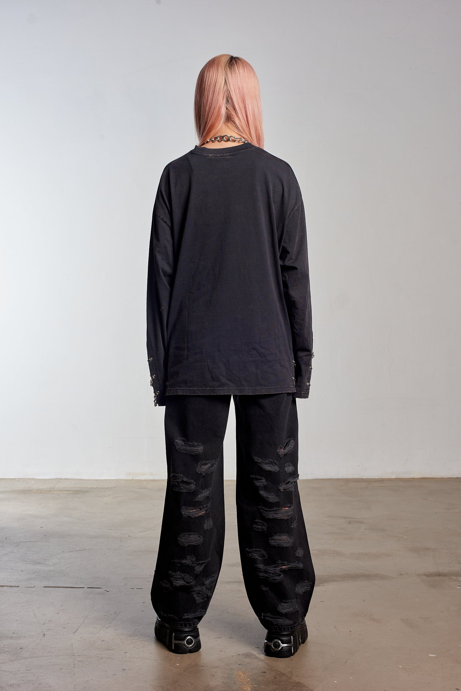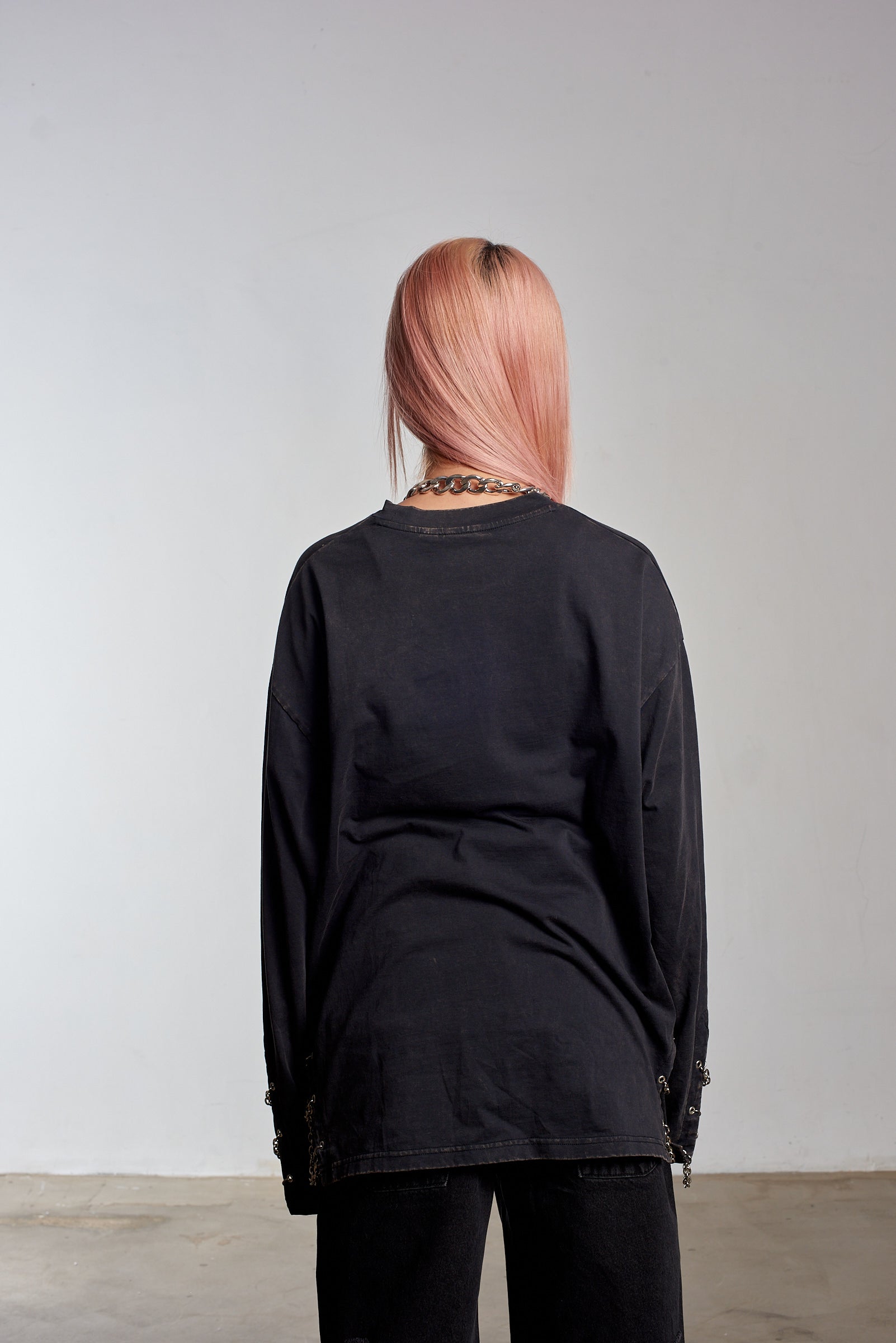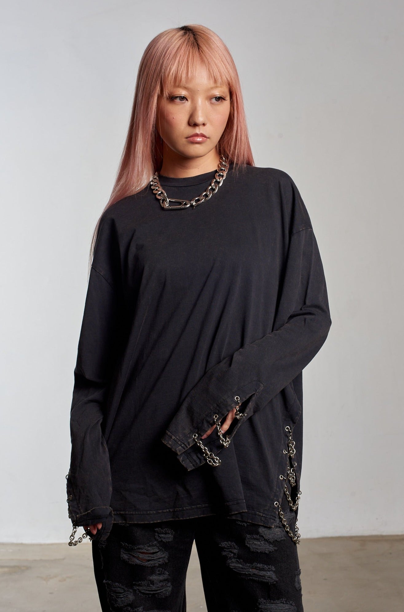 Charcoal oversized long sleeve tee with an acid wash. Features punk-inspired chain trim.
