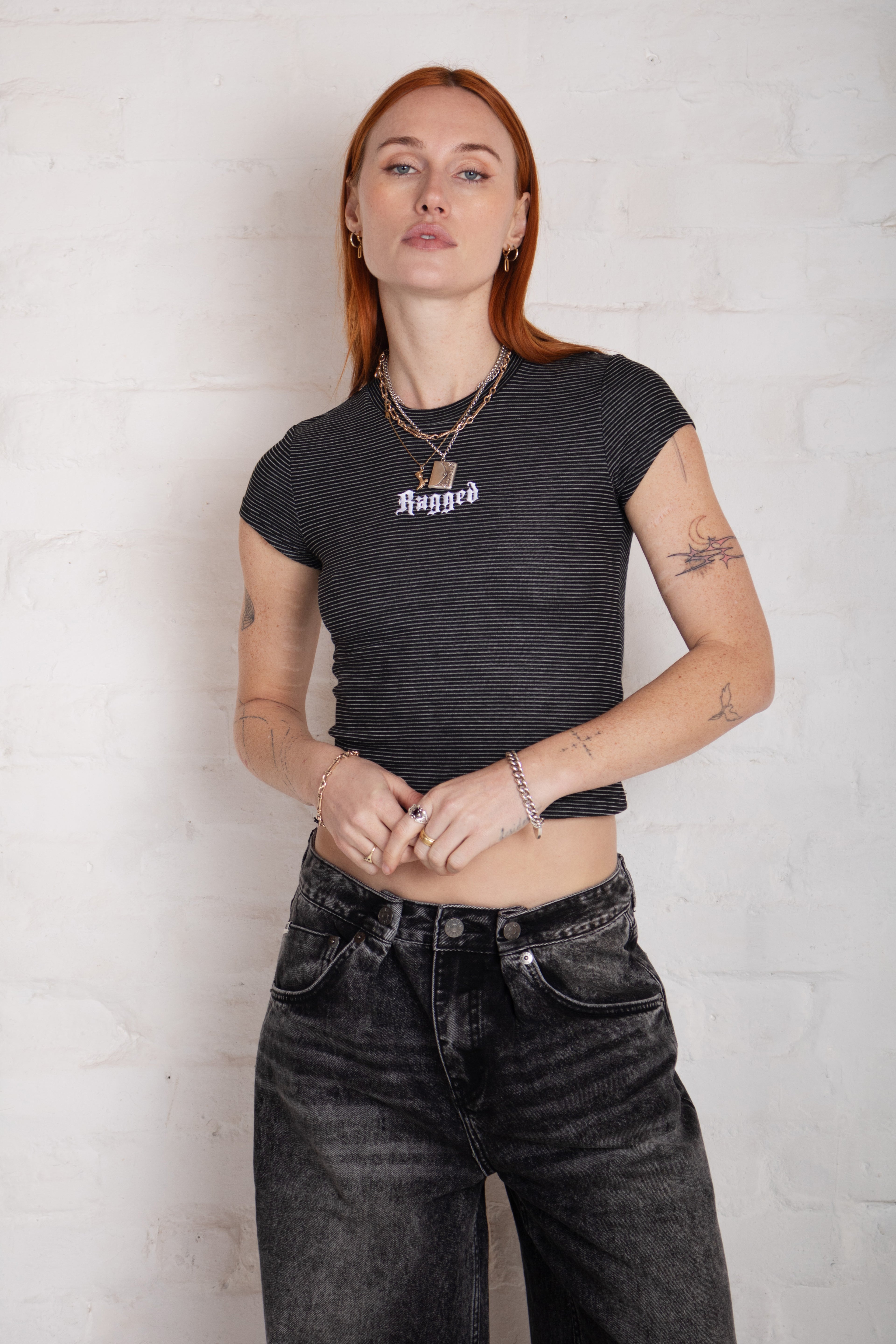 Black and white stripe baby tee with embroidered RAGGED scribble logo
