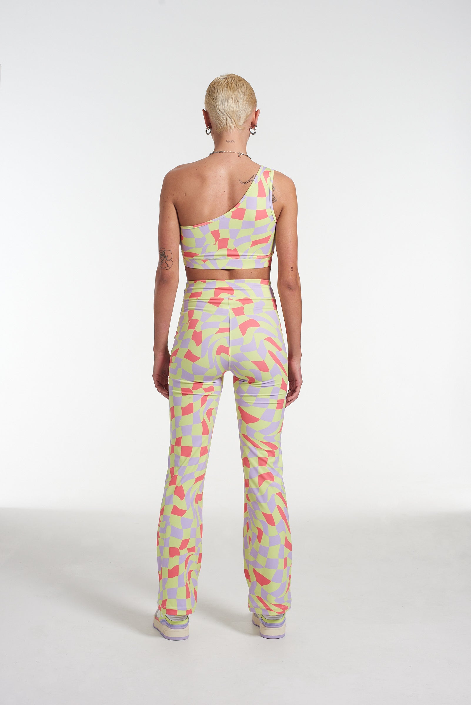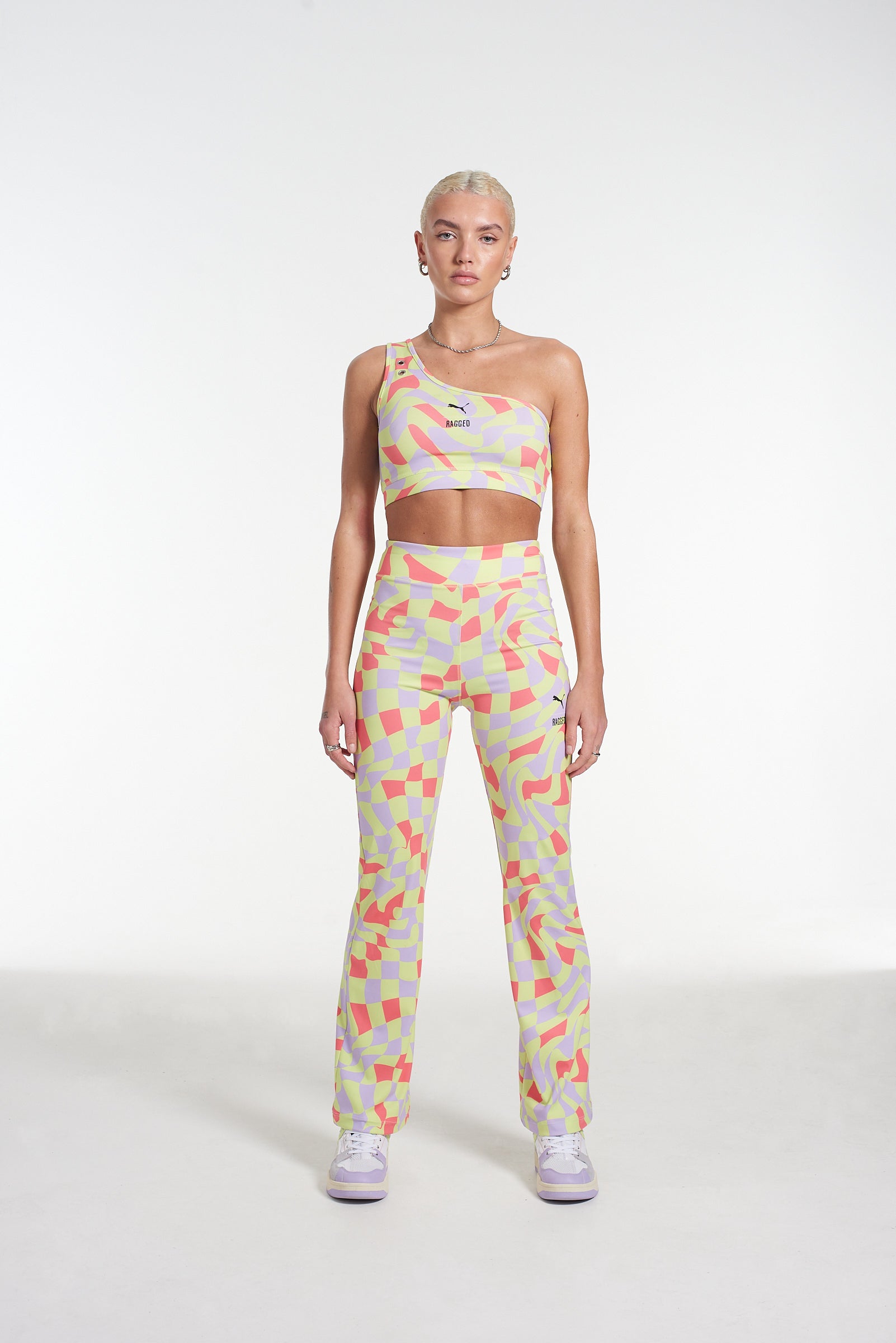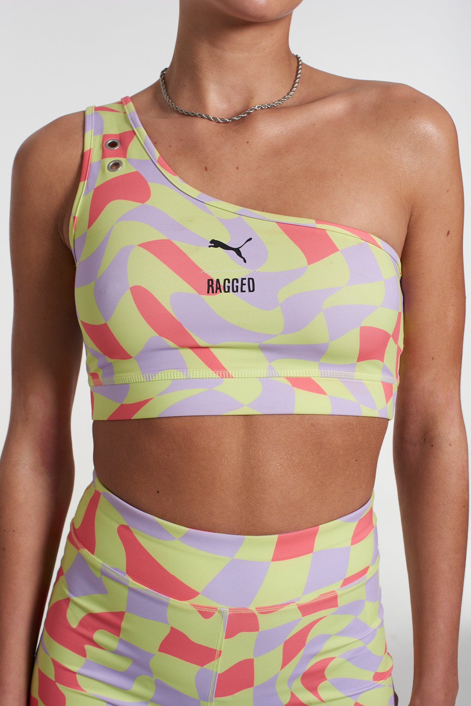 PUMA x The Ragged Priest neon warped check asymmetrical crop top. Limited edition exclusive collab where sportswear meets subculture.