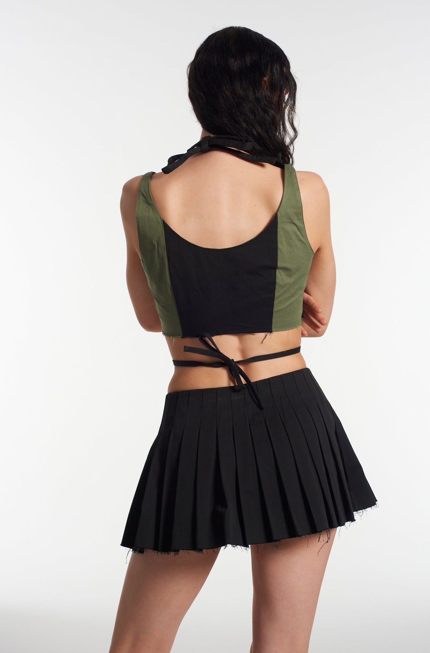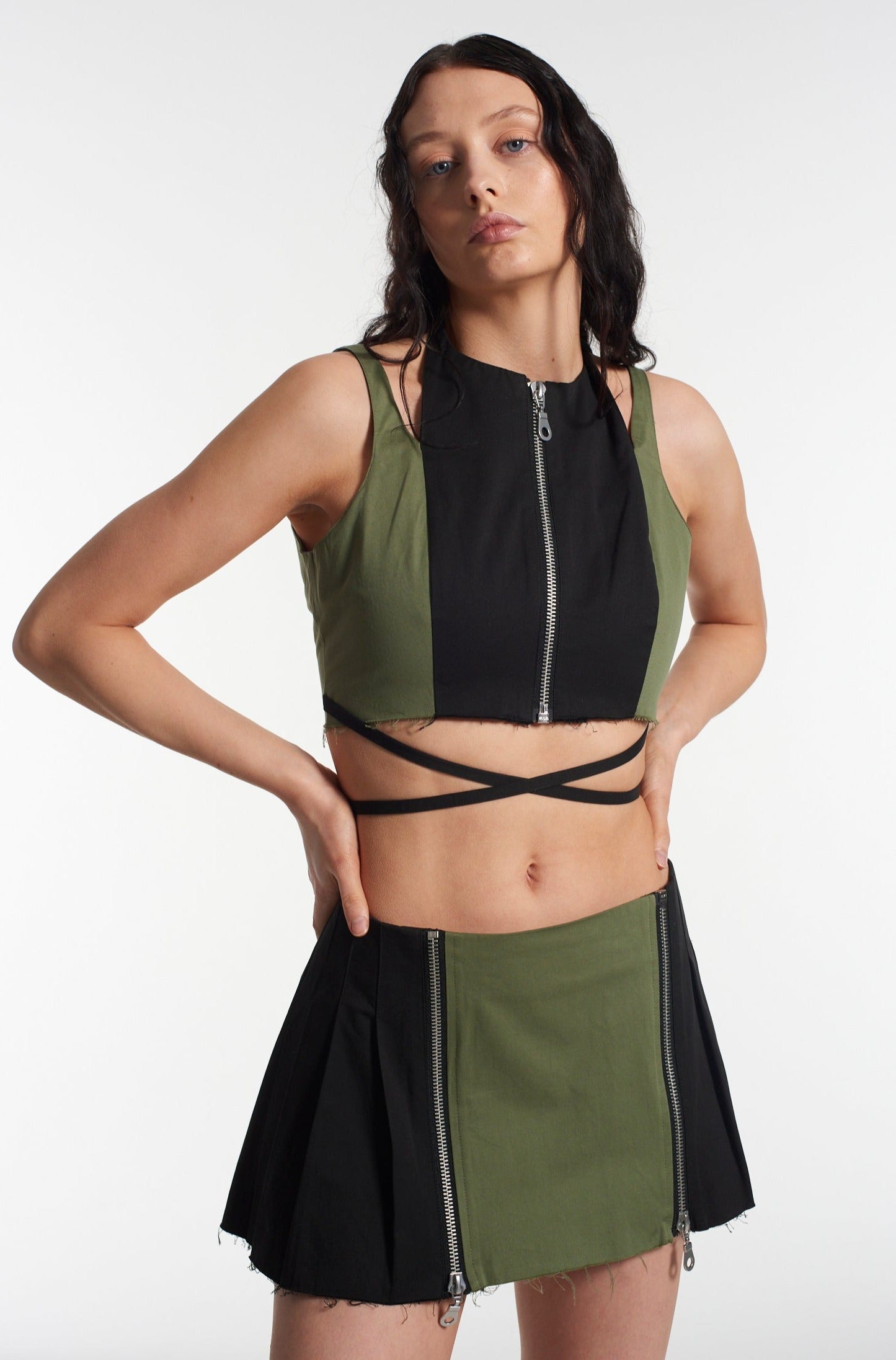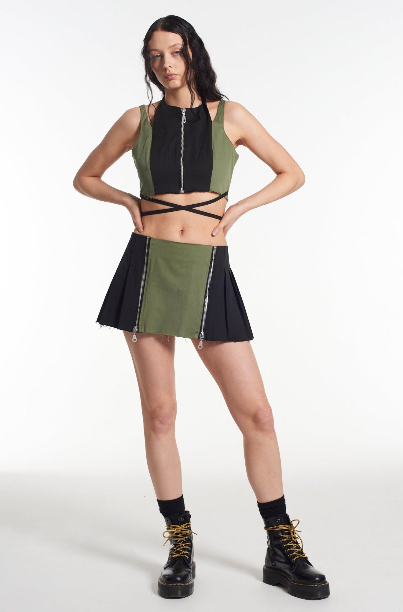The Ragged Priest black and khaki paneled mini skirt with zip detail.