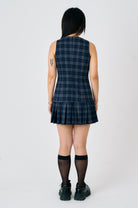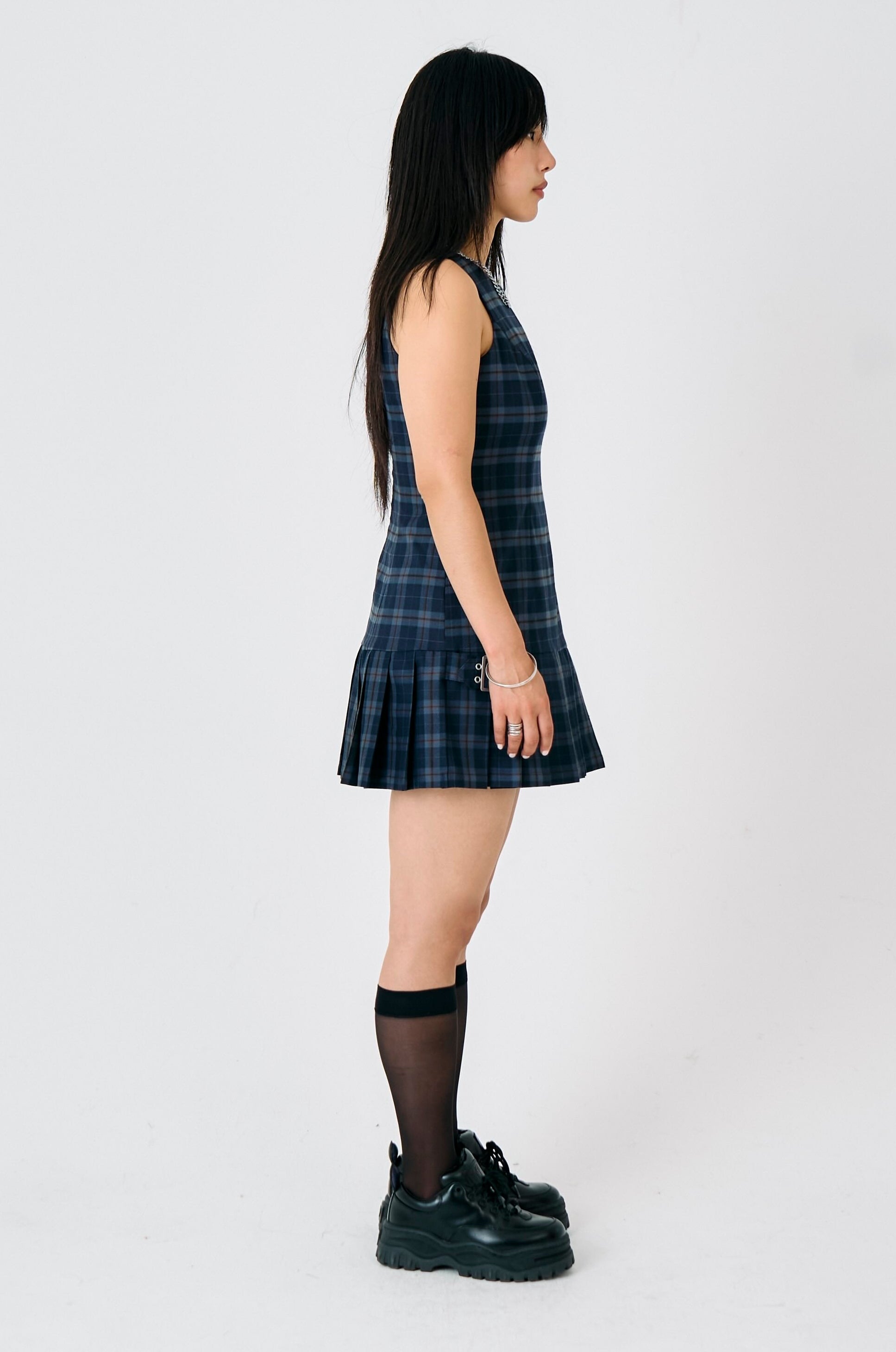 Blue check mini dress with a drop waist and pleated skirt. Featuring silver eyelet detail buckles at the side for a tailored fit with edge.