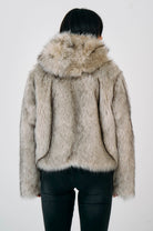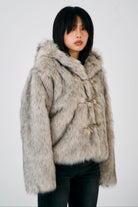 Super shaggy faux fur coat in ash mink with oversized hood and silver hardware fastening.