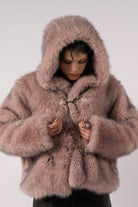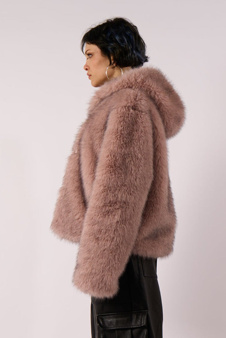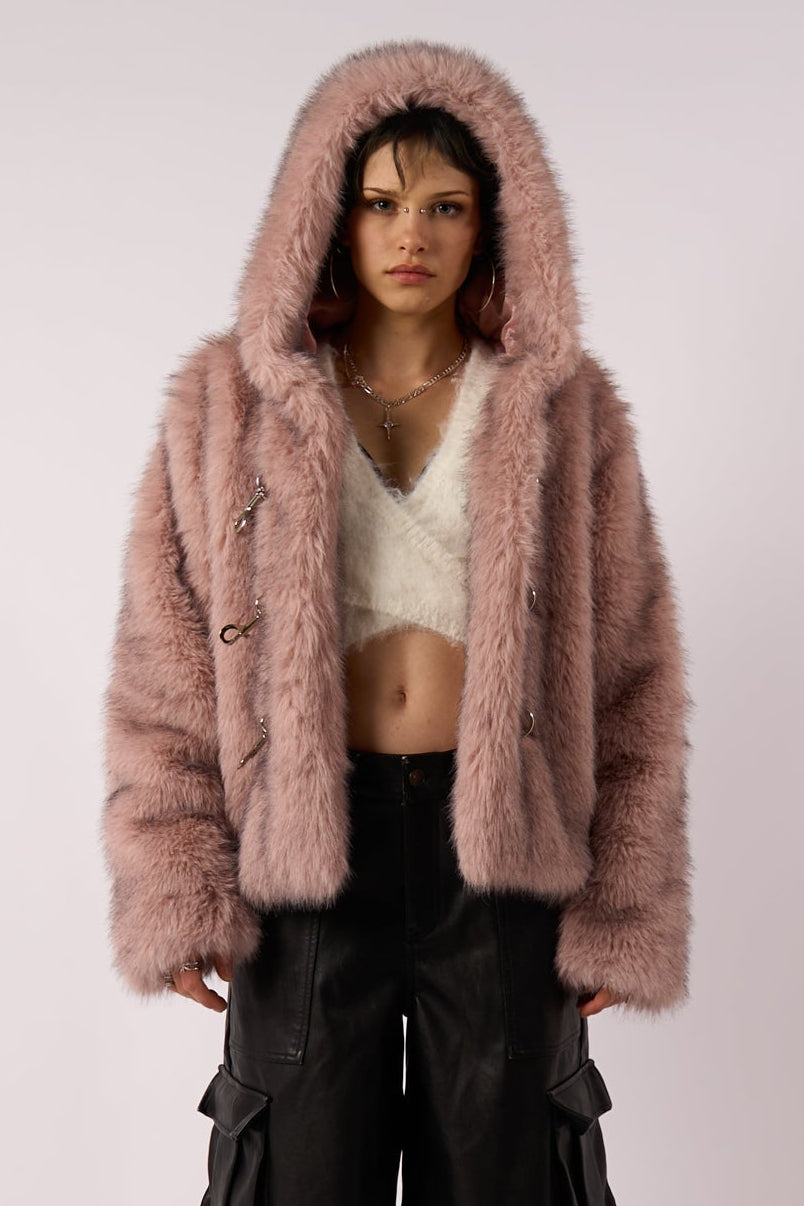 Super soft faux fur coat in grungey pink, featuring an oversized hood and silver hardware fastening.
