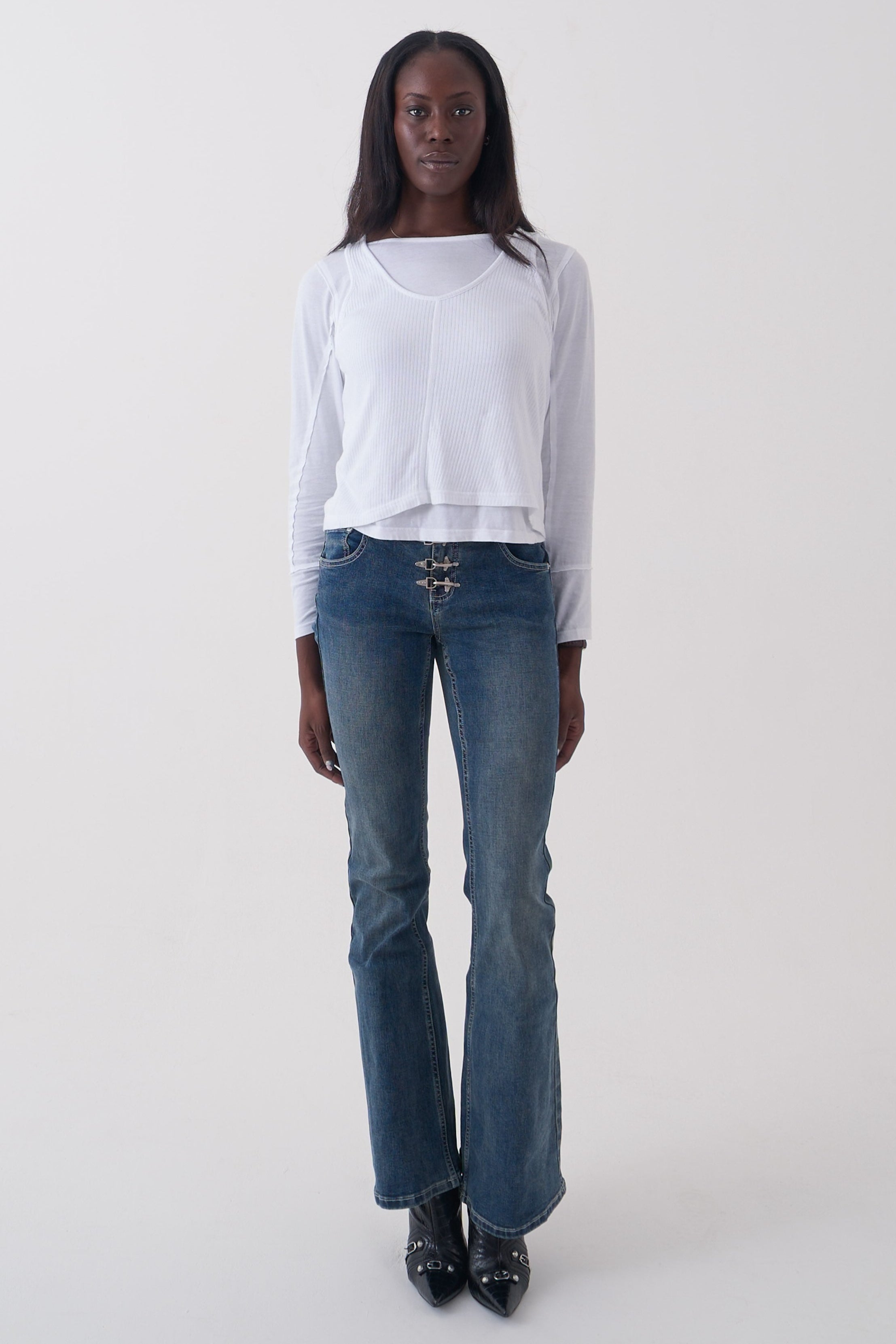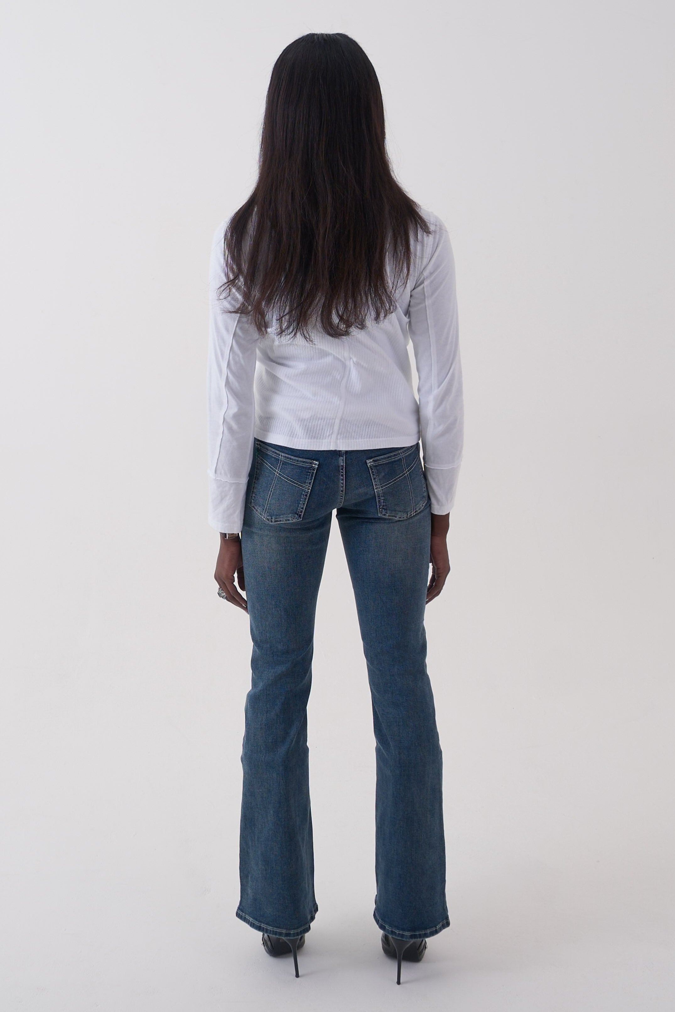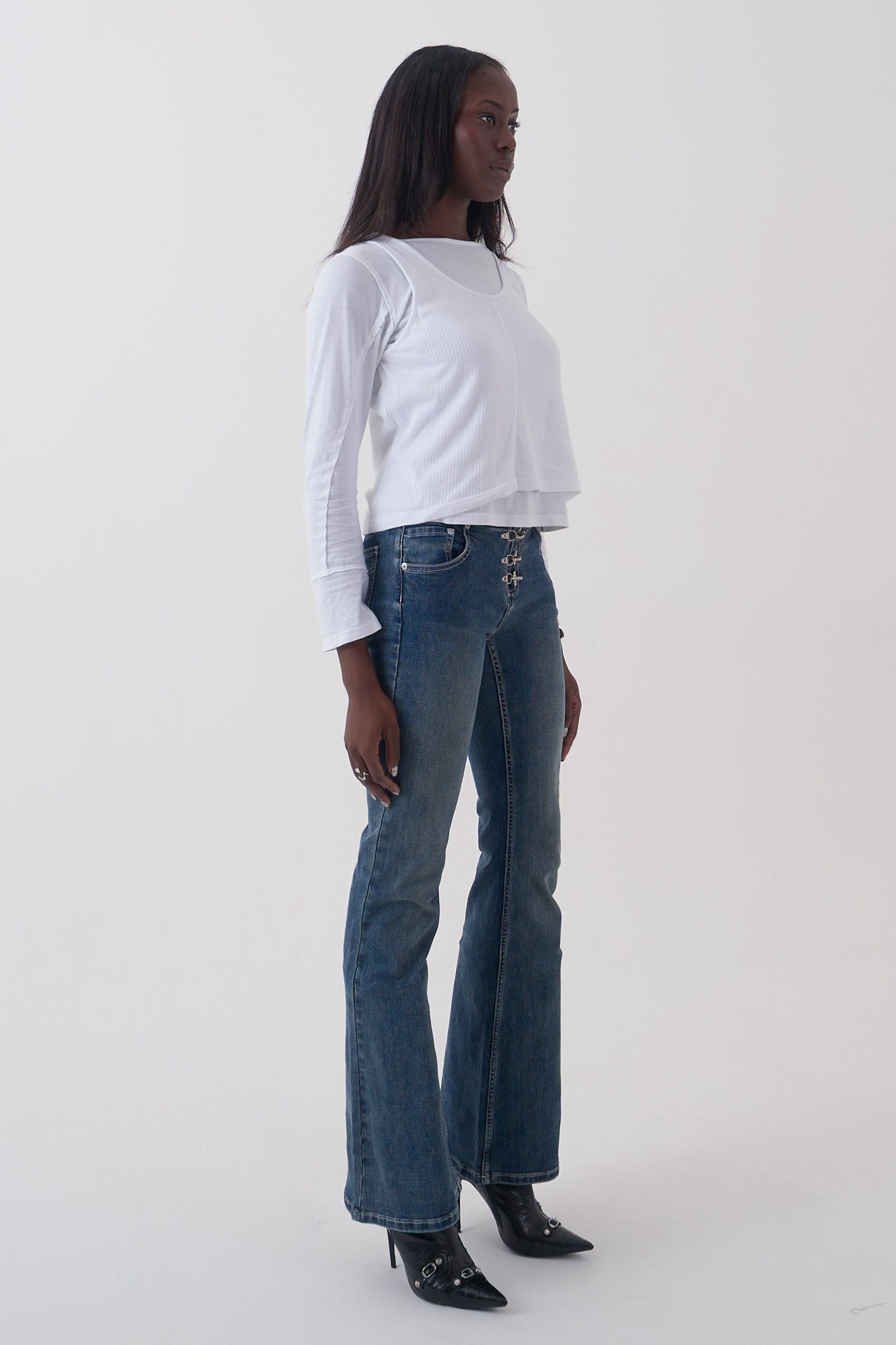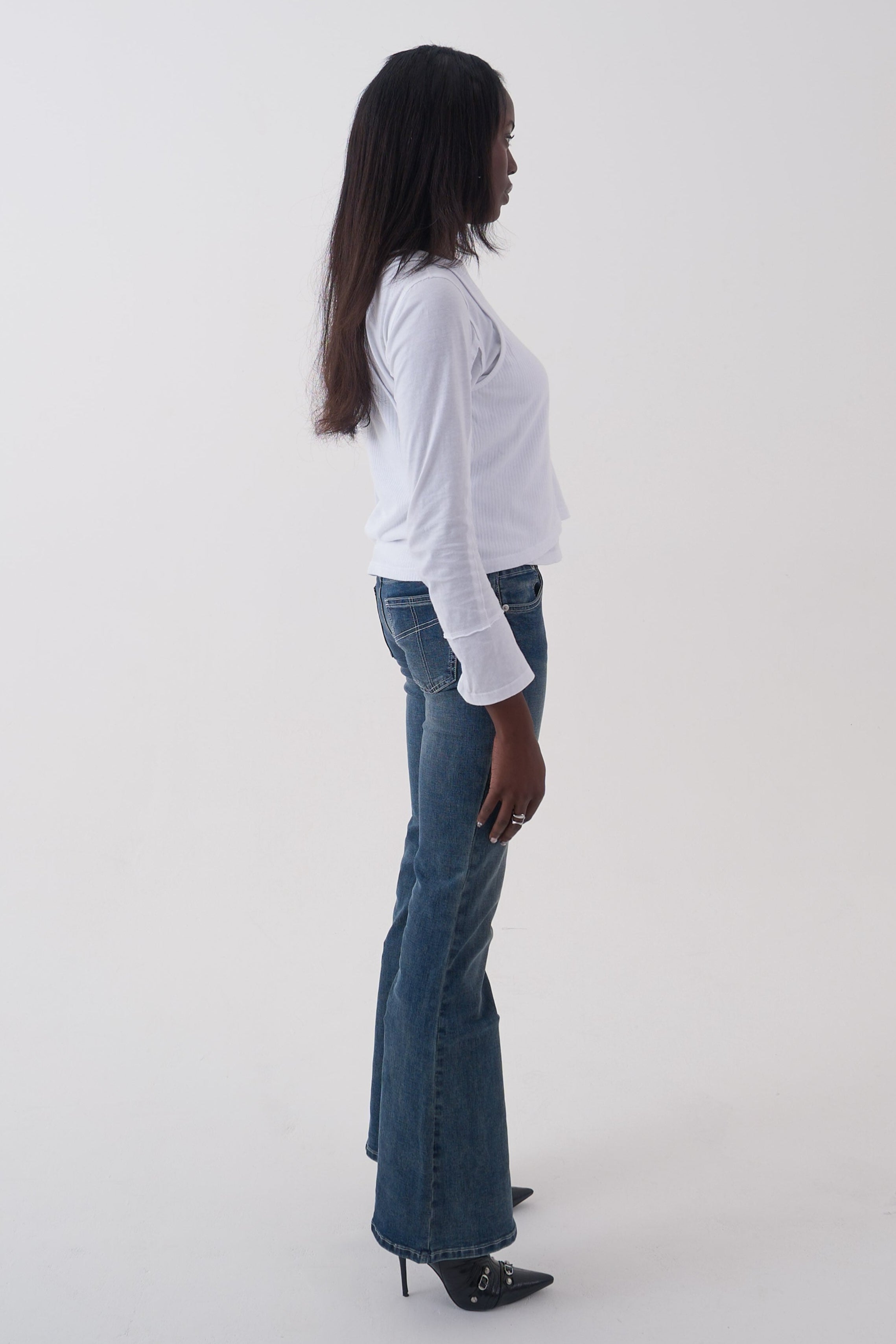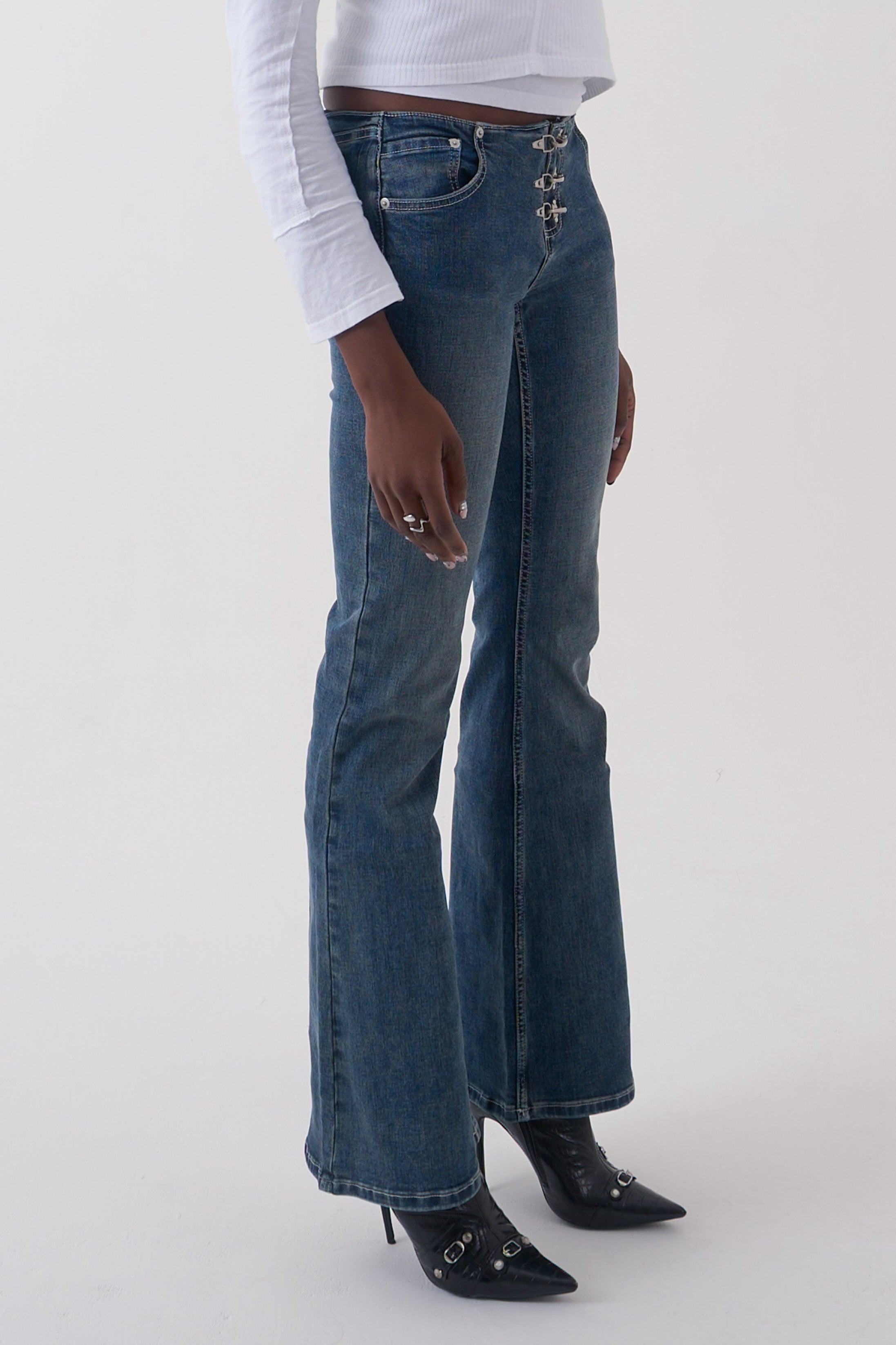Mid-blue wash bootcut flare jeans with silver latch fastening. Designed with no waistband to sit super low rise, with a vintage-inspired flare for a super flattering fit.