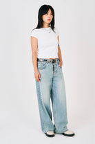 Slim Sweeper jean in vintage light wash with zip front and silver D ring hardware
