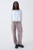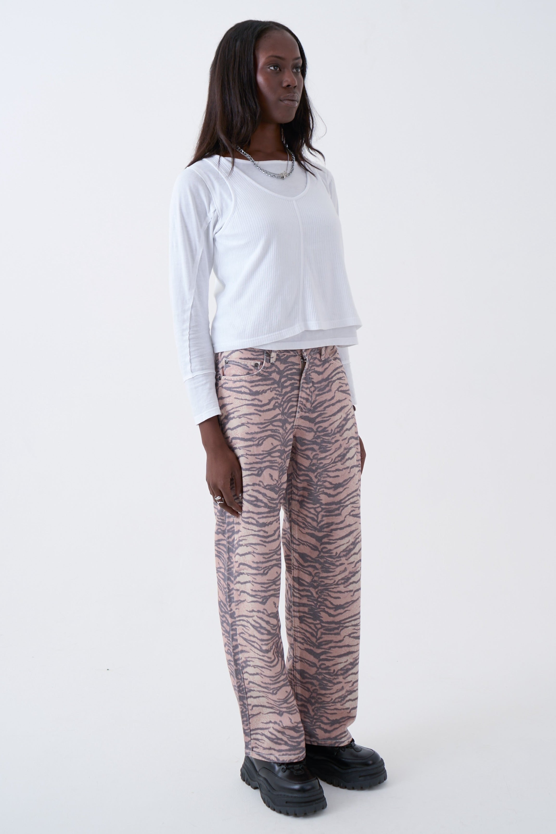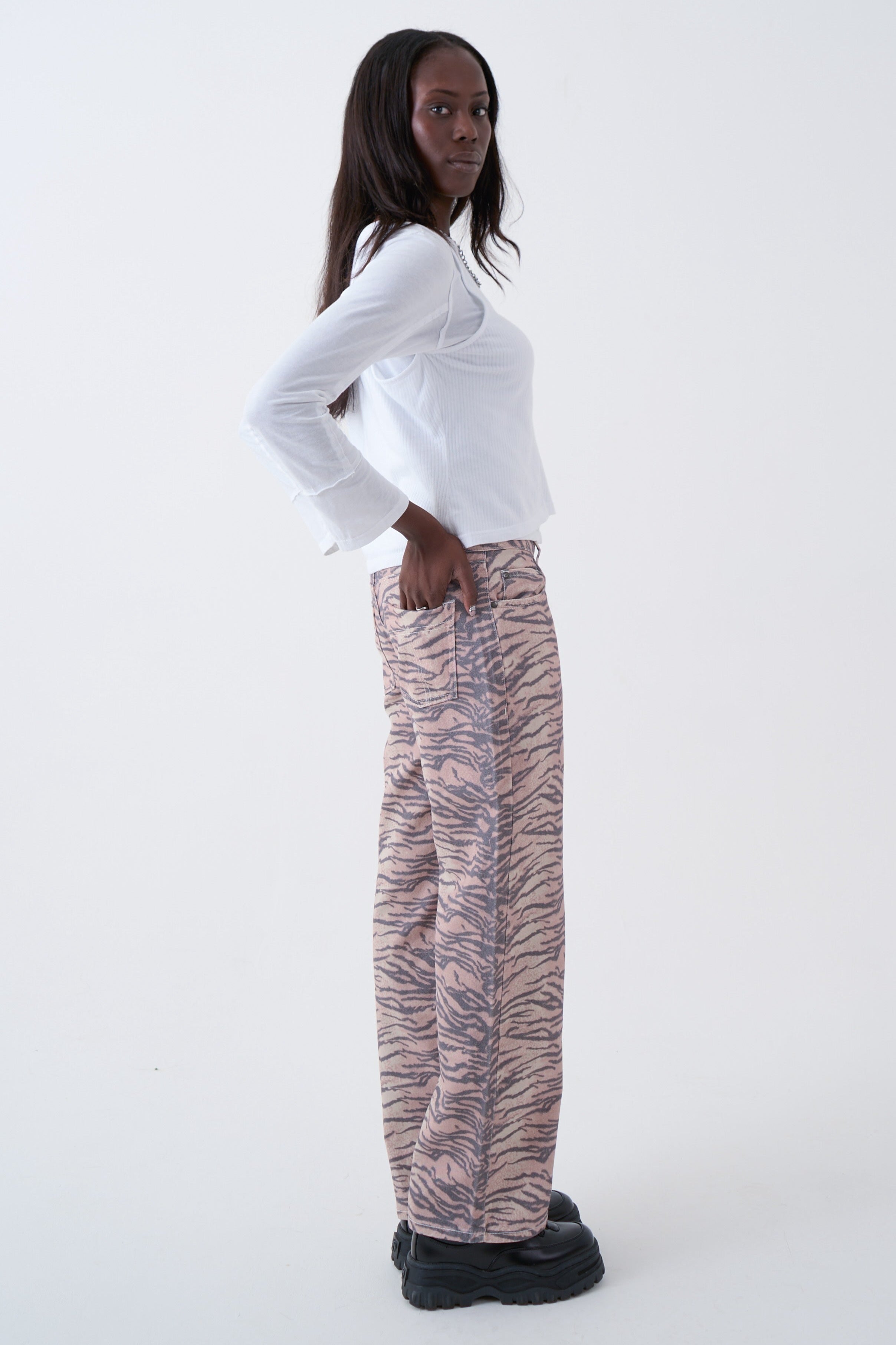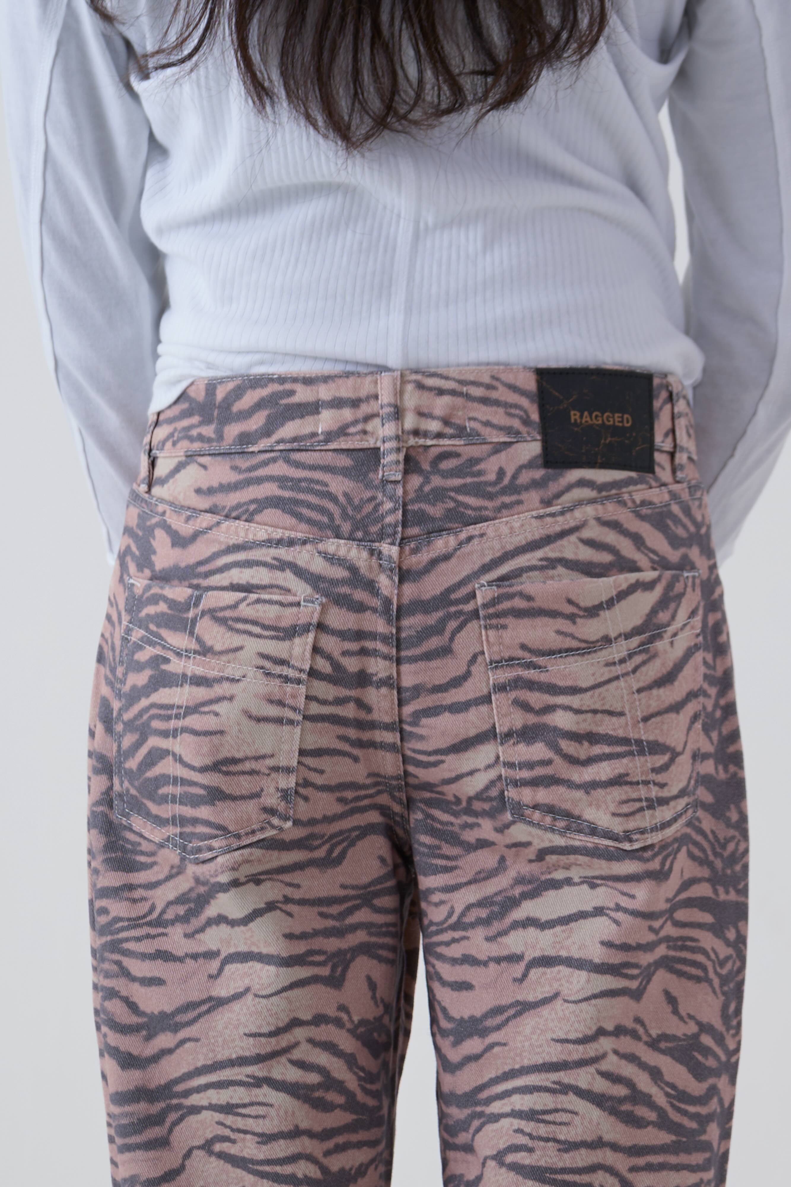 Slouchy straight leg Dad Jean in a bold neutral tiger stripe print.