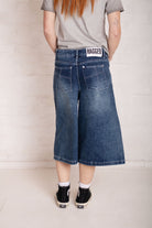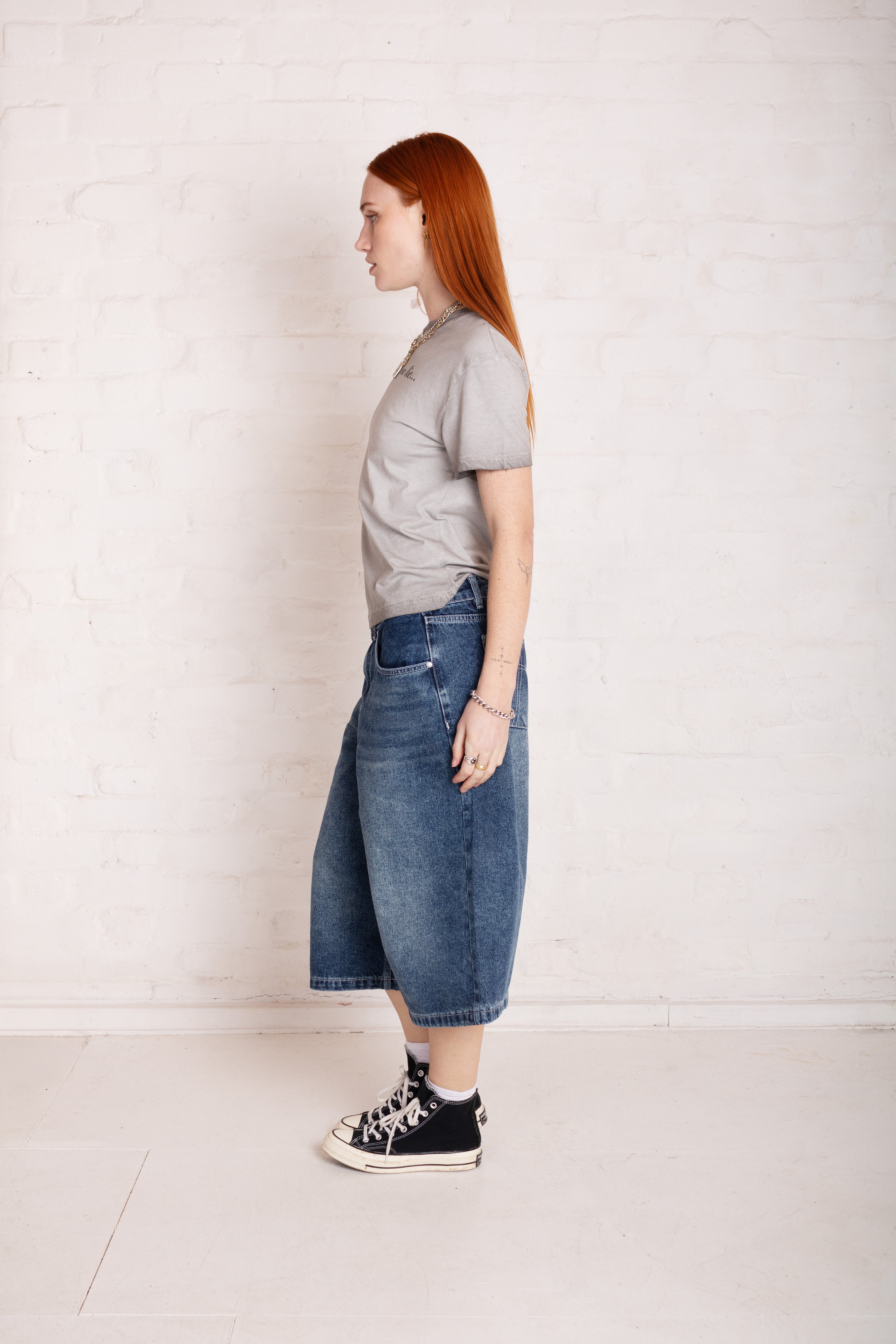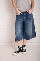 Our iconic Release Jean, in a Jort. Low rise, ultra baggy long line denim shorts in a mid blue dirty wash