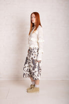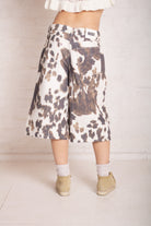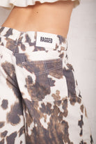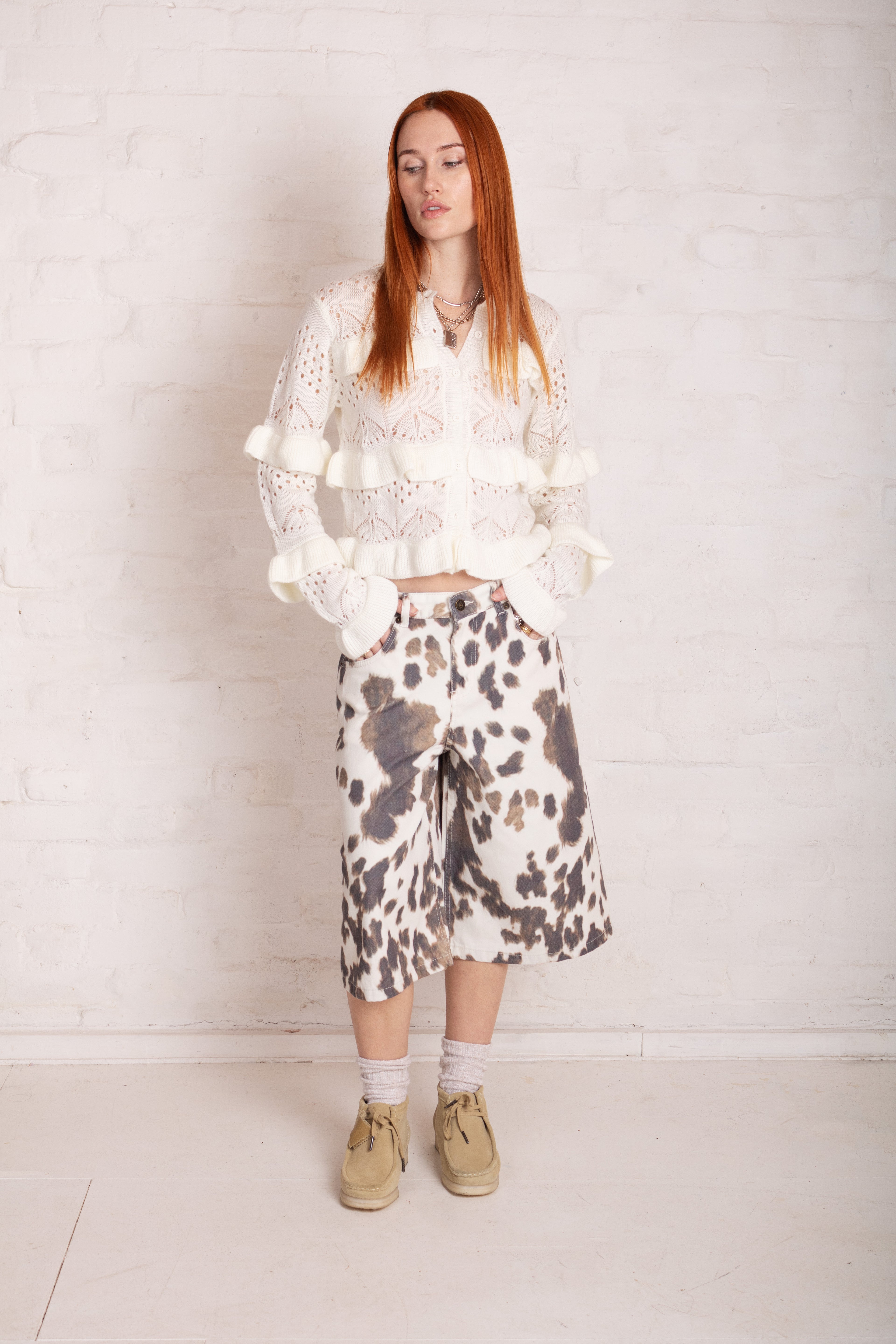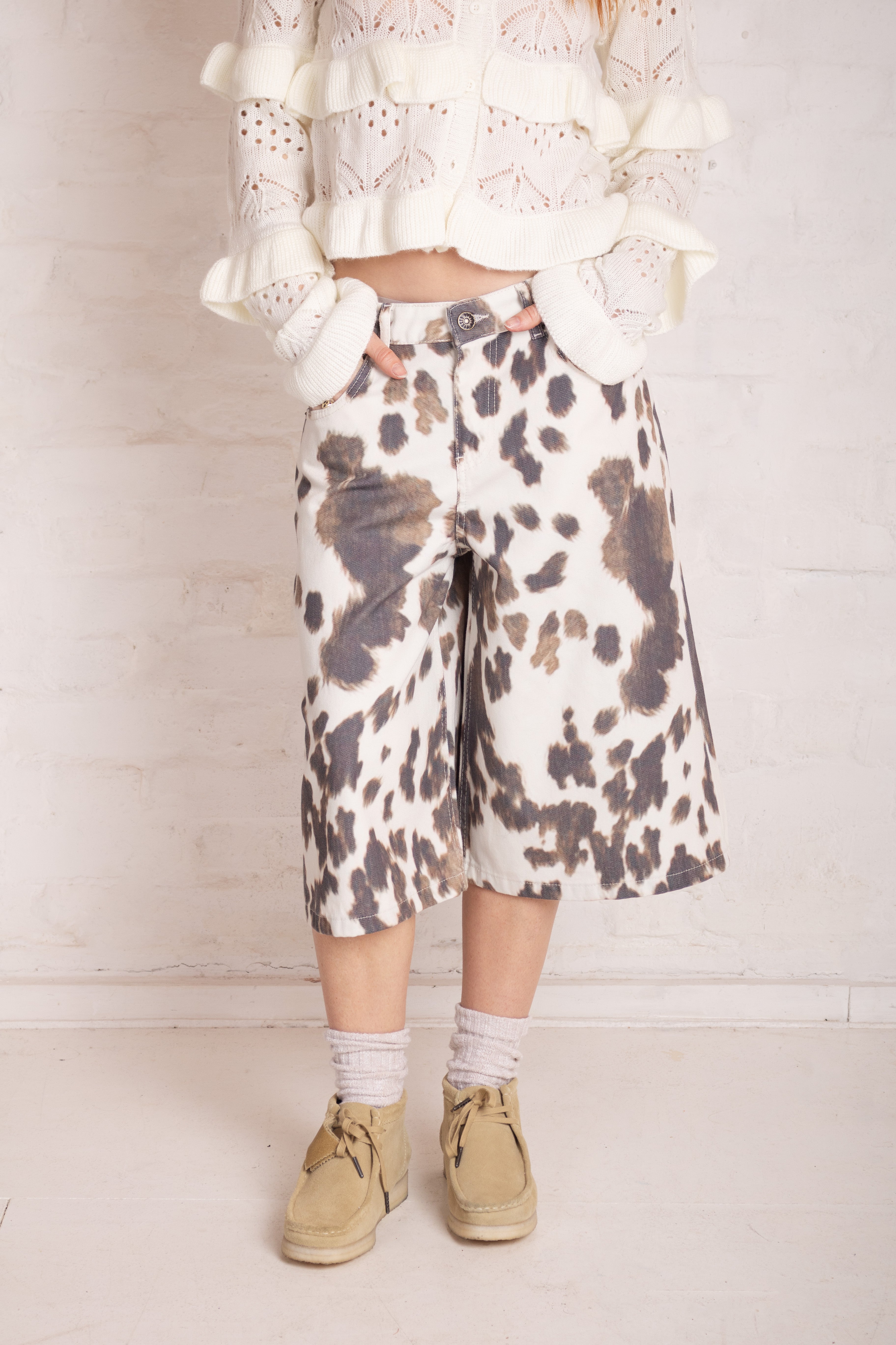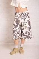 Our iconic Release Jean, in a Jort. Low rise, ultra baggy long line denim shorts in statement brown and ecru cow print.