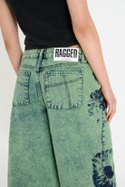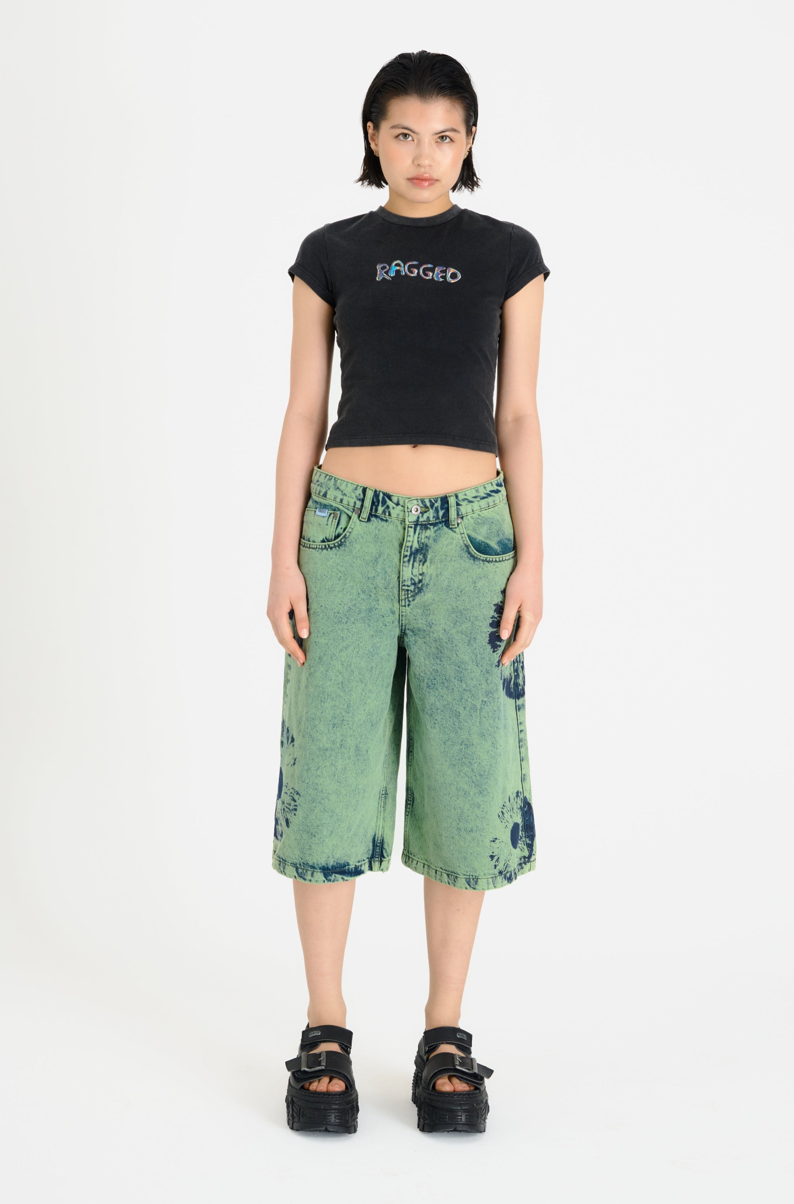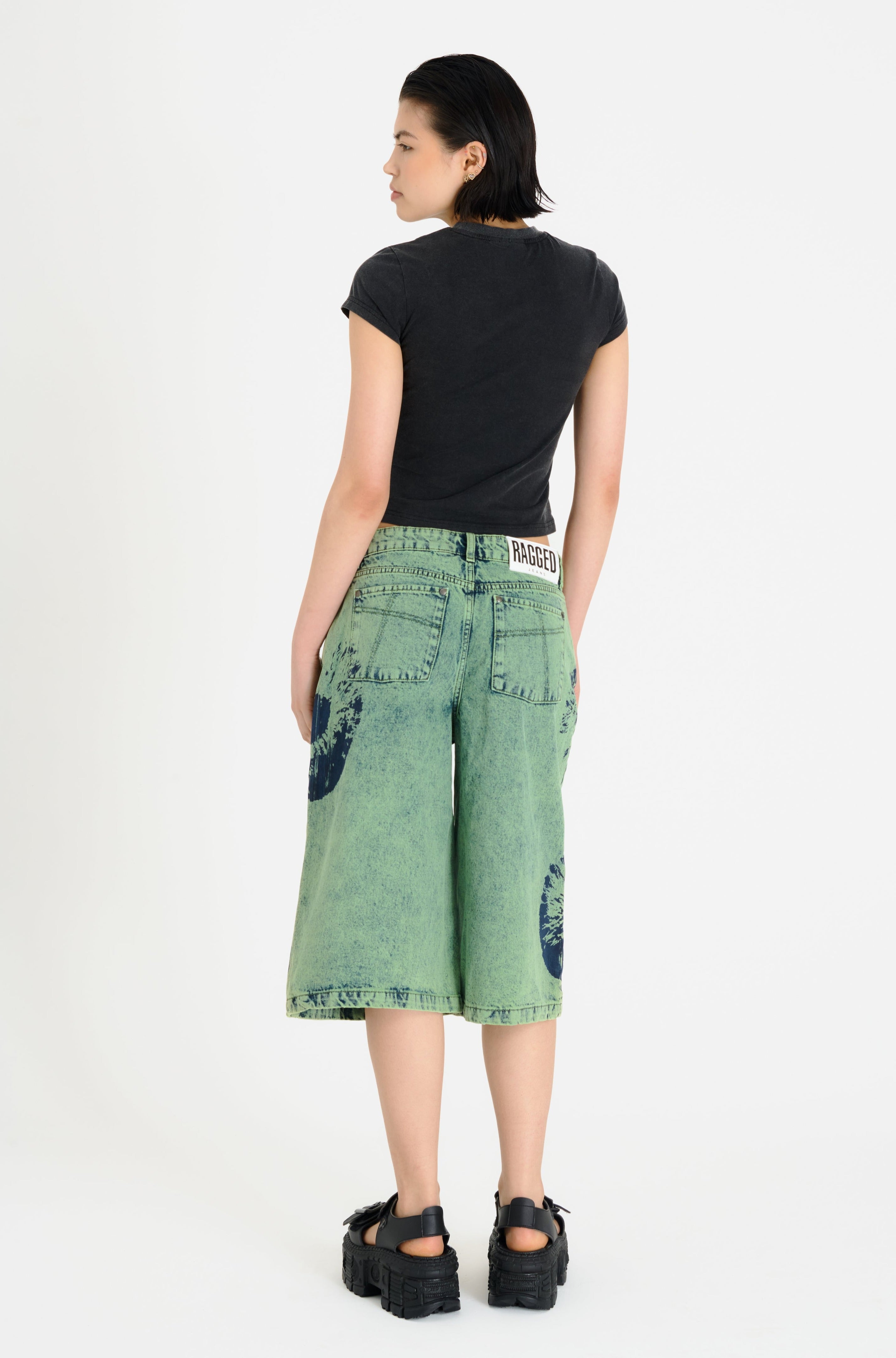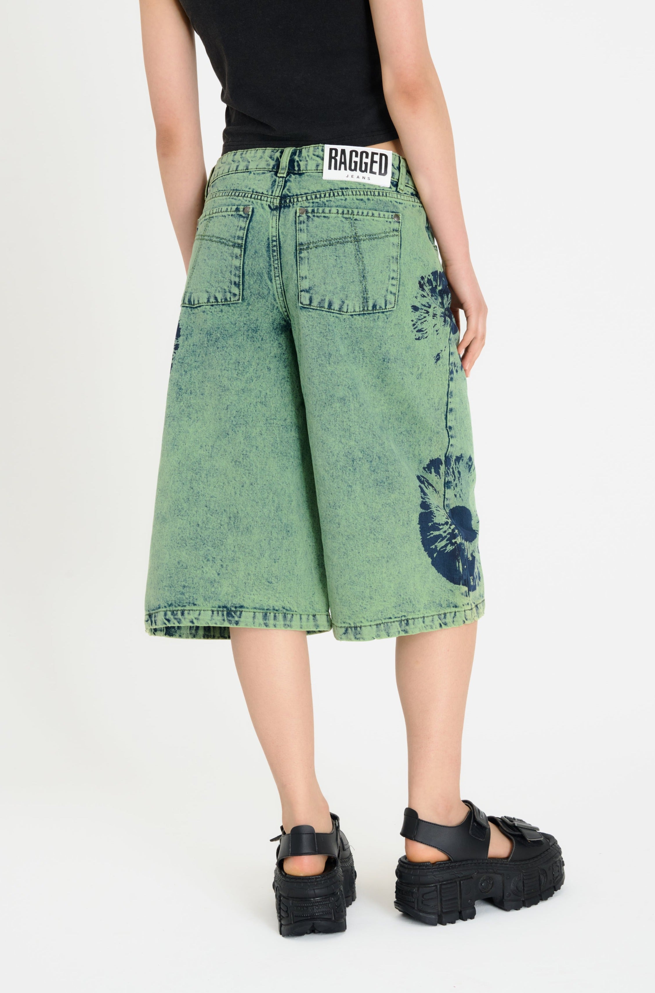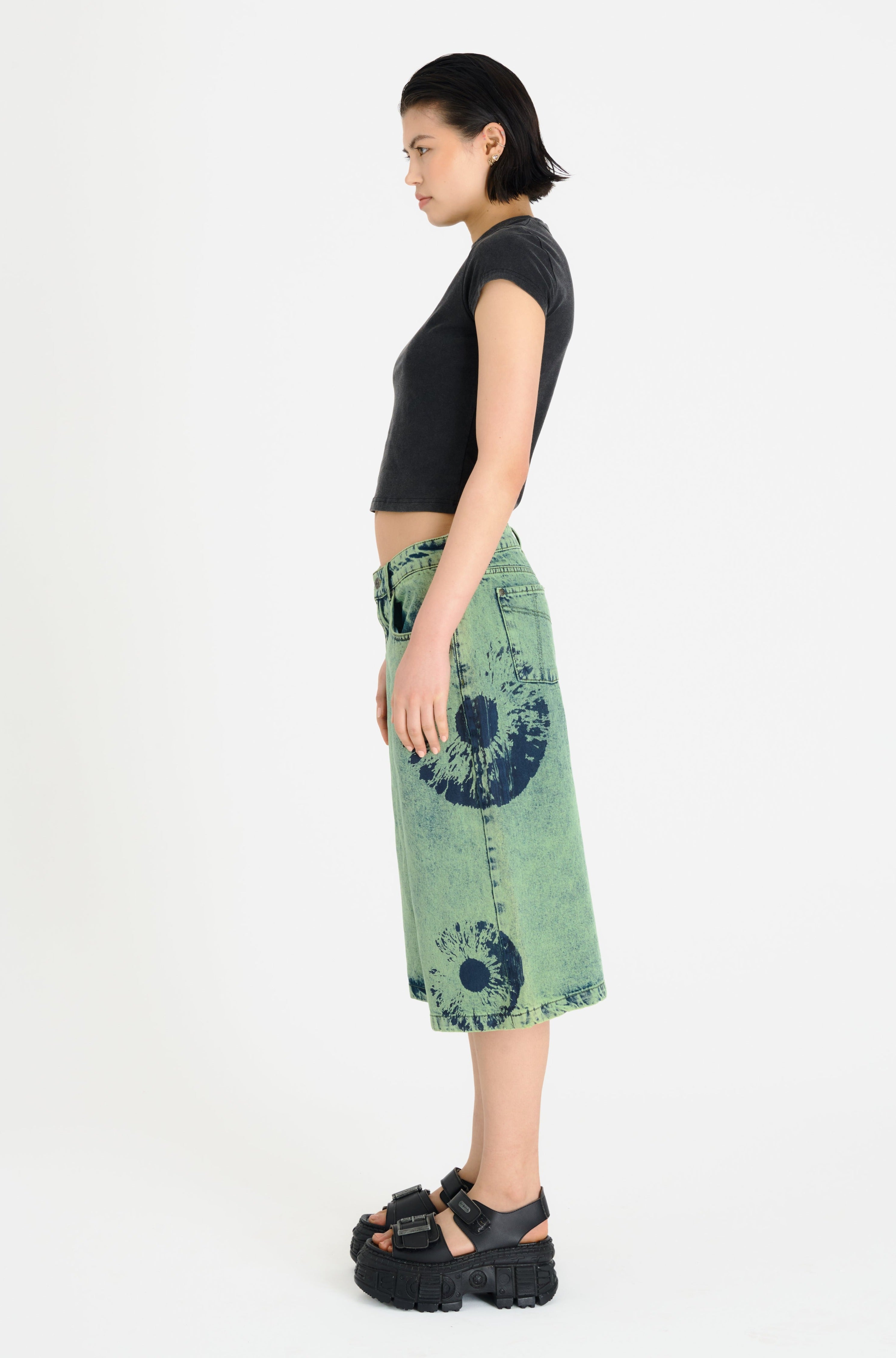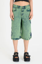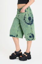 Baggy wide leg shorts, in a green washed denim with eyeball print. Features non stretch denim in a long line style