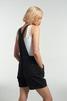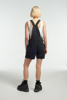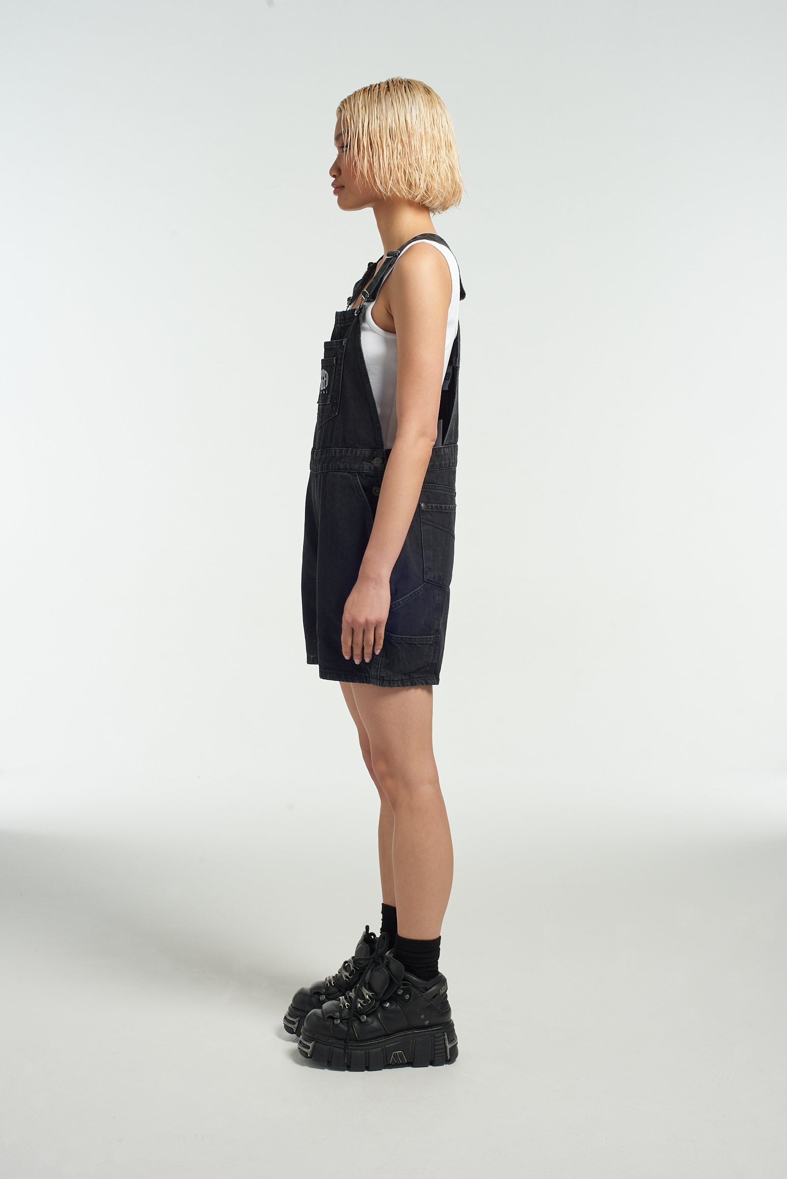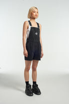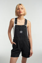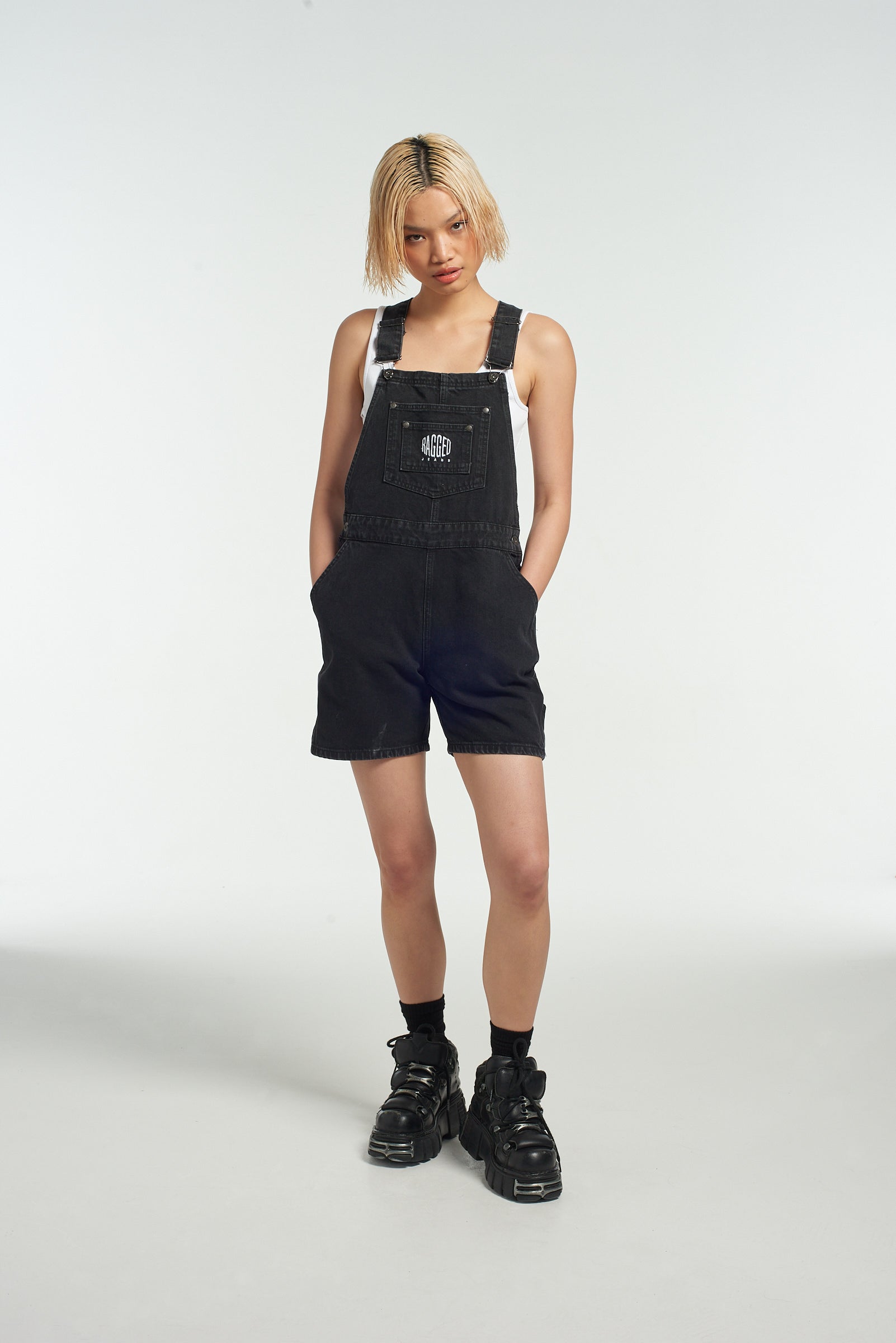 The Ragged Priest black denim overall shorts with central "RAGGED Jeans" embroidered logo.