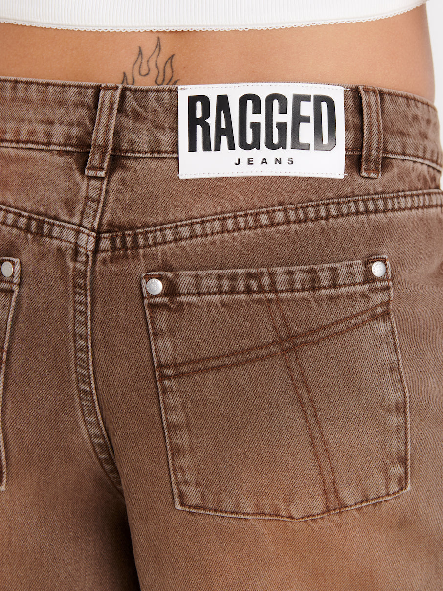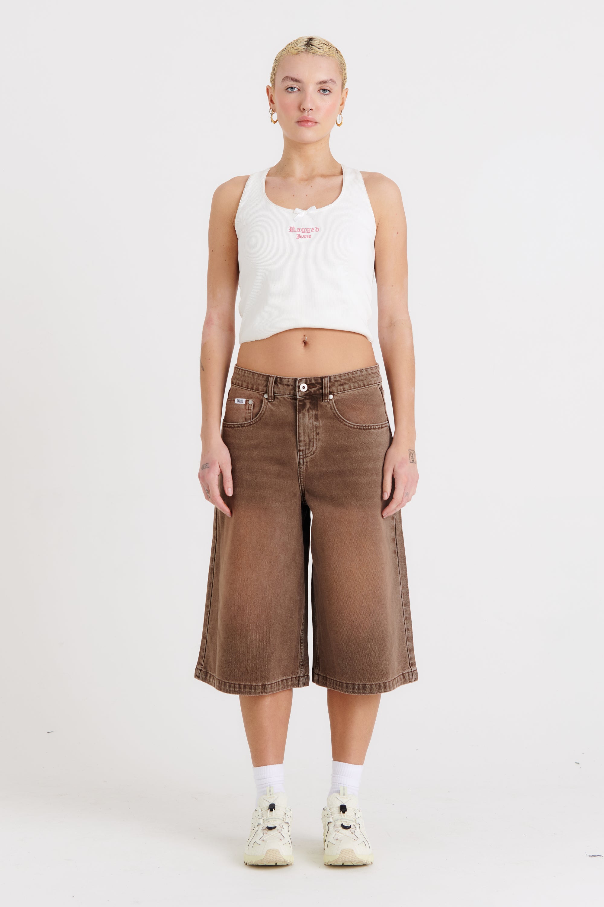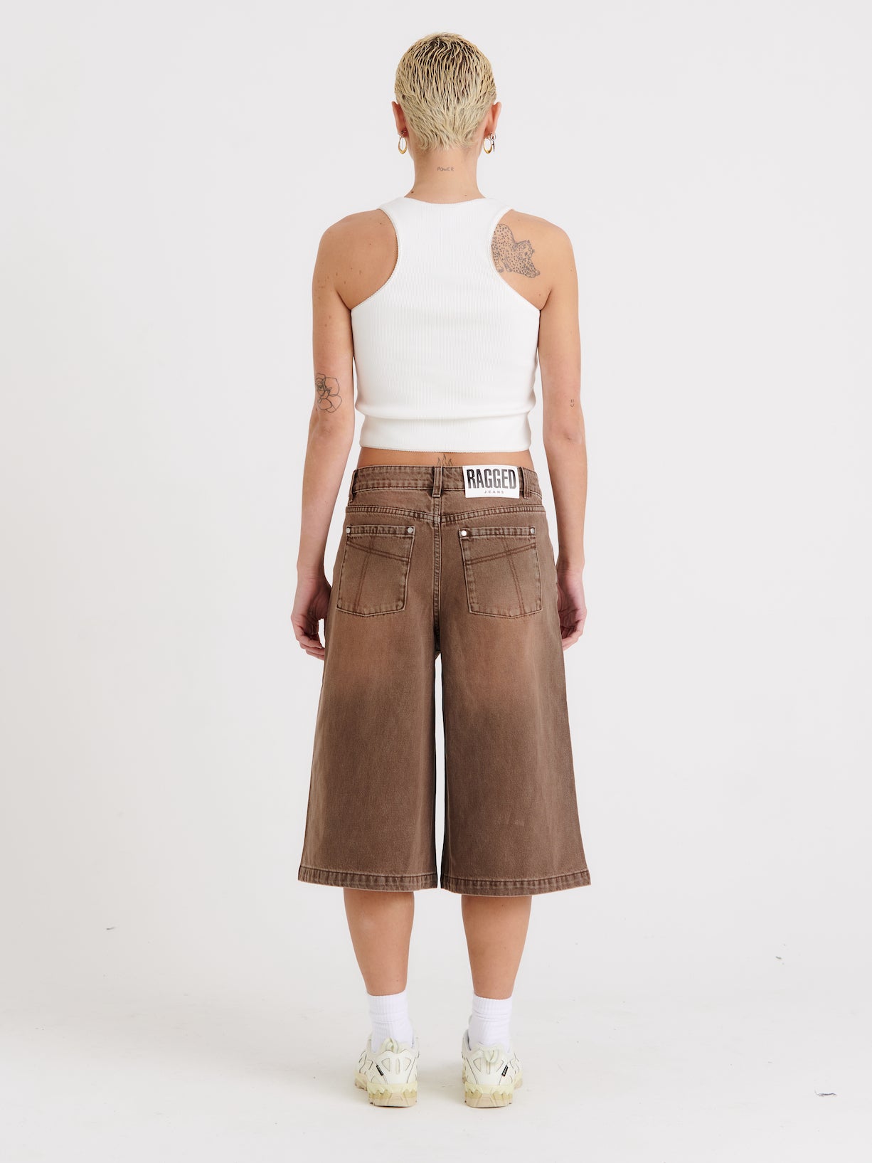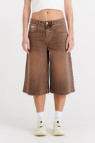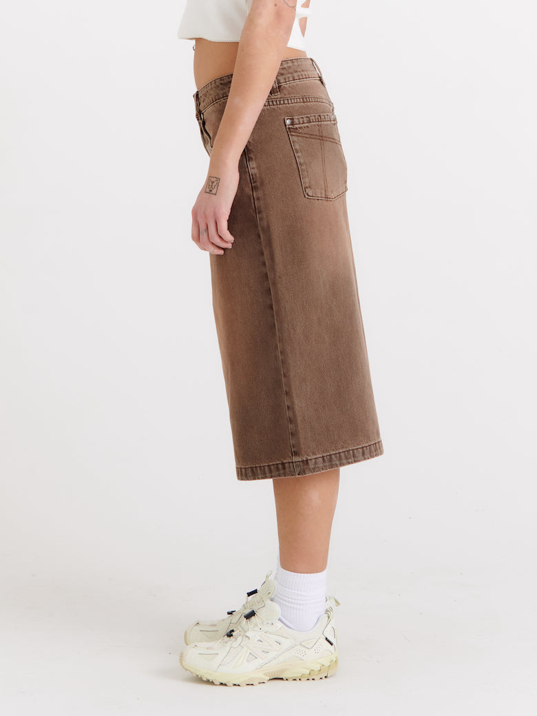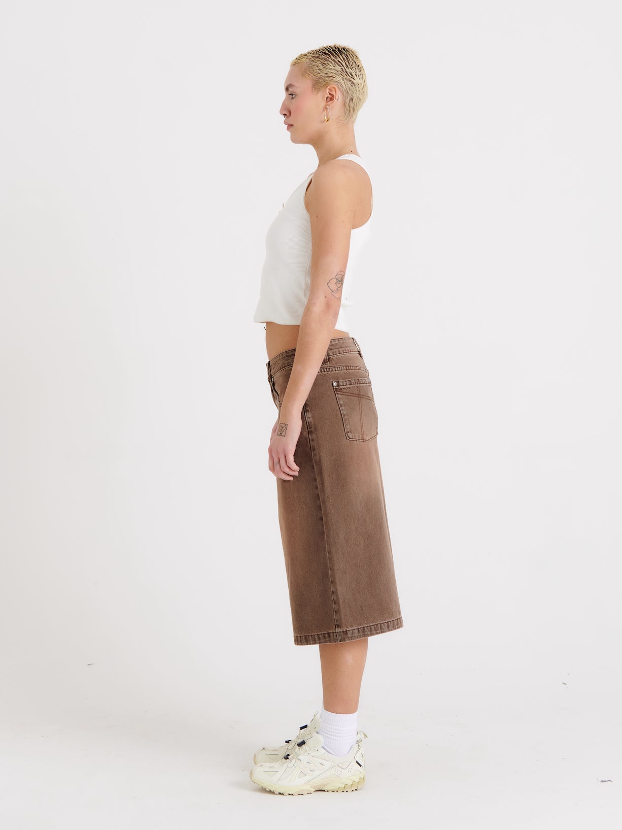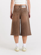 Baggy wide leg shorts, in a brown washed denim with a low rise waist. Features non stretch denim in a long line style