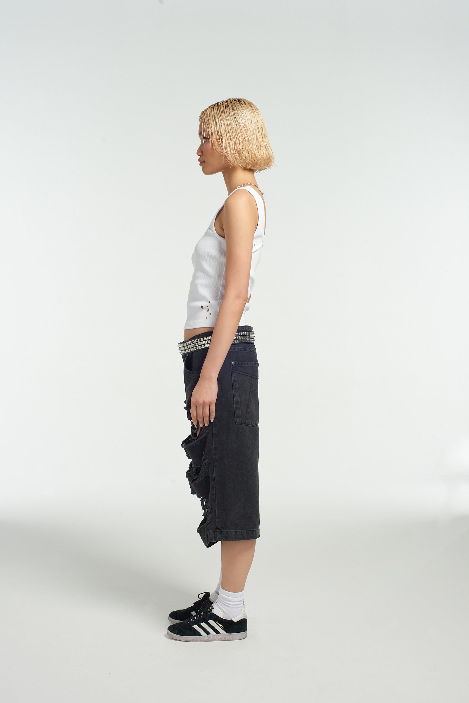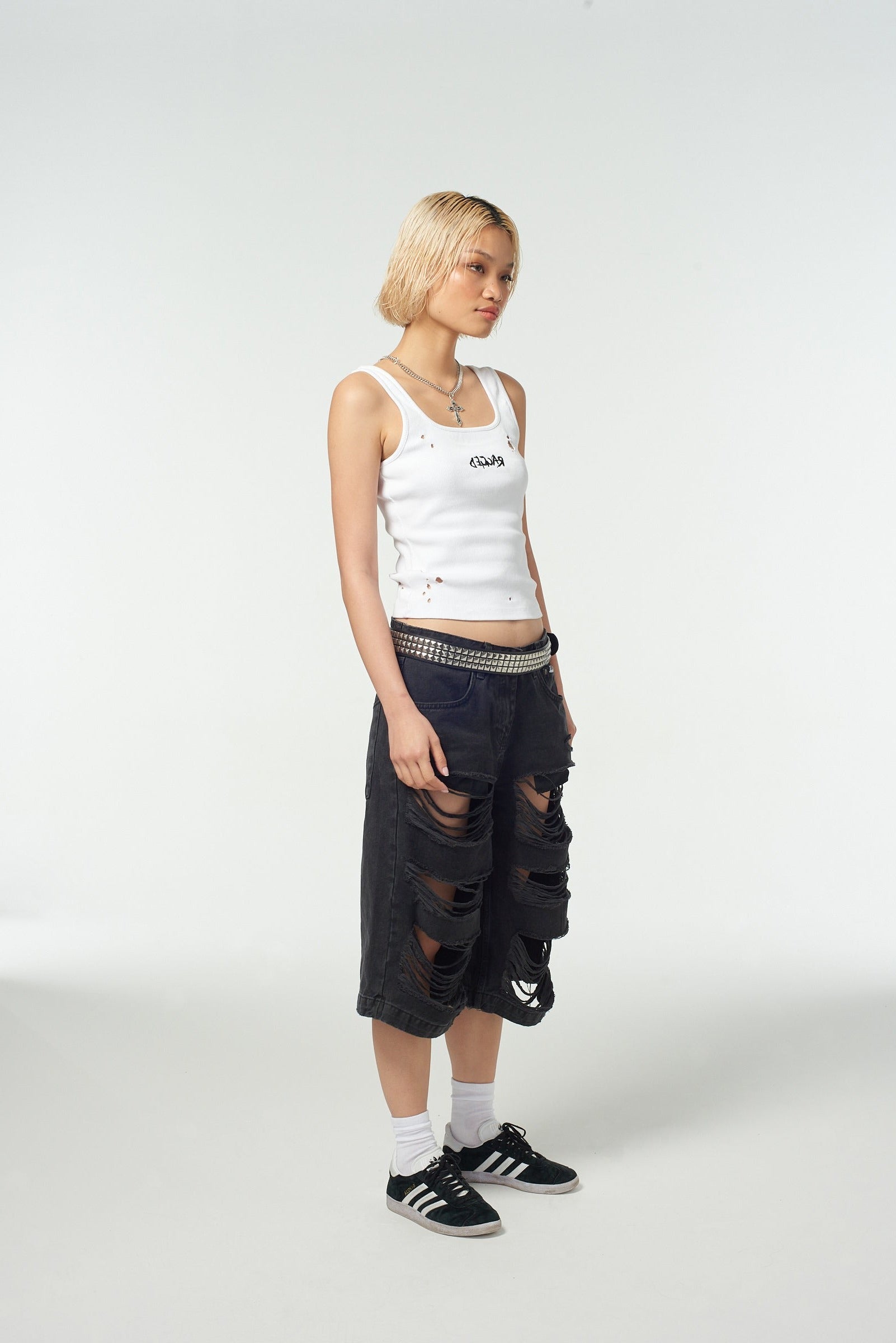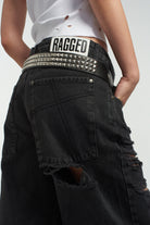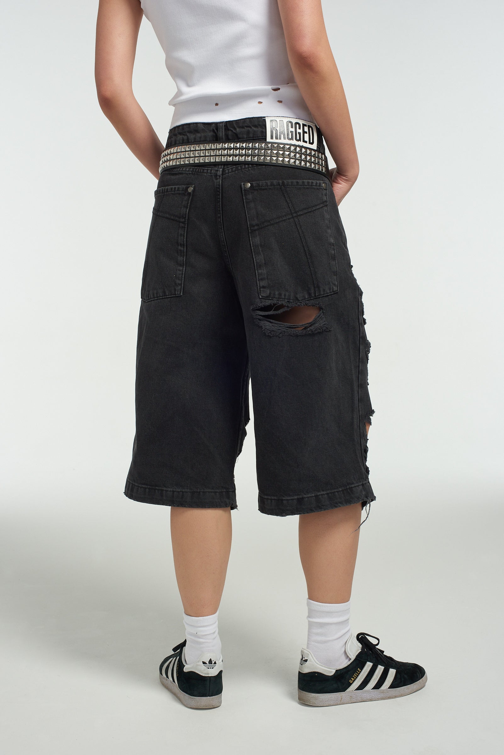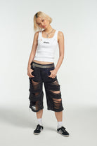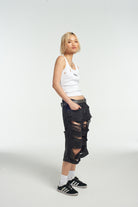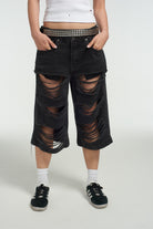 The Ragged Priest black long line ultra distressed skater shorts.