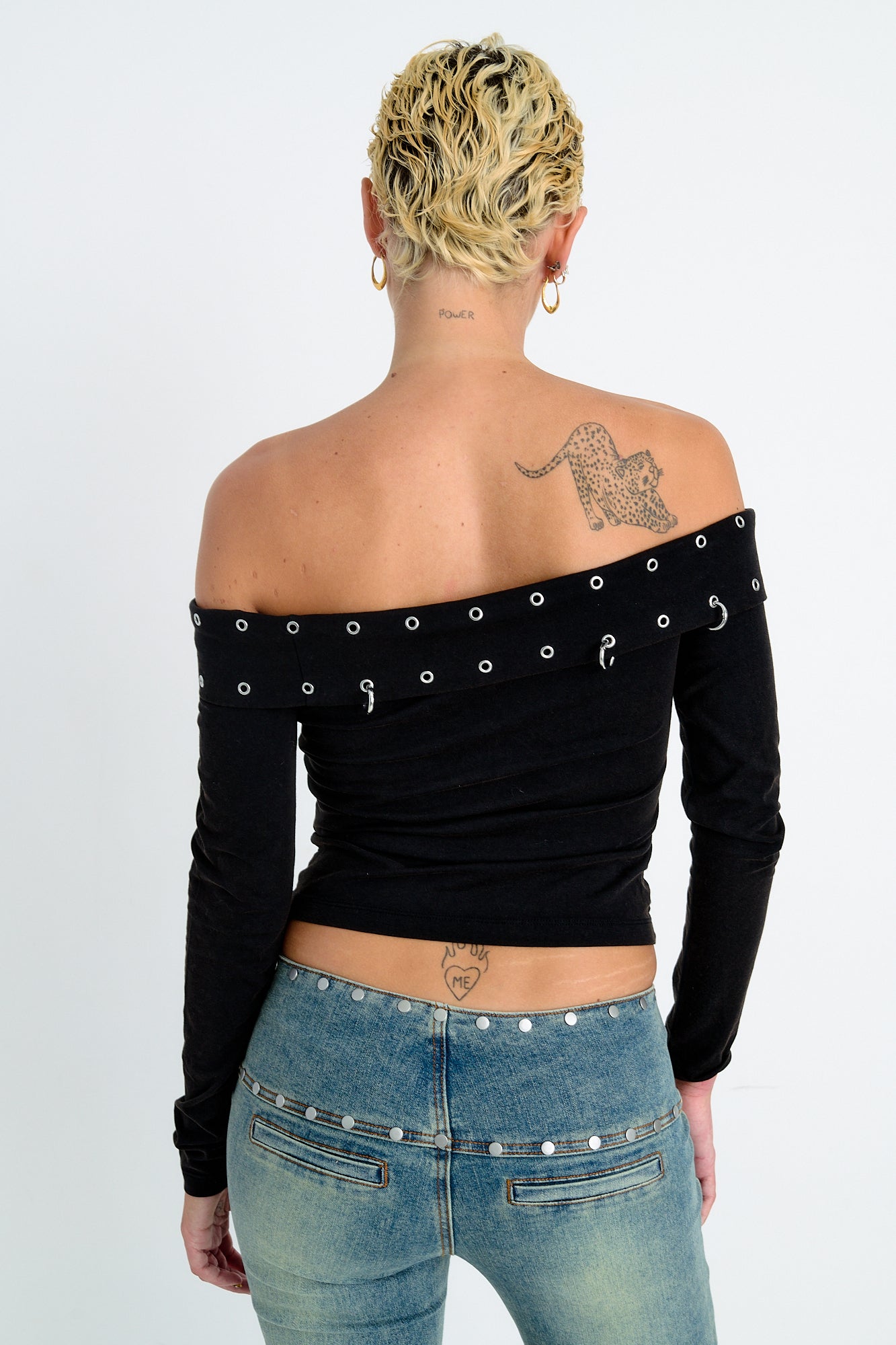 Black long sleeve bardot top with metal eyelet and O ring hardware