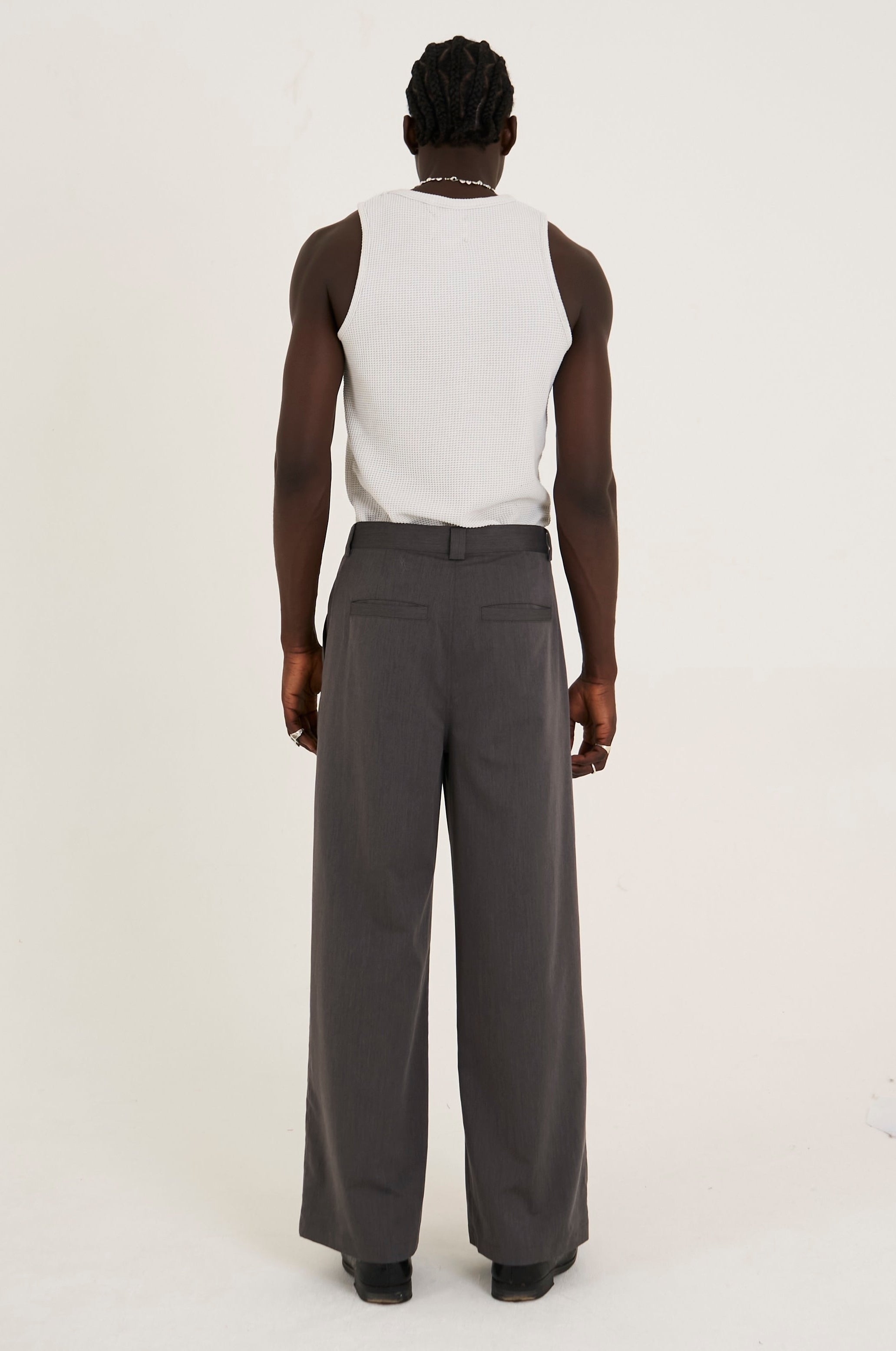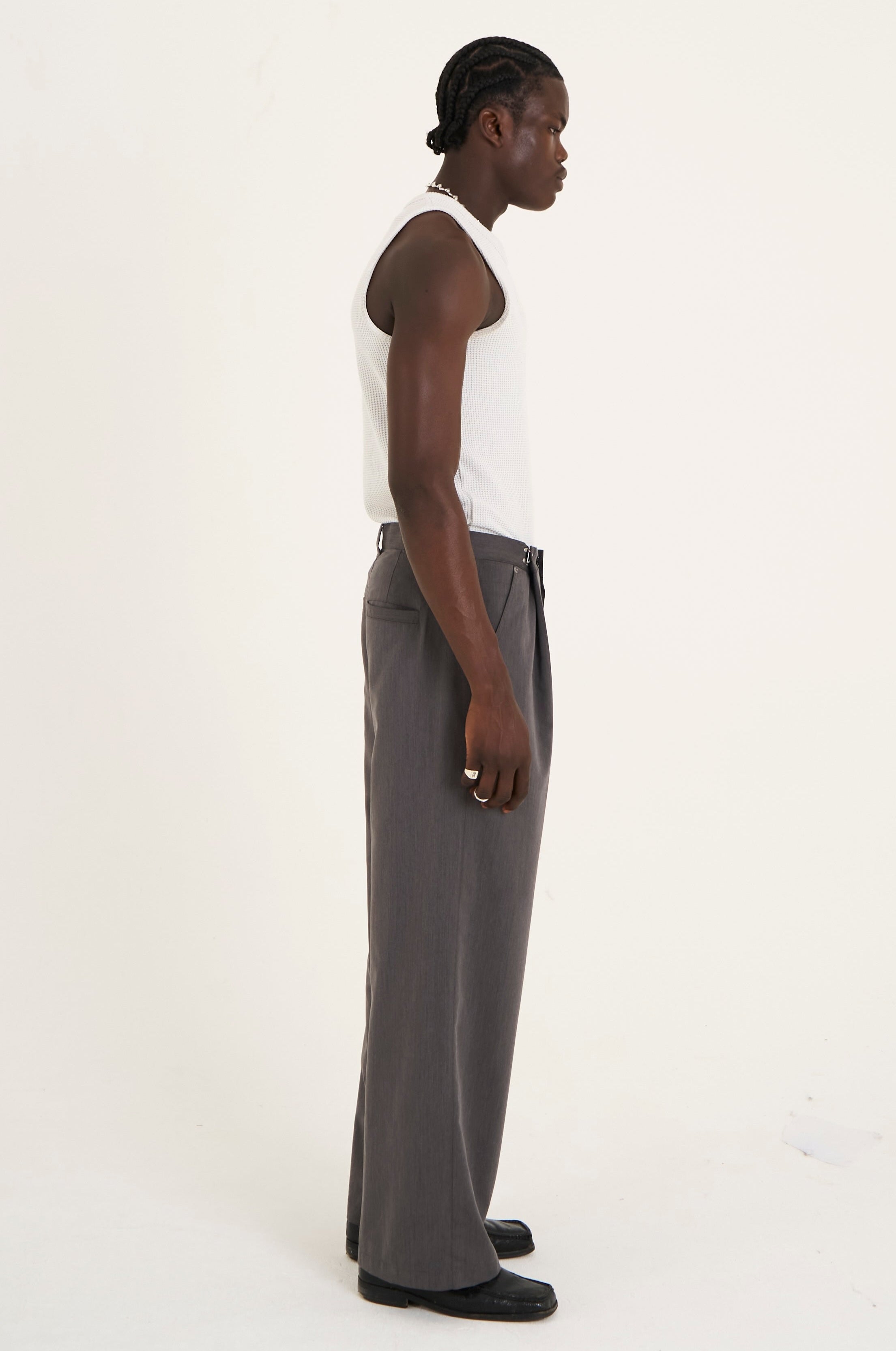 Relaxed fit tailored trousers with front pleat details, featuring silver piercing fastening for a grunge edge.