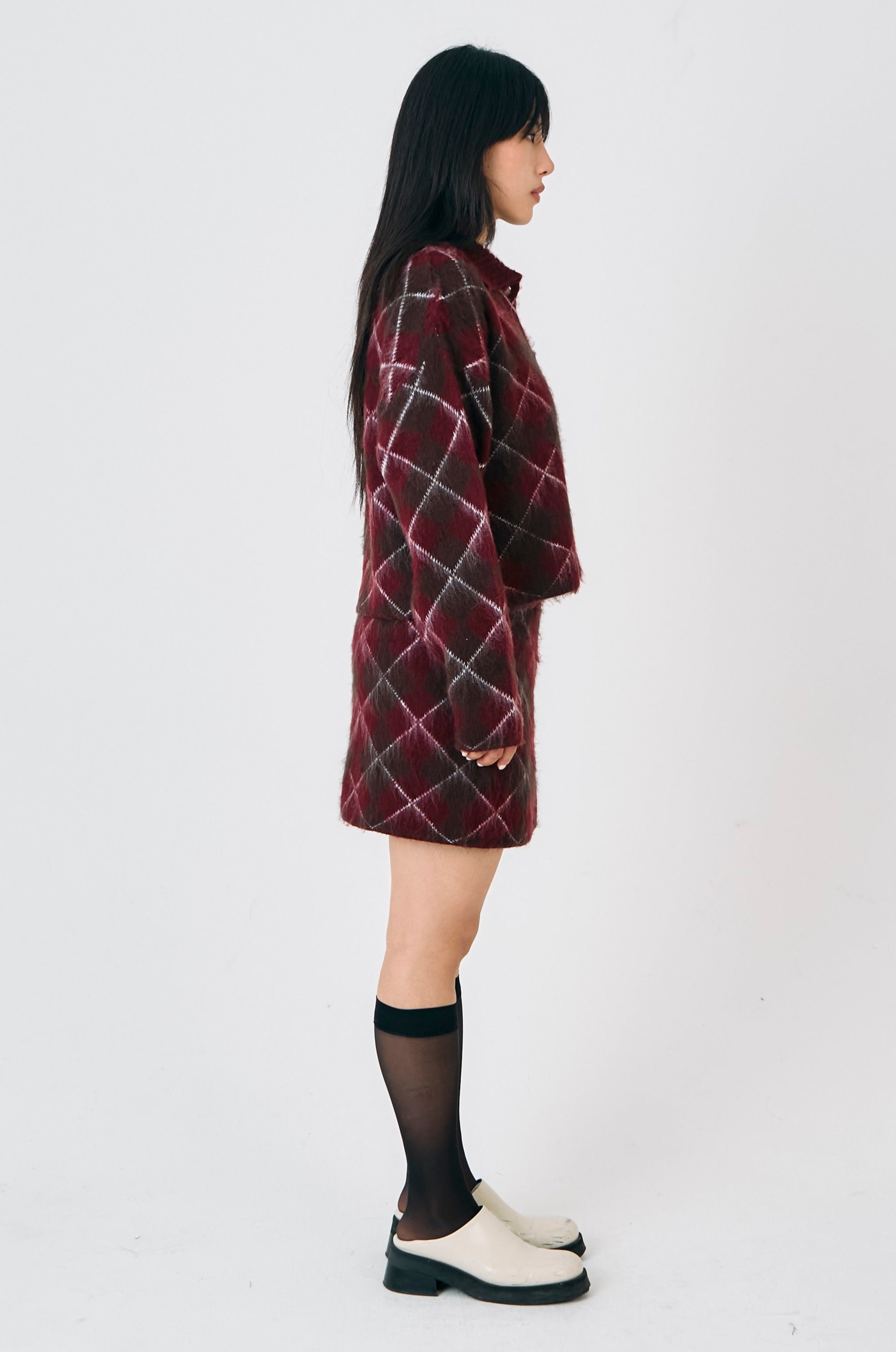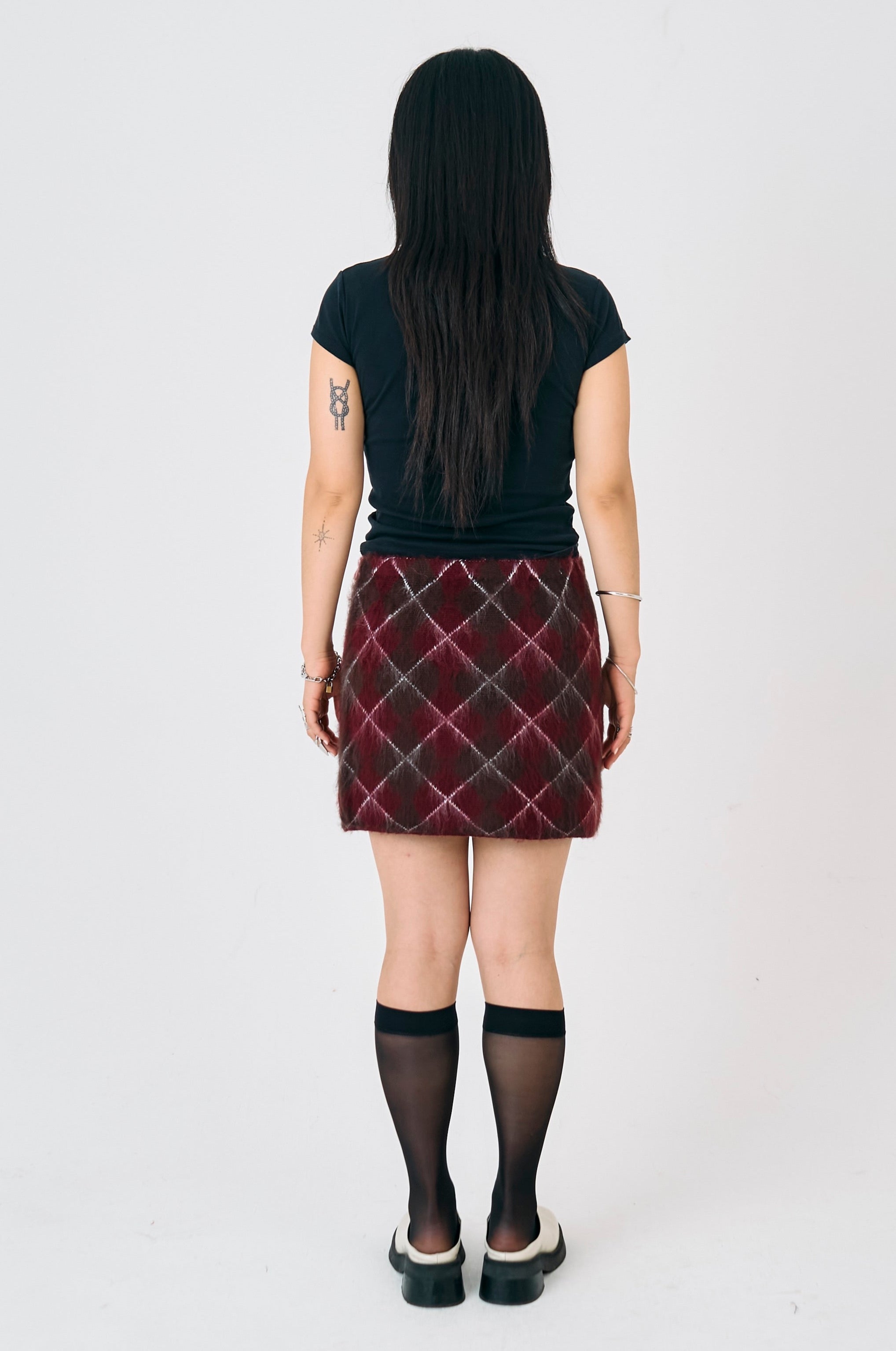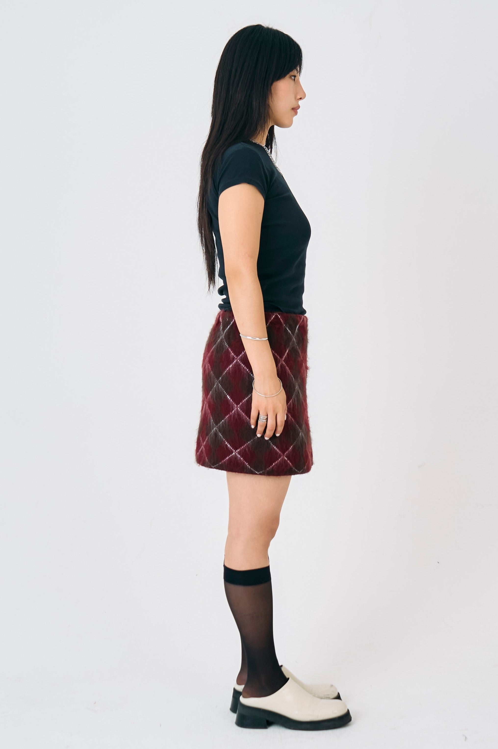 Burgundy argyle check knitted mini skirt featuring a split hem and side button detail. Match with our Manor Knit to make a statement.
