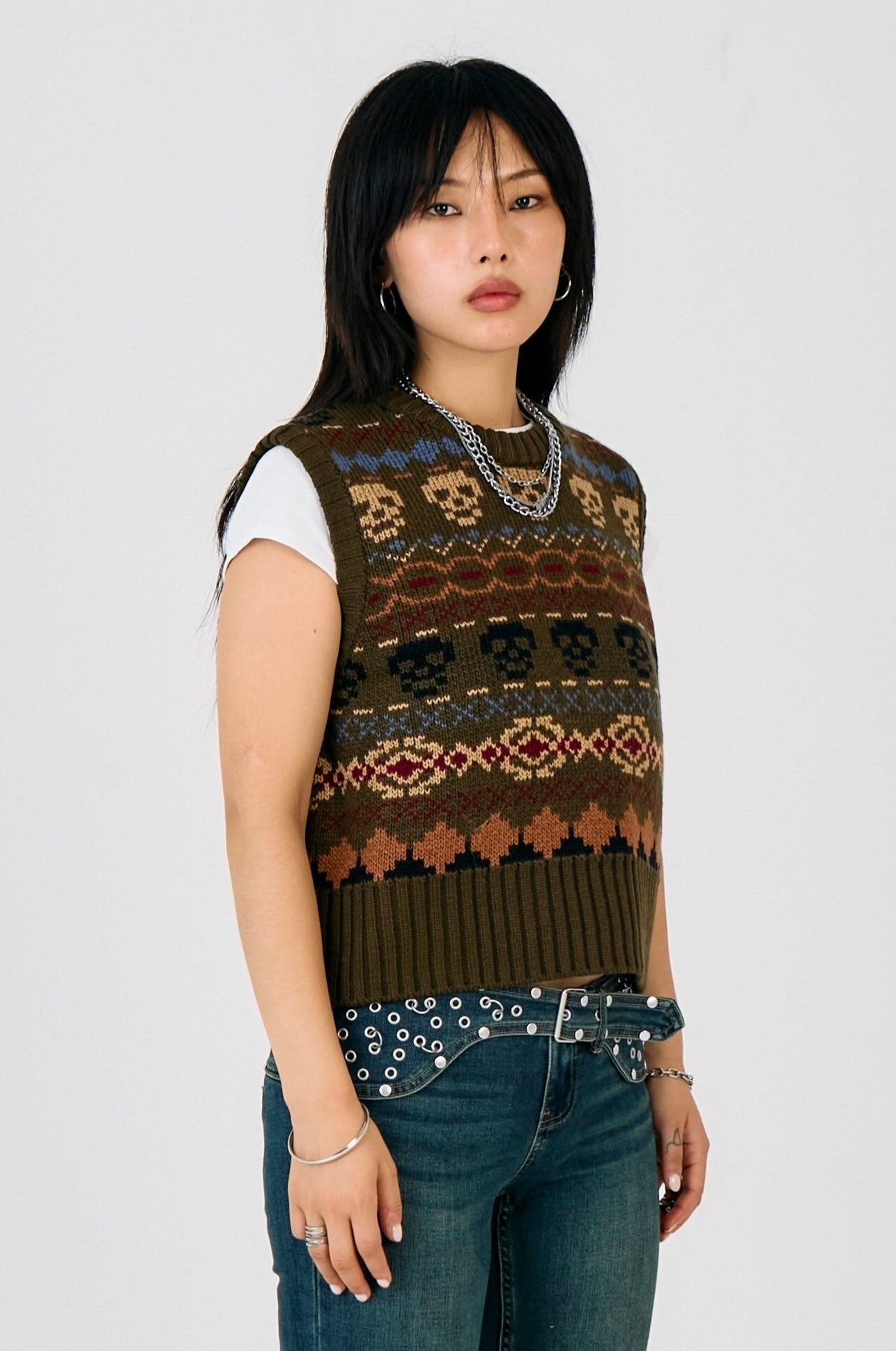 Shrunken knit vest with our grunge take on a classic fair isle, featuring skull pattern.