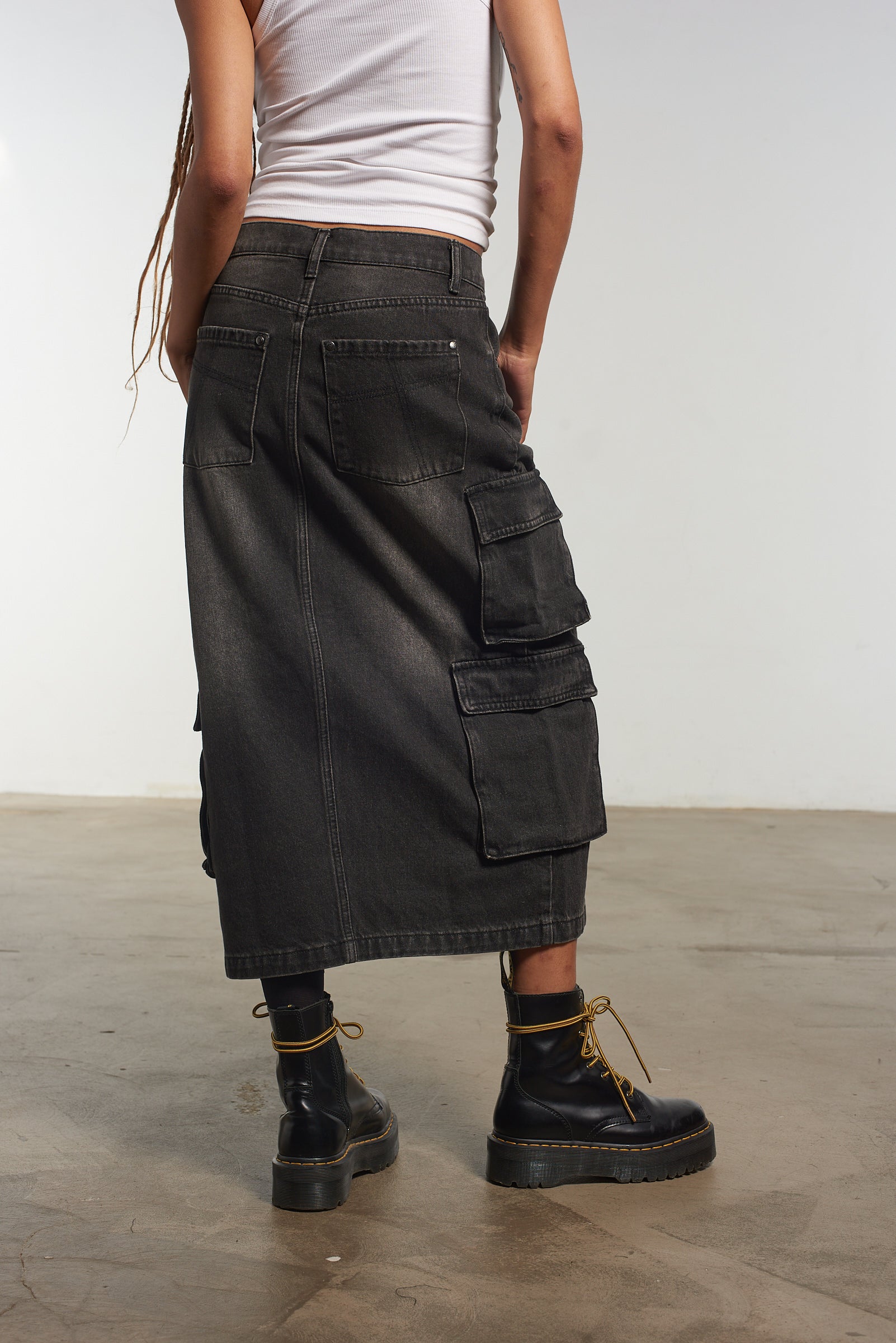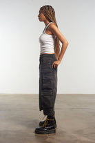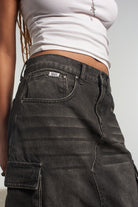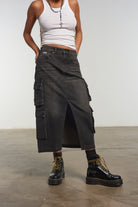 The Ragged Priest charcoal denim midi length combat skirt with side pockets and front split detail.