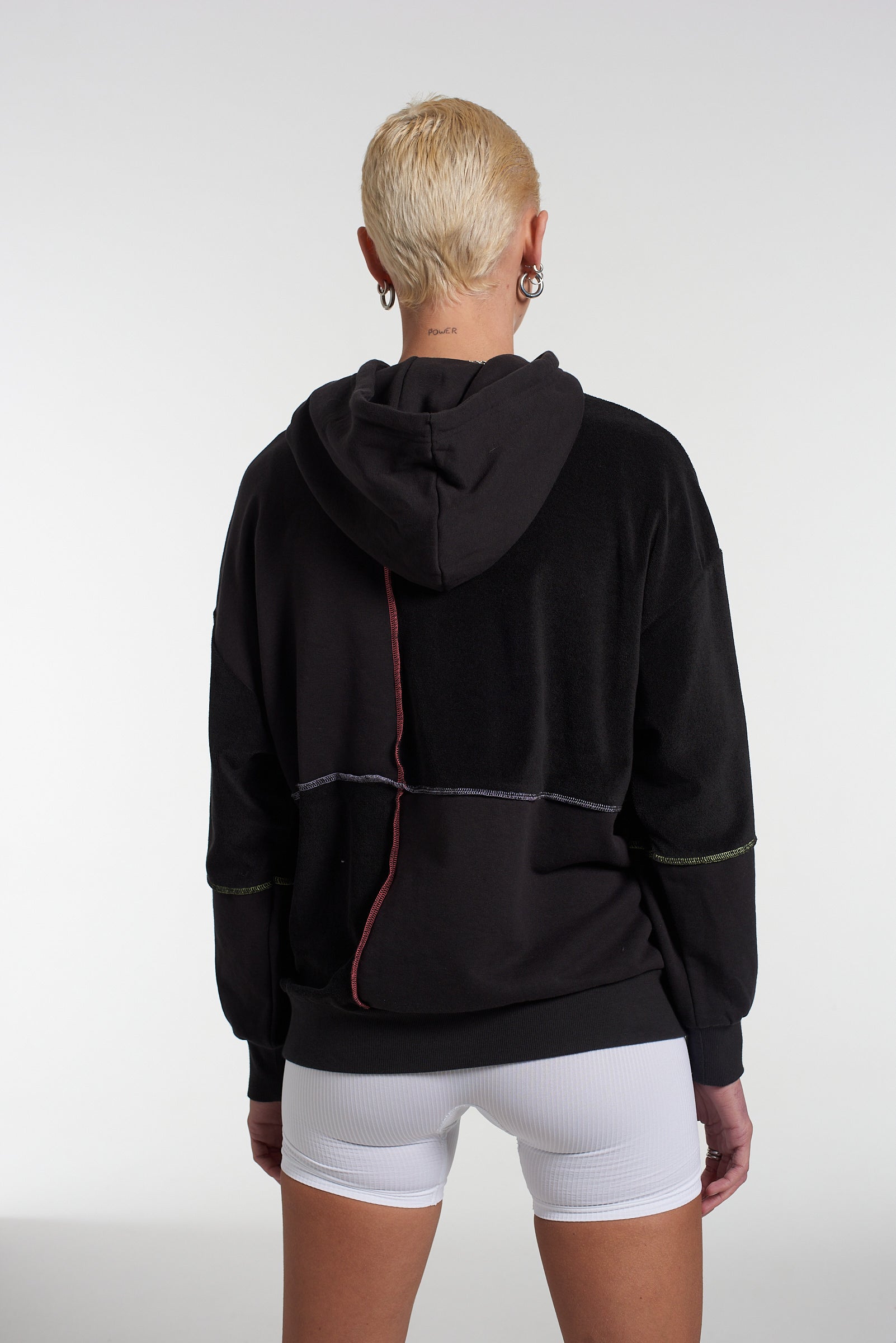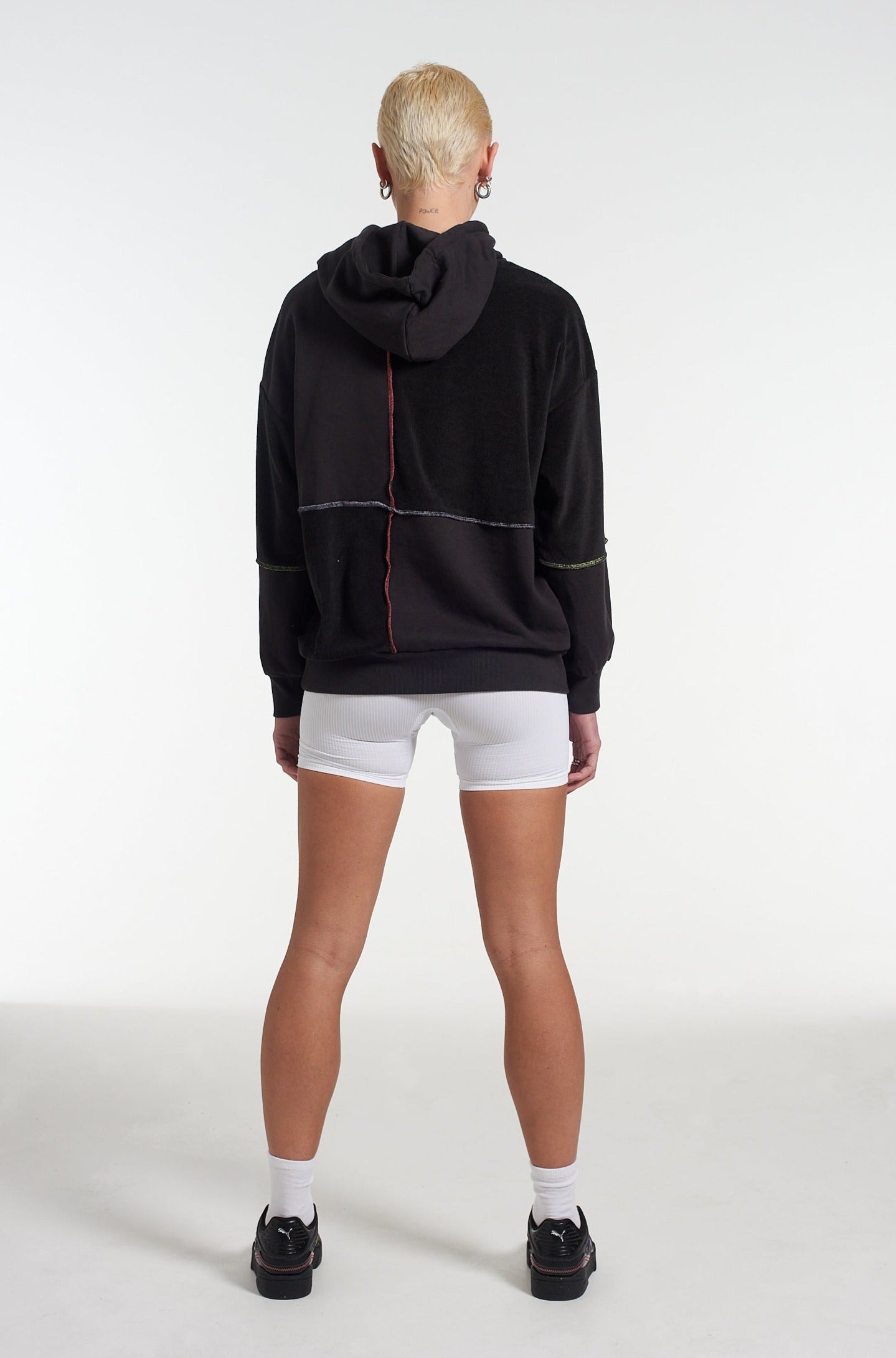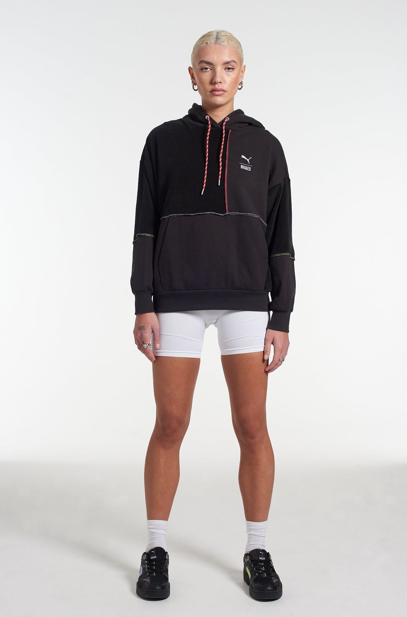 PUMA x The Ragged Priest black hoodie with panel construction Ft. contrast stitching embroidered logo. Ultimate wear anywhere off-duty hoodie. Limited edition exclusive collab where sportswear meets subculture.