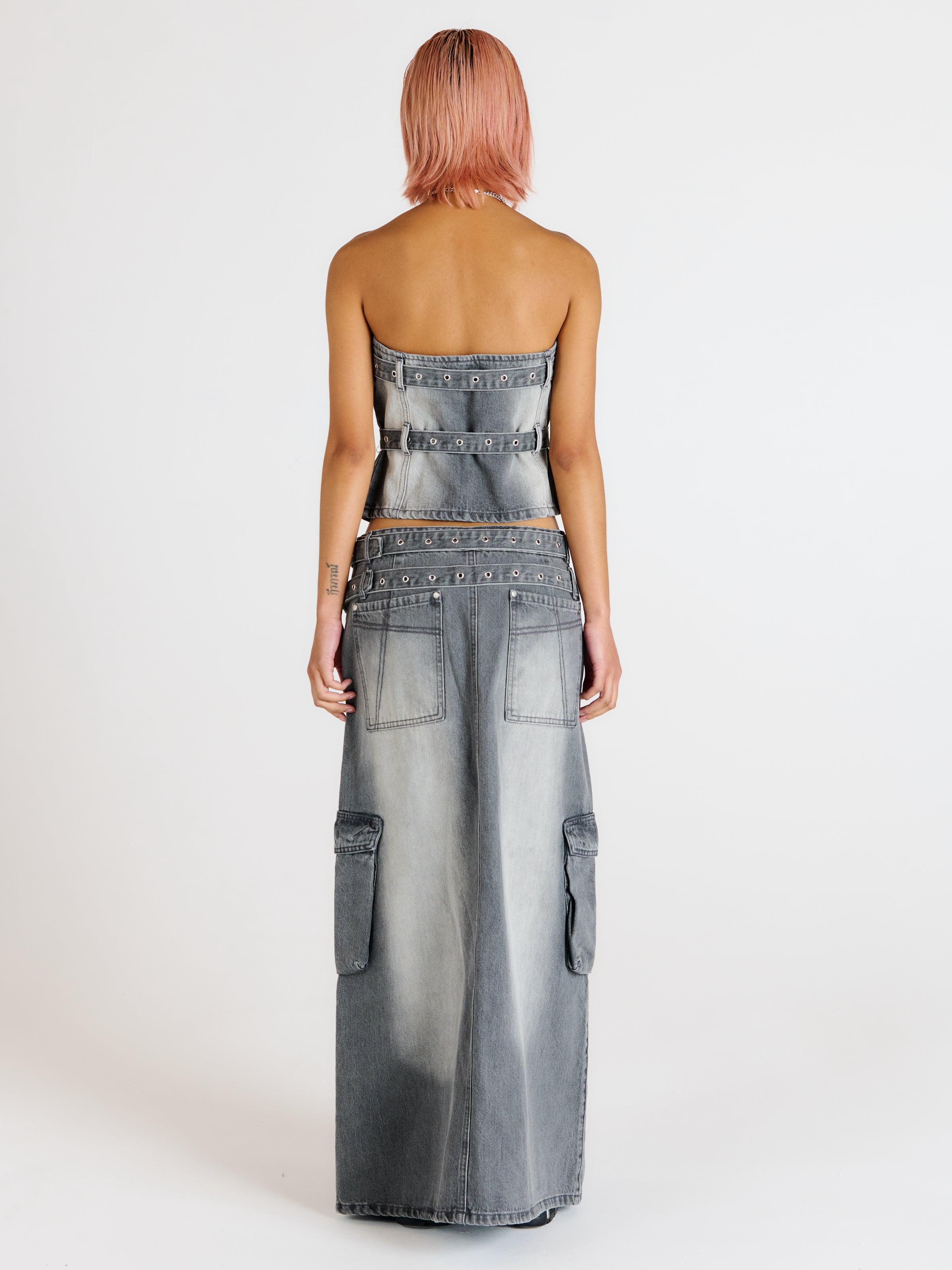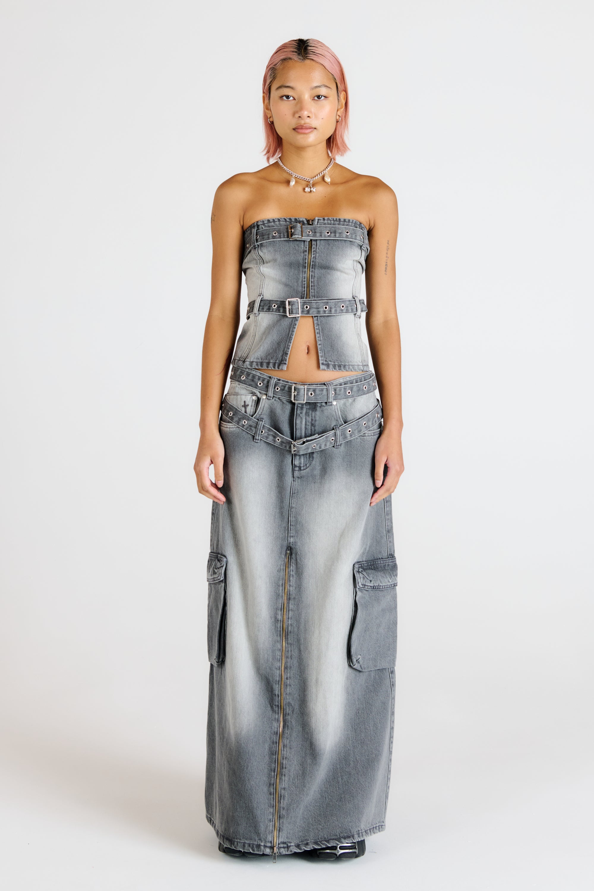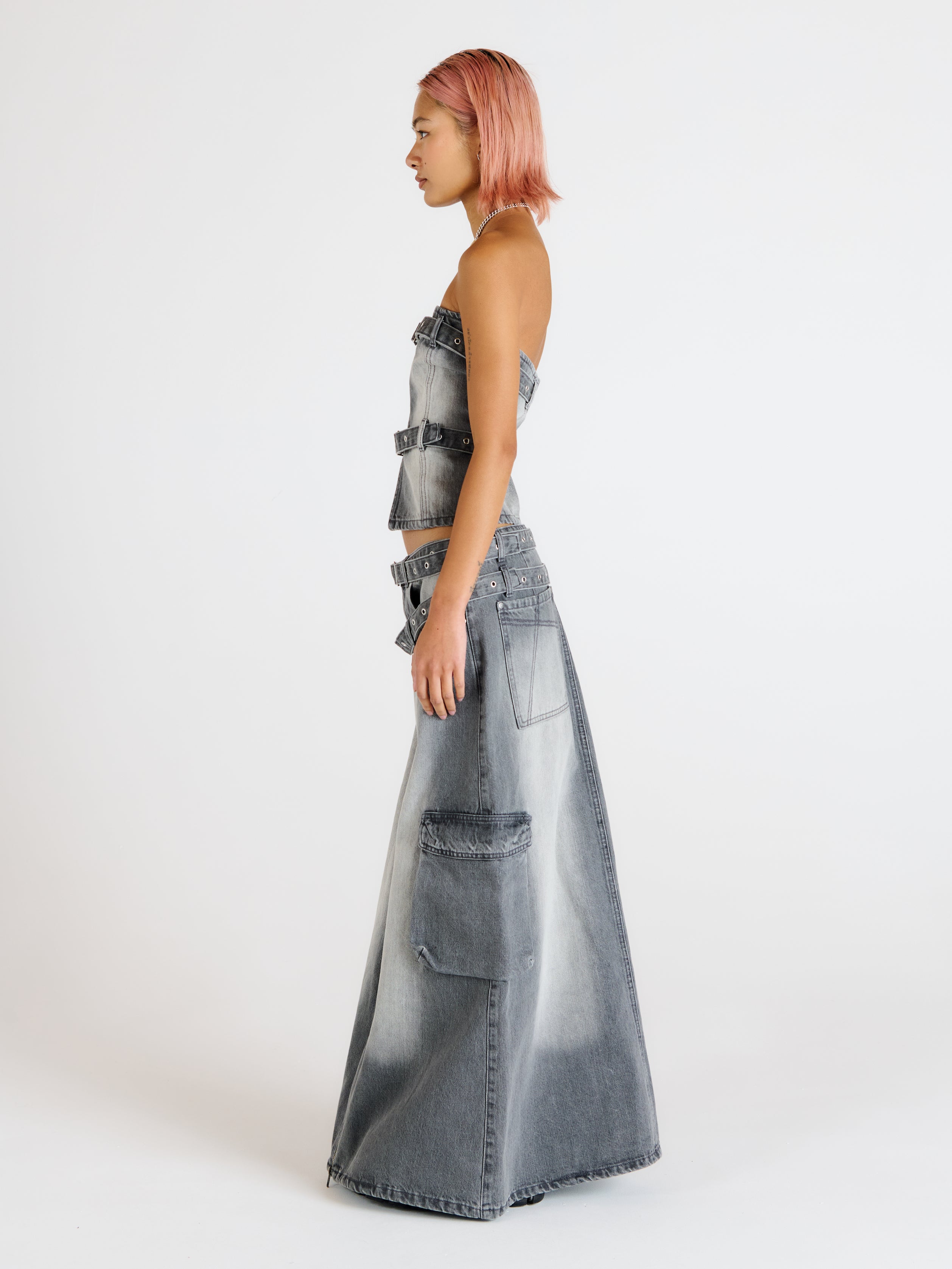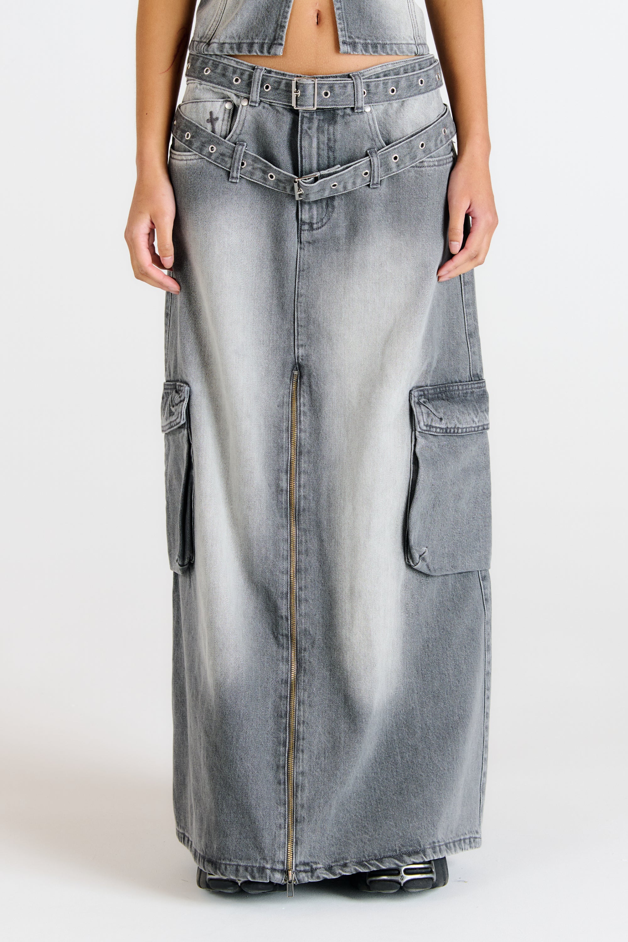 Charcoal grey denim cargo maxi skirt with double buckle belt and side pockets