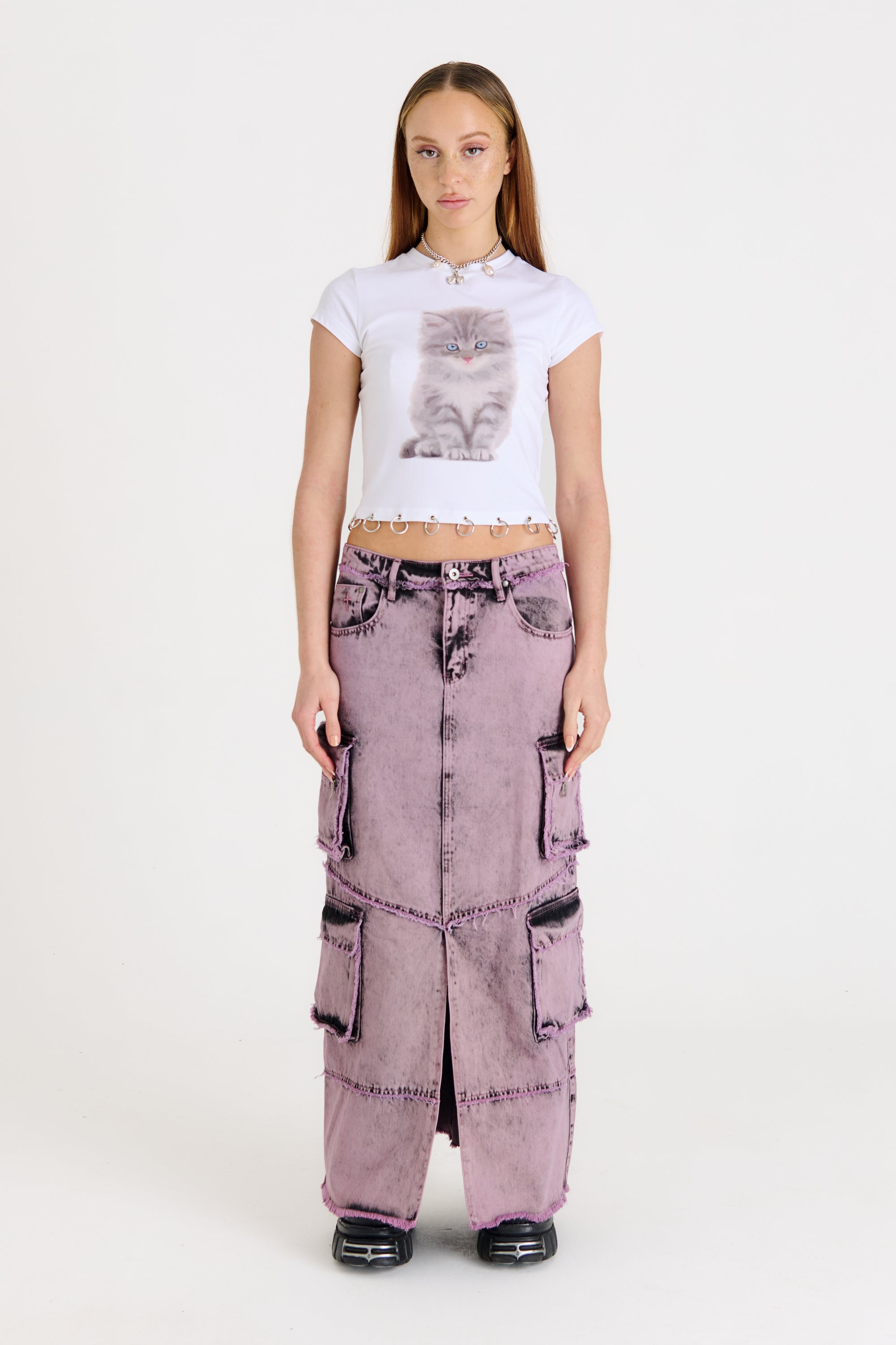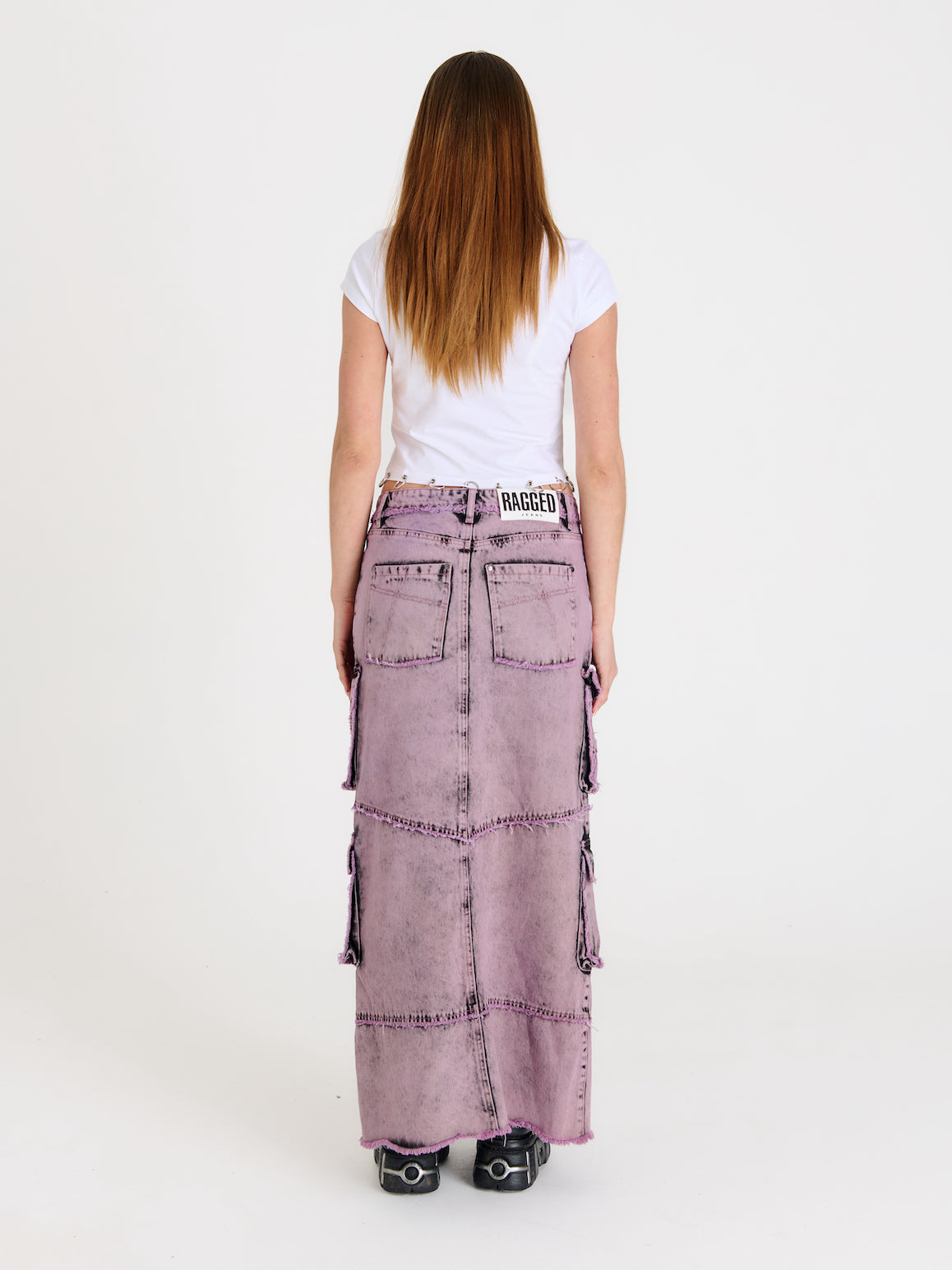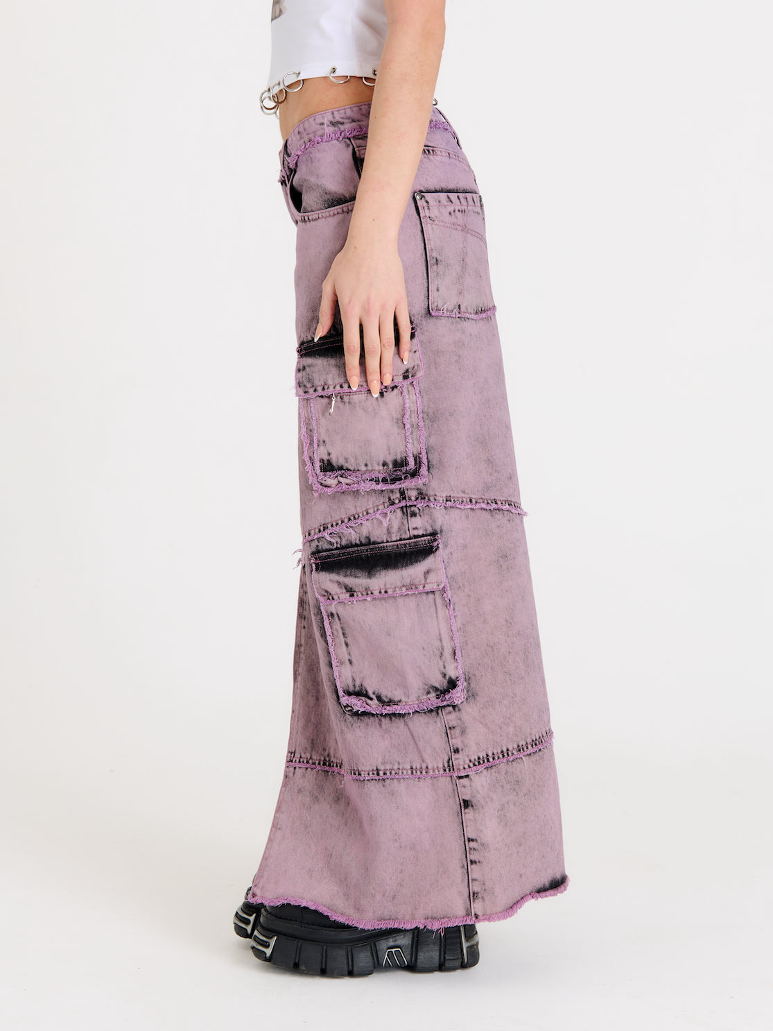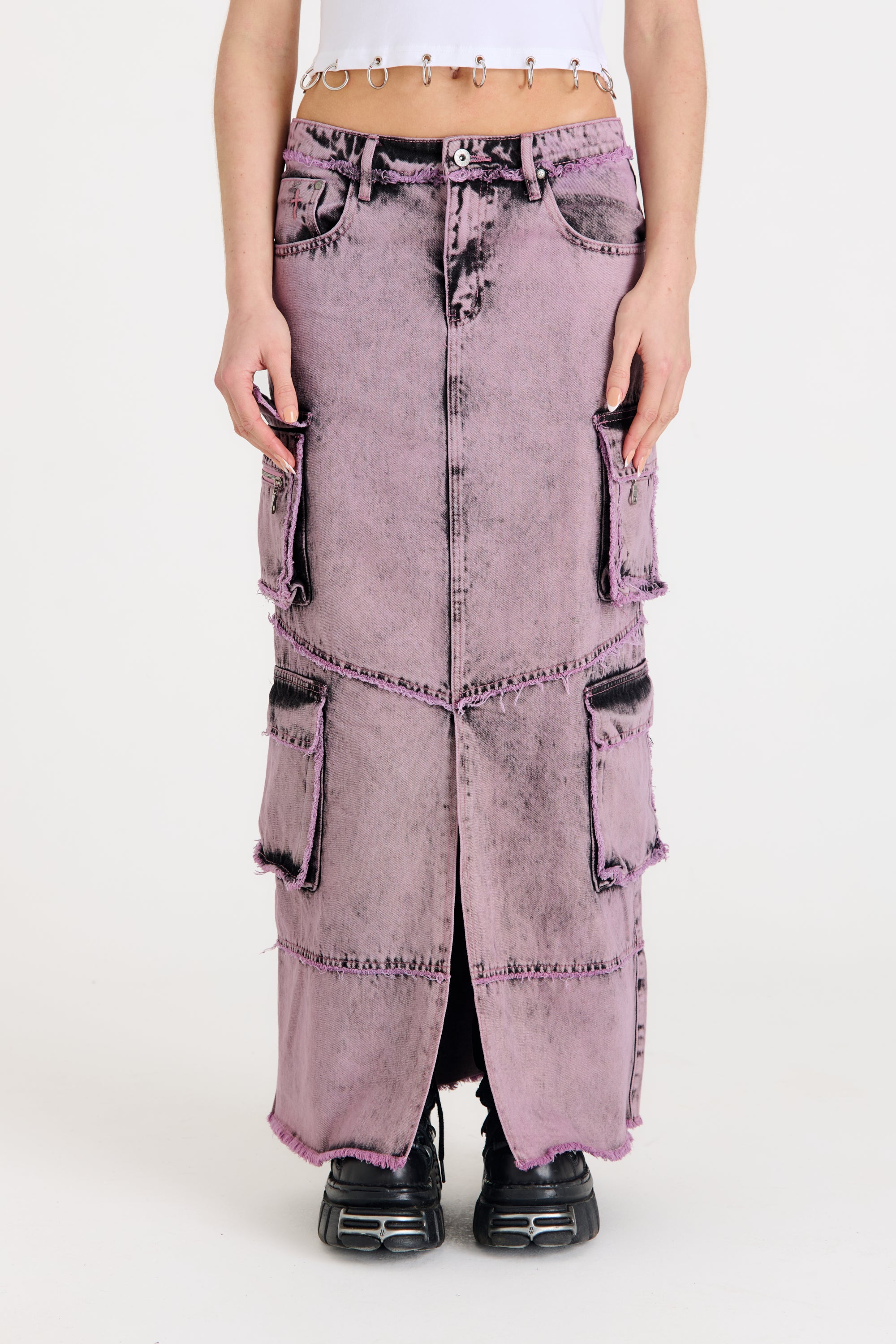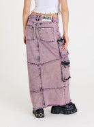 Dreamscape collection: Acid pink layered denim maxi skirt with cargo side pockets and front split